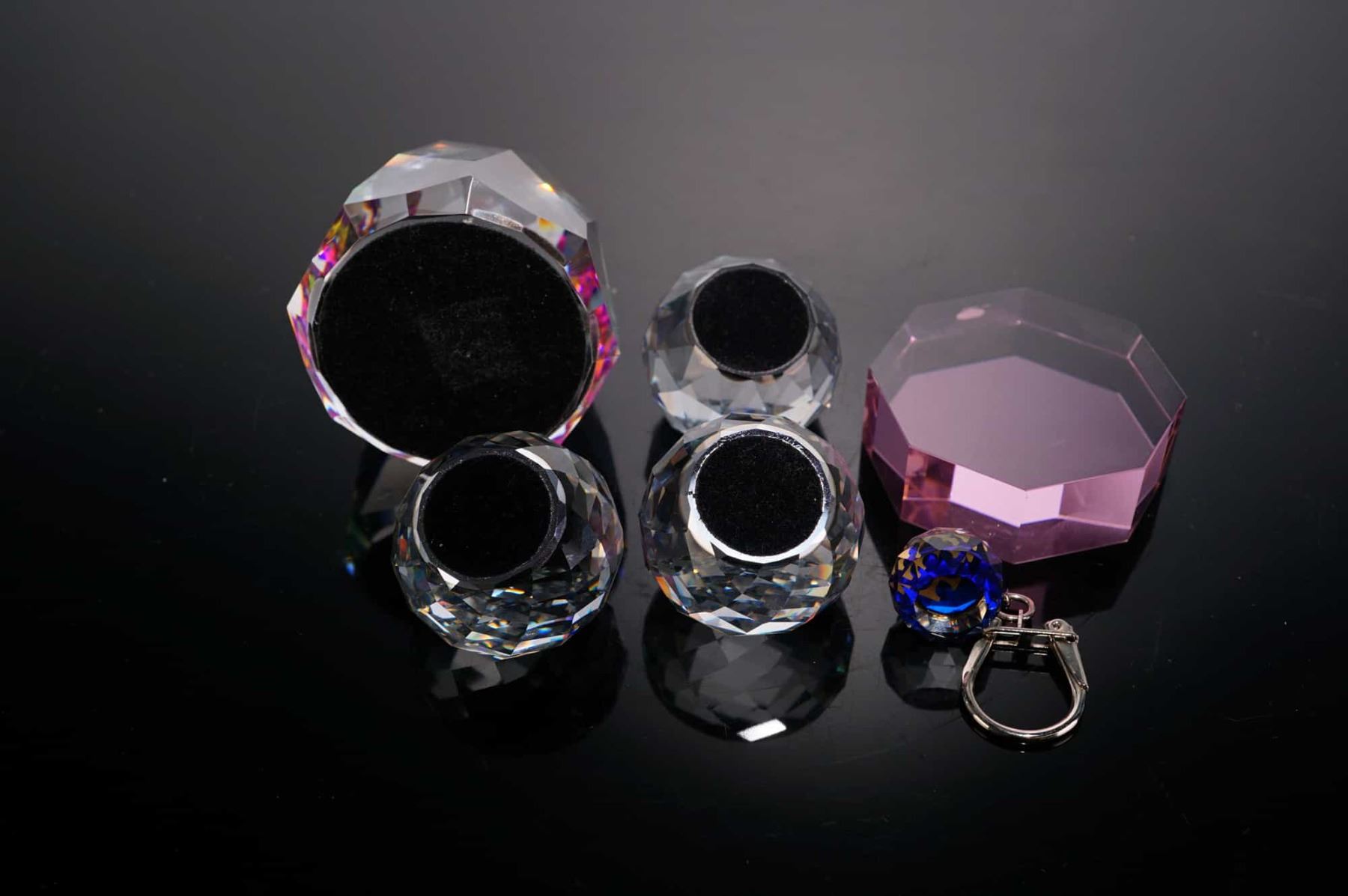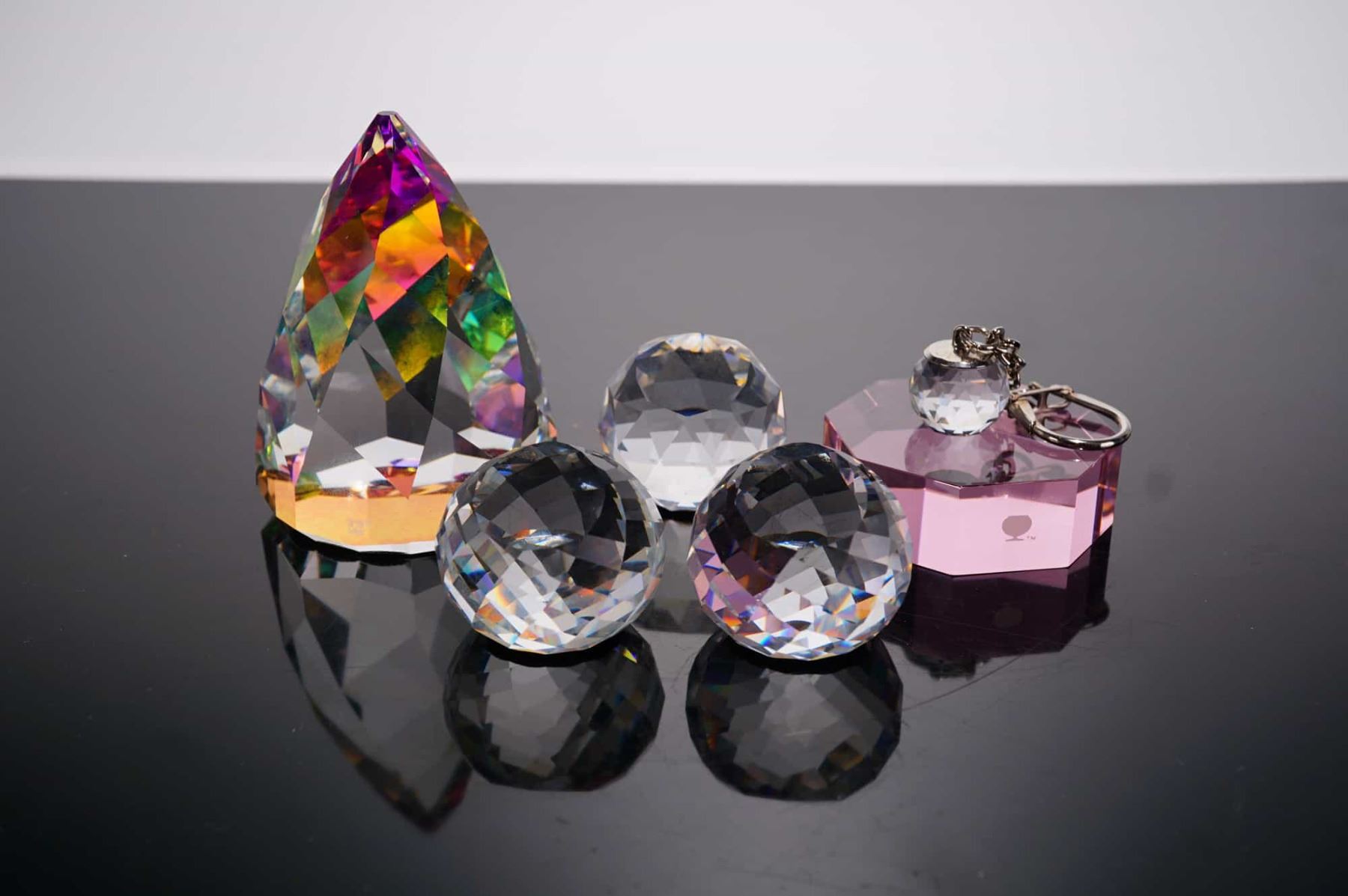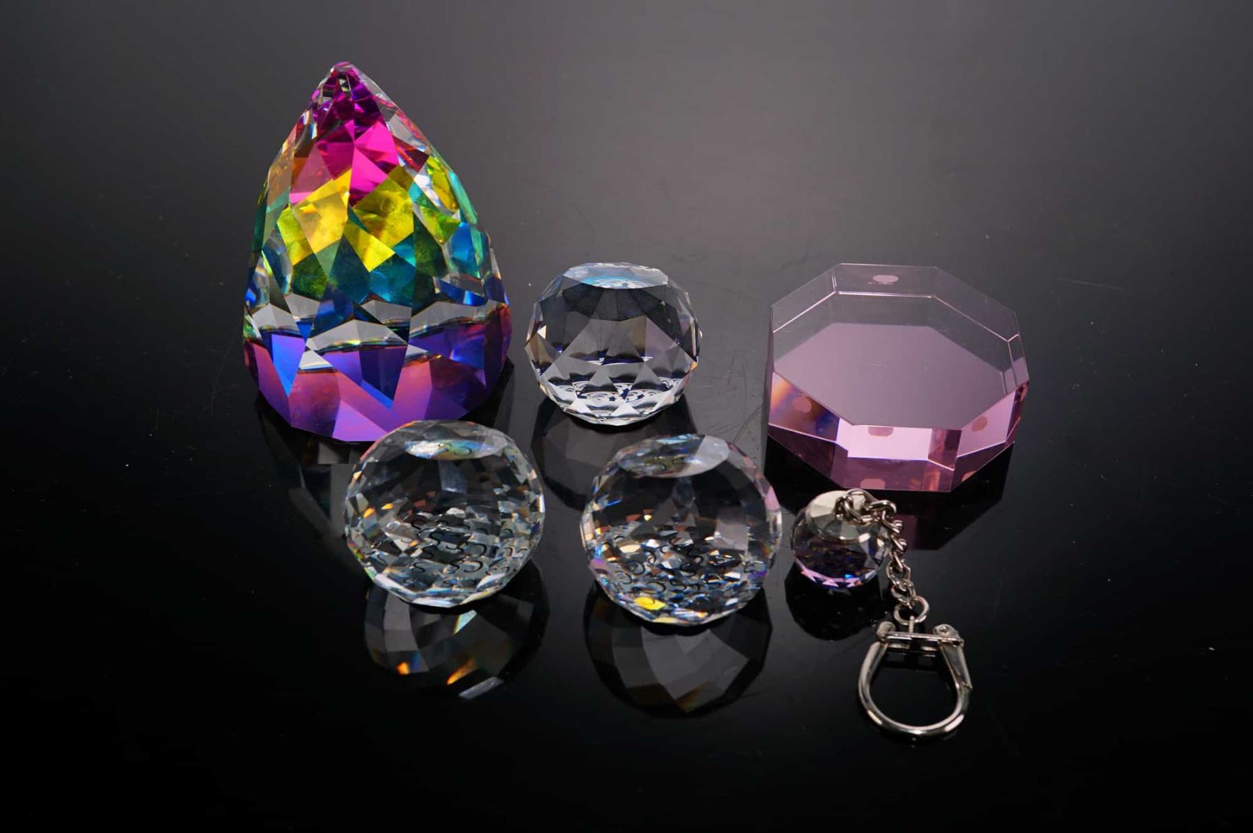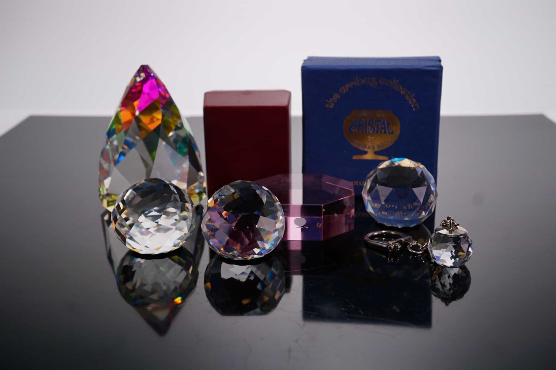 This collection of high-quality faceted lead crystal decorative items features pieces attributed to and marked by Arribas Brothers. The set includes three spherical paperweights with precision machine-cut geometric facets designed to maximize light refraction and fire. Also included is a large teardrop-shaped crystal paperweight finished with a vibrant Aurora Borealis coating, creating a multi-colored rainbow effect. A pink-tinted octagonal crystal display block is included, which features the etched Arribas Brothers goblet logo on the side. The collection is completed by a small faceted crystal keychain with a blue-coated base. These items are crafted from lead crystal with a high refractive index, resulting in exceptional clarity and brilliance. The lot is accompanied by one original blue presentation box marked for the Arribas collection and one additional maroon box. Teardrop height: 3.5 inches; Spheres diameter: 2 inches; Octagonal block width: 3 inches.