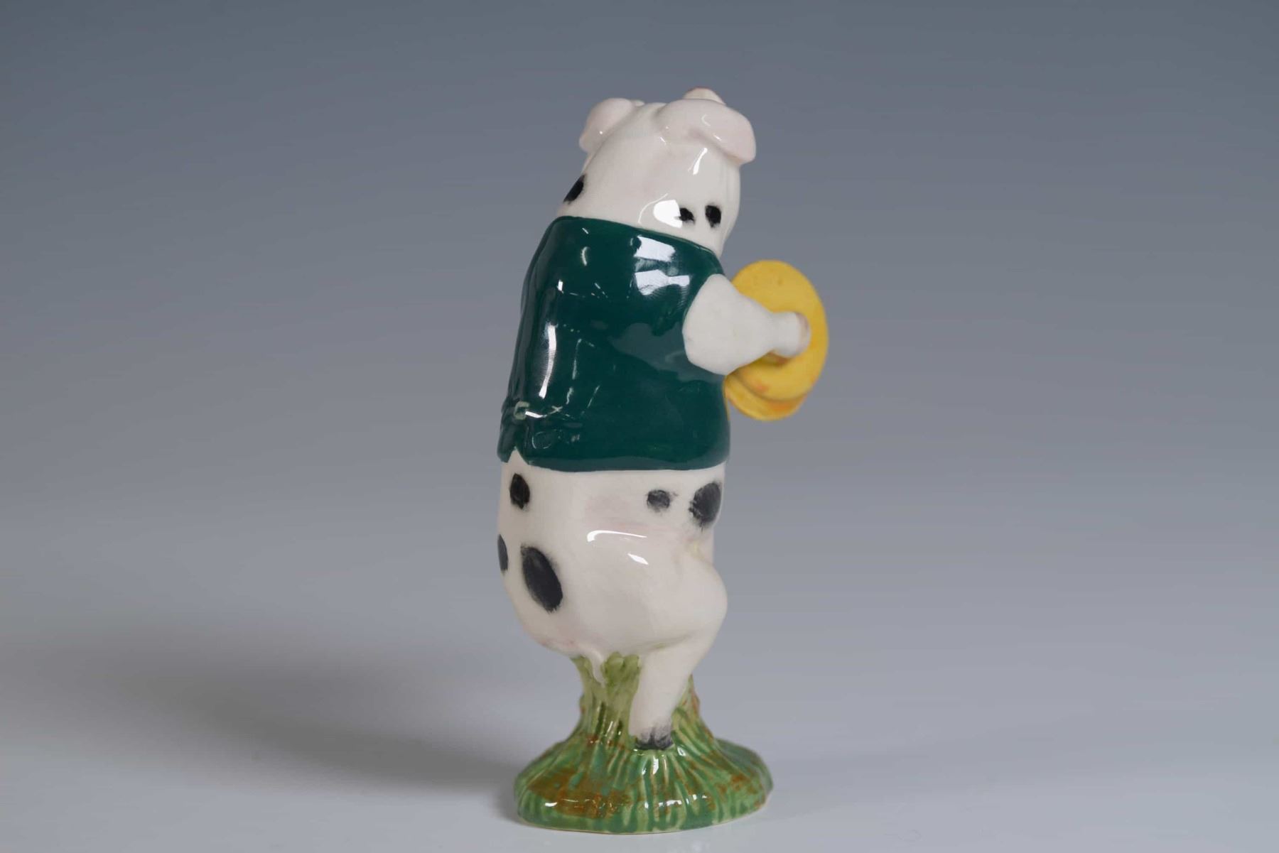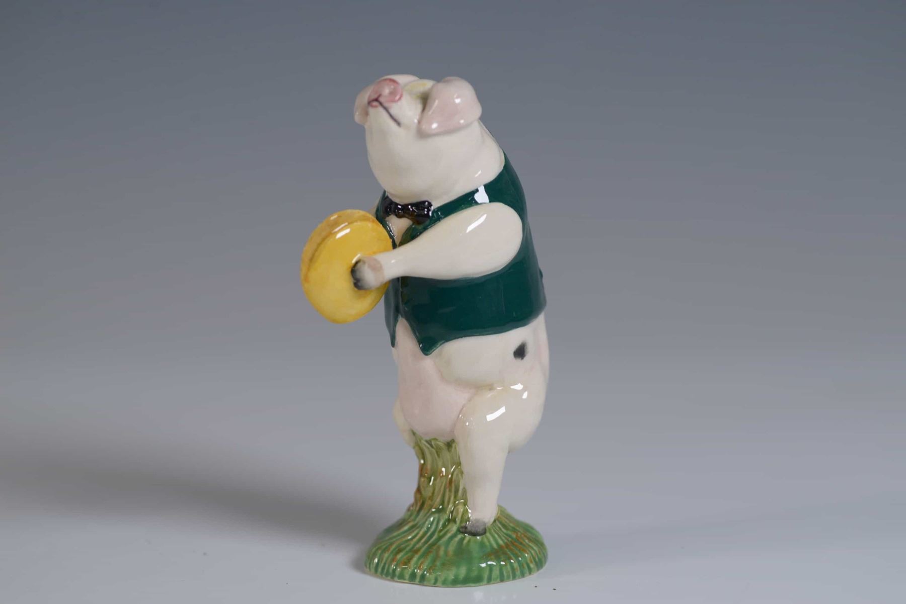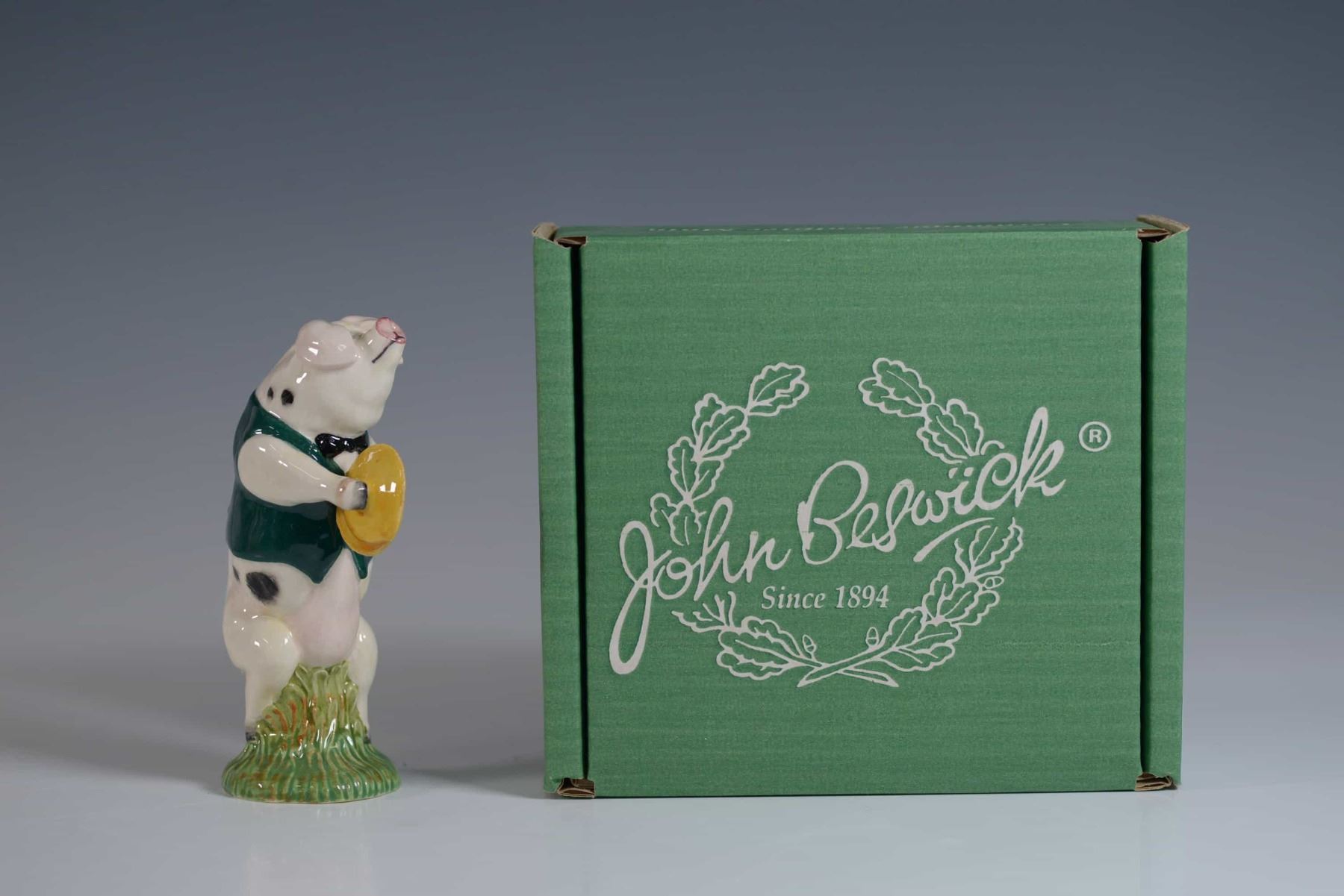 Charming Beswick by Royal Doulton porcelain figurine titled George Cymbalist, model PP10. This delightful hand-painted piece features a standing pig dressed in a green waistcoat and bow tie, holding a yellow cymbal. Marked on the base with the Beswick backstamp. The figurine stands 5.25"H and comes with its original green John Beswick box, measuring 7"L x 6"W x 3"H. A wonderful addition to any collection of Beswick or Royal Doulton figurines.