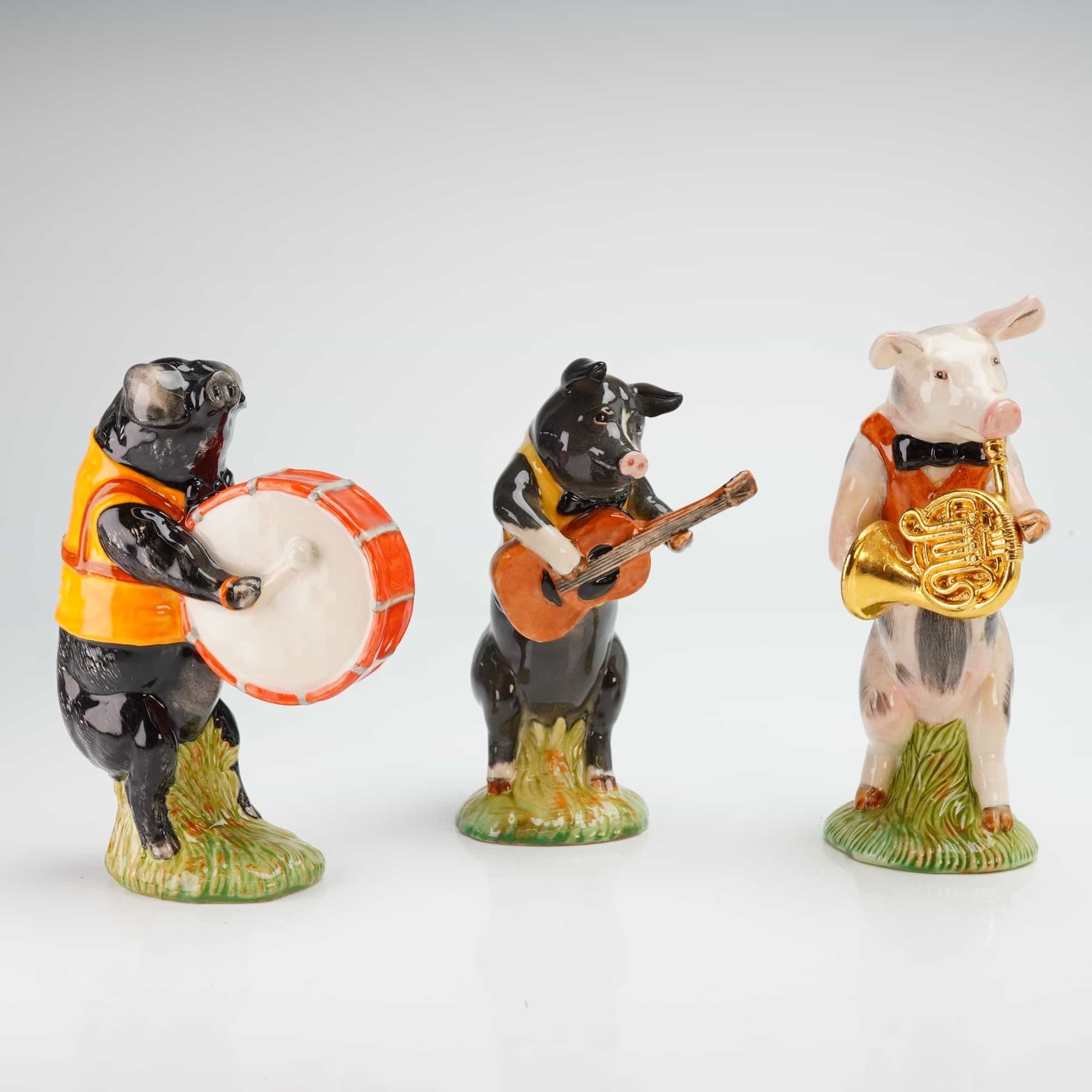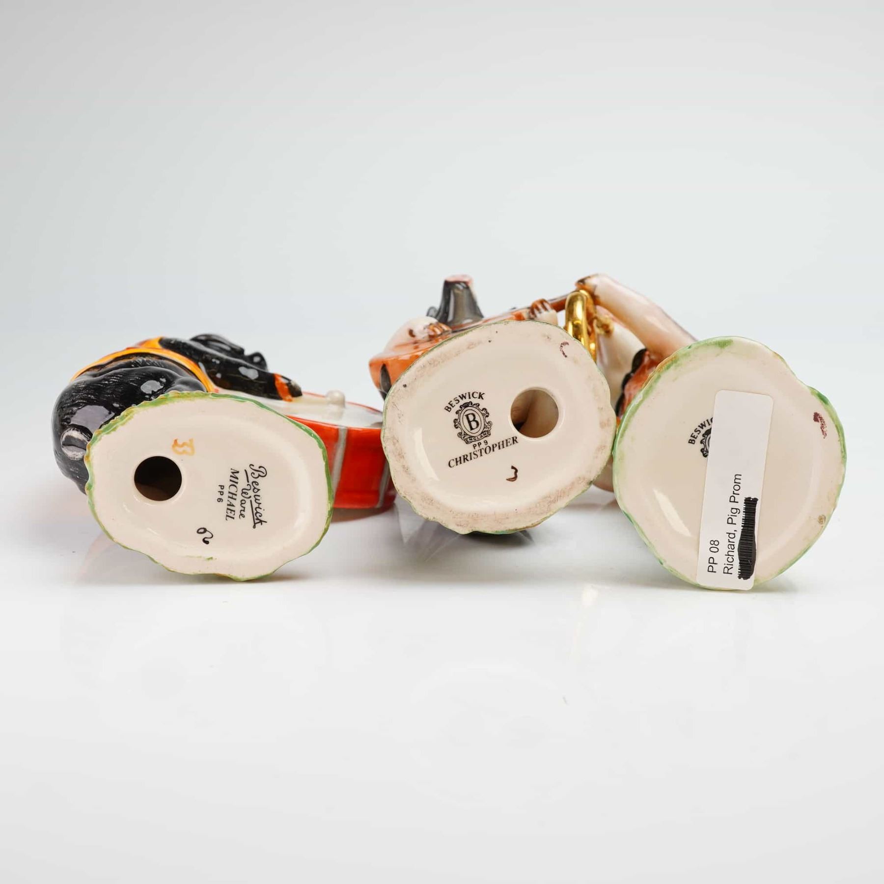 The collection featuring anthropomorphic pigs playing instruments. The group includes Michael (PP 6) with a bass drum, Christopher (PP 9) with an acoustic guitar, and Richard (PP 08) with a gilt-detailed French horn. Each hand-painted figure is finished in a high-gloss glaze and stands on a circular, grass-textured base. The pigs are depicted in various colored waistcoats and bow ties. The undersides bear official Beswick England backstamps along with specific model names and reference numbers.
