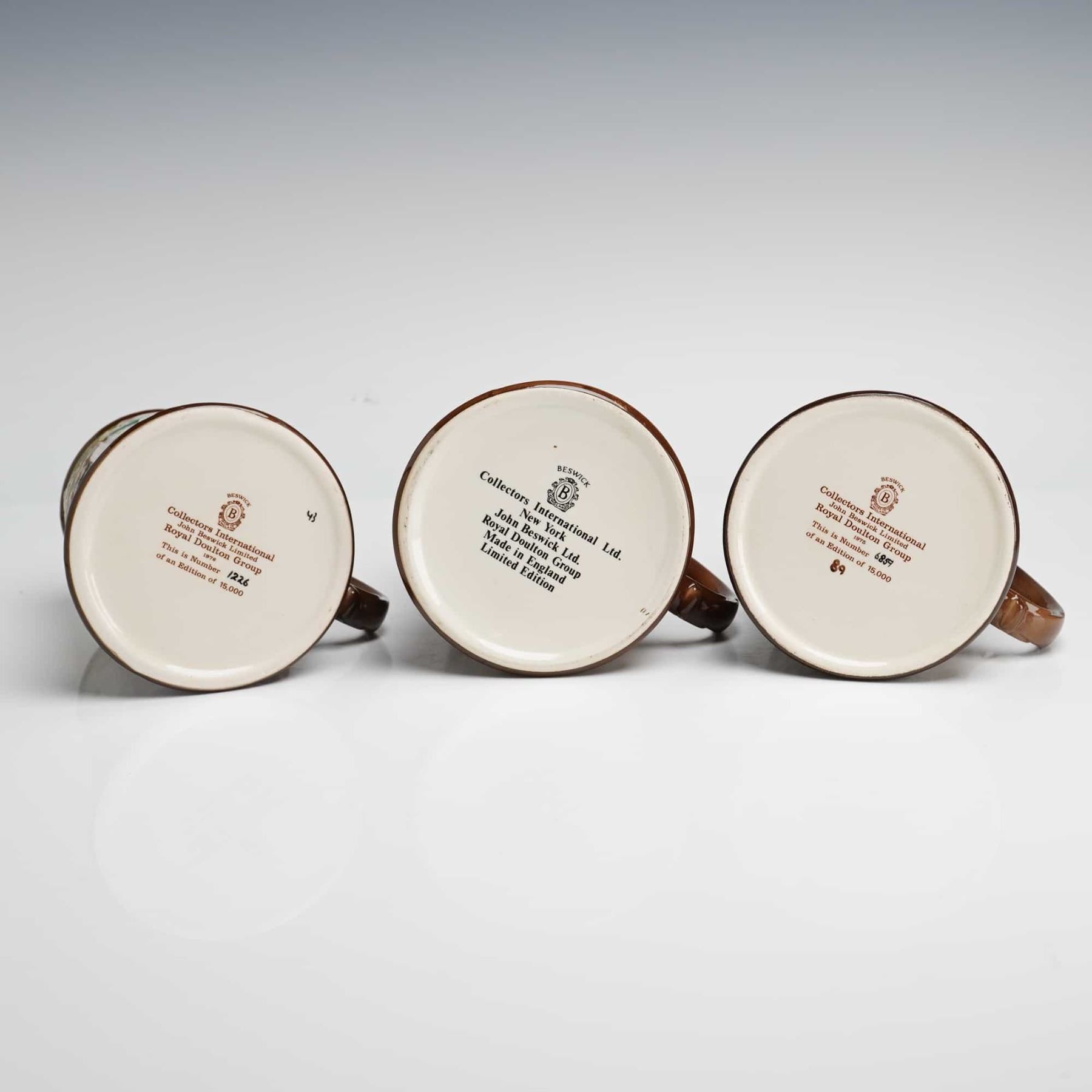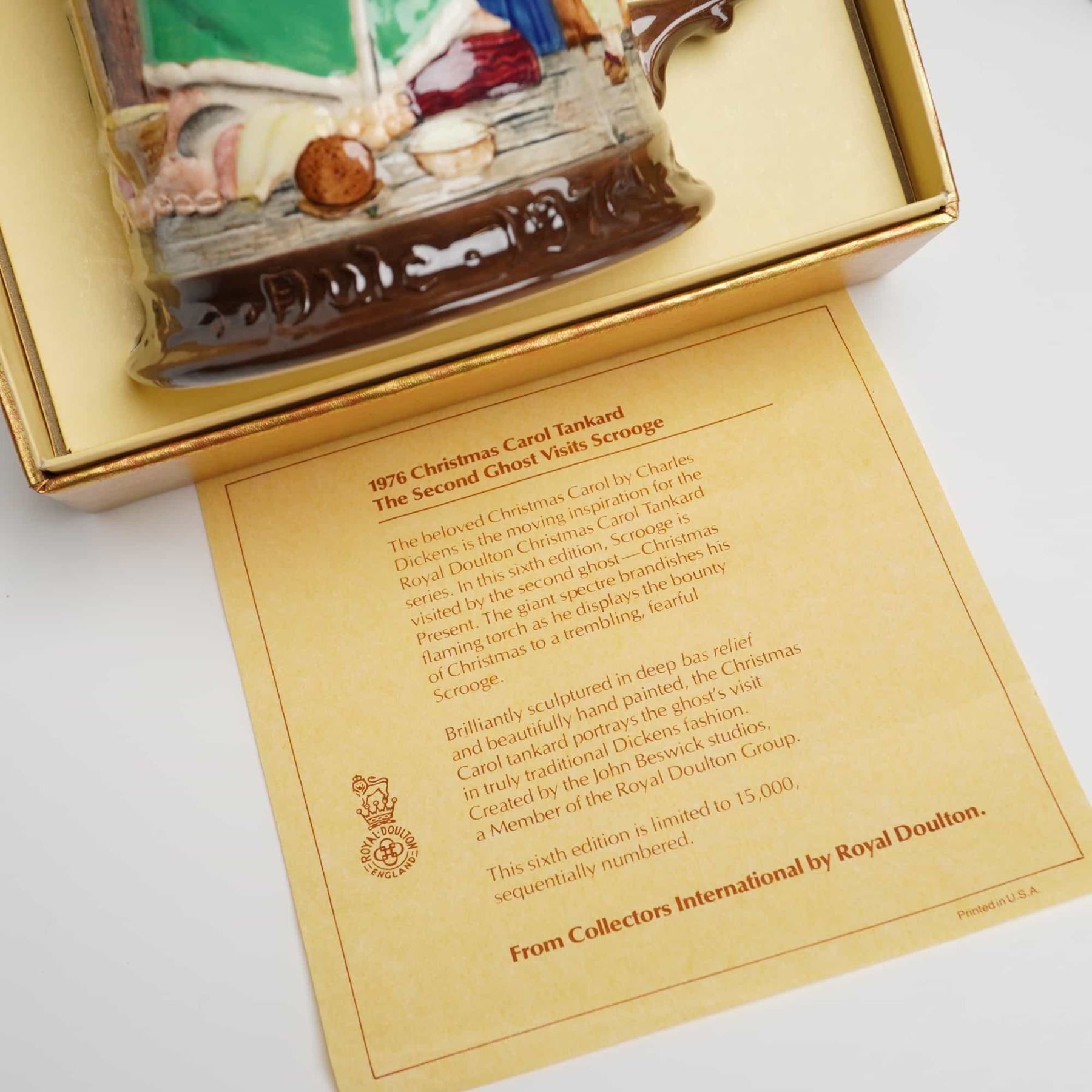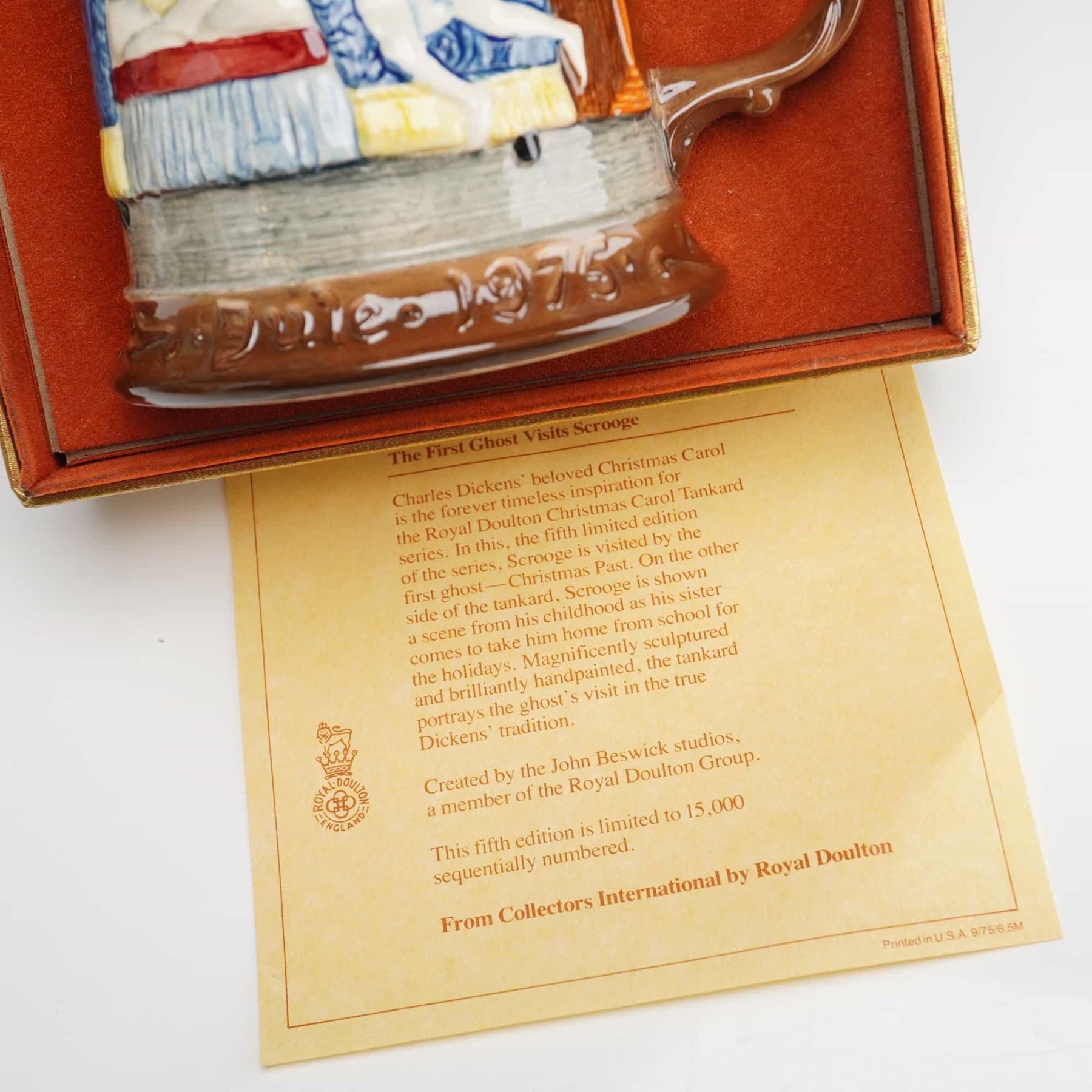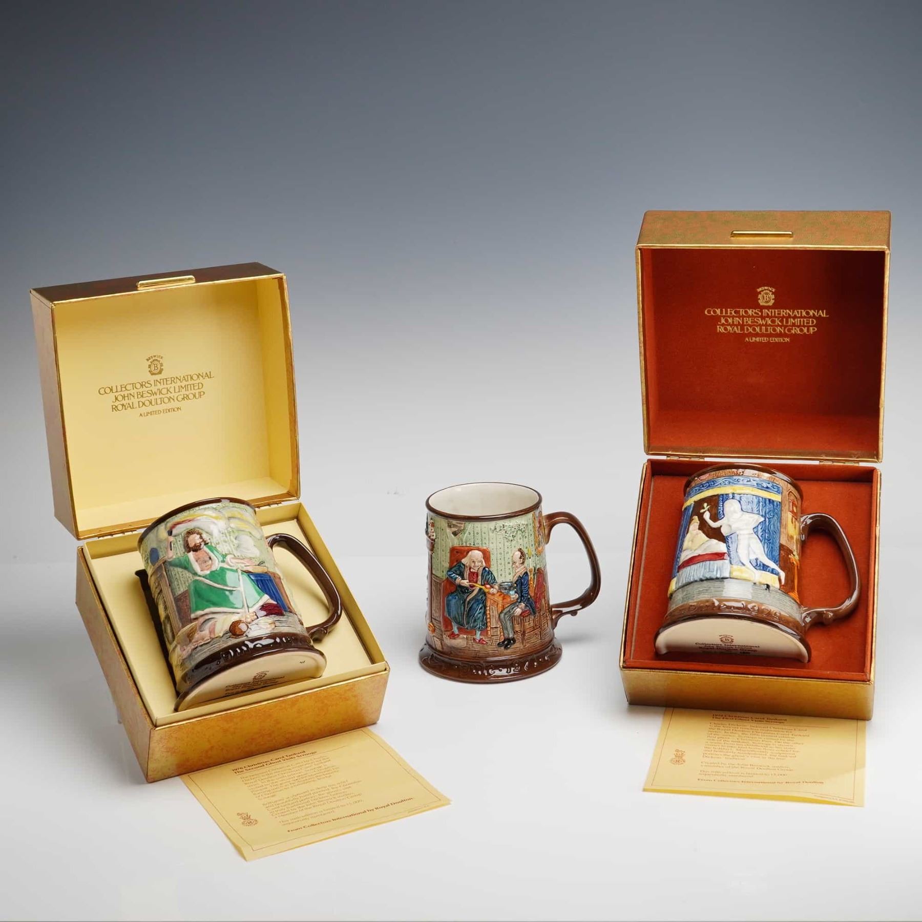 This trio of glazed ceramic tankards is from the Royal Doulton A Christmas Carol series, produced by John Beswick Limited for Collectors International Ltd. Each piece features hand-painted, bas-relief illustrations depicting scenes from the Charles Dickens classic. The collection includes specific examples dated 1974, 1975, and 1976. The bases bear official maker marks identifying them as part of the Royal Doulton Group, made in England. These items are limited editions, each sequentially numbered out of a total production of 15,000. Several pieces are presented in their original gold-tone, satin-lined display boxes and are accompanied by descriptive authentication inserts detailing the specific series edition. The tankards are constructed with a flared base and a single scroll handle, featuring deep relief sculptural details.