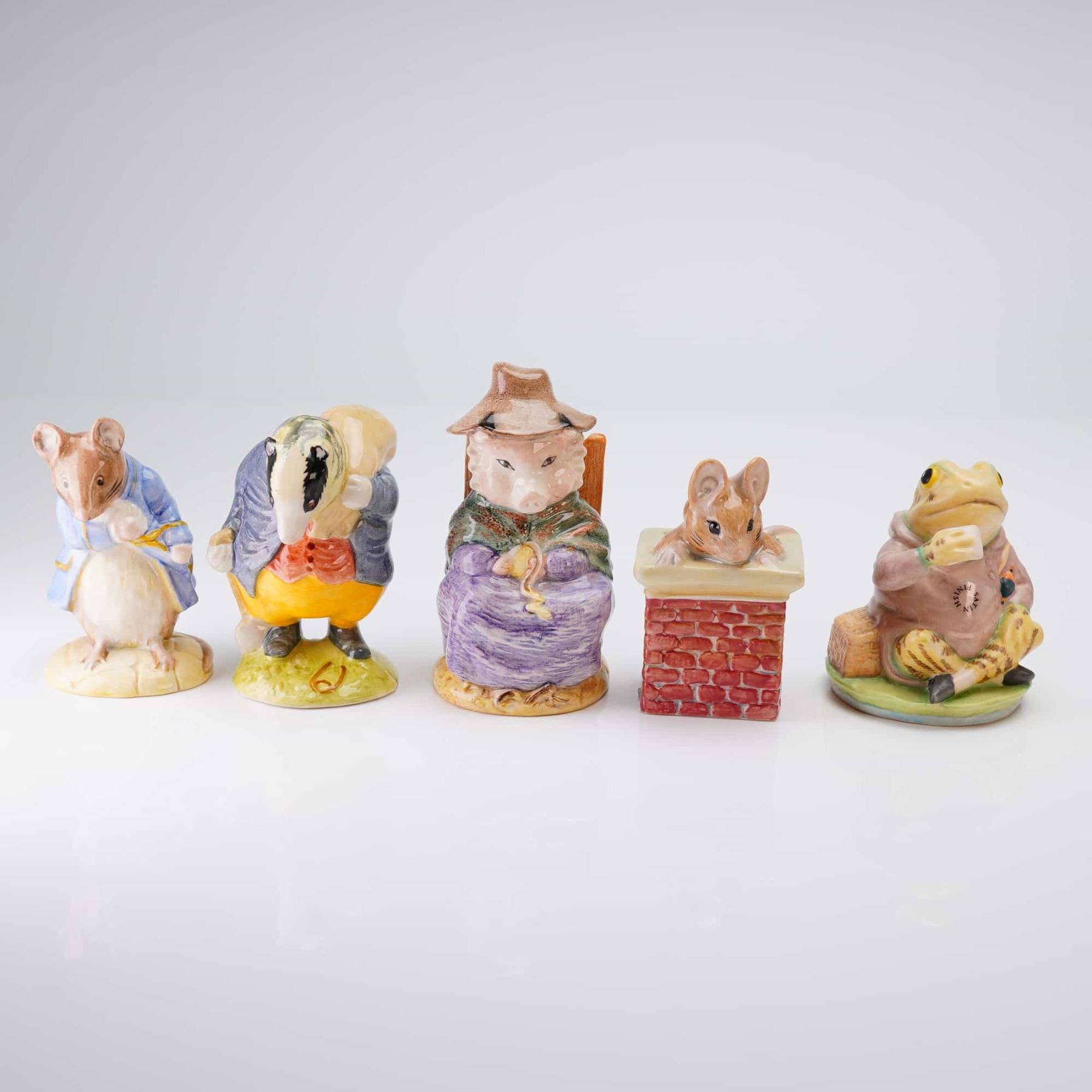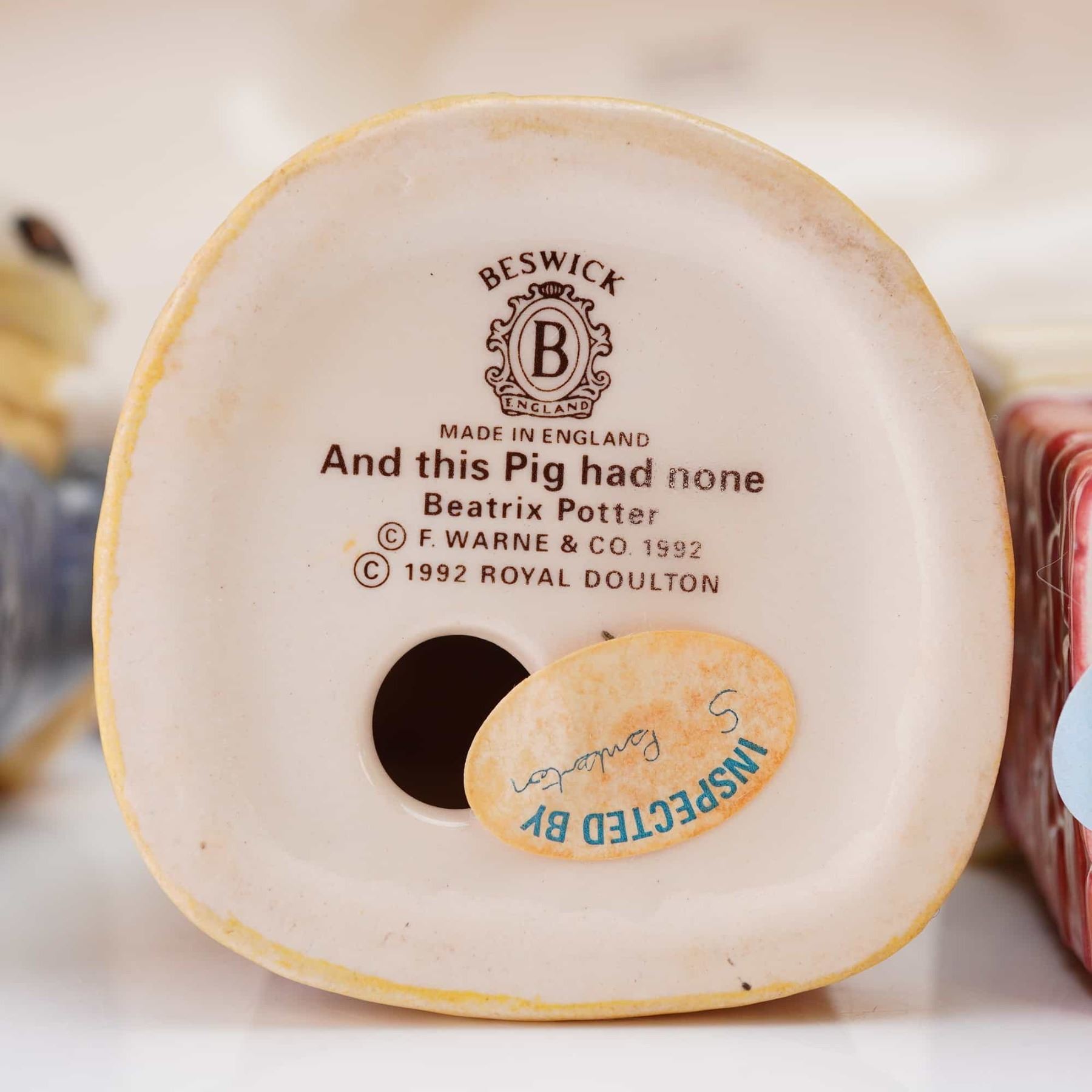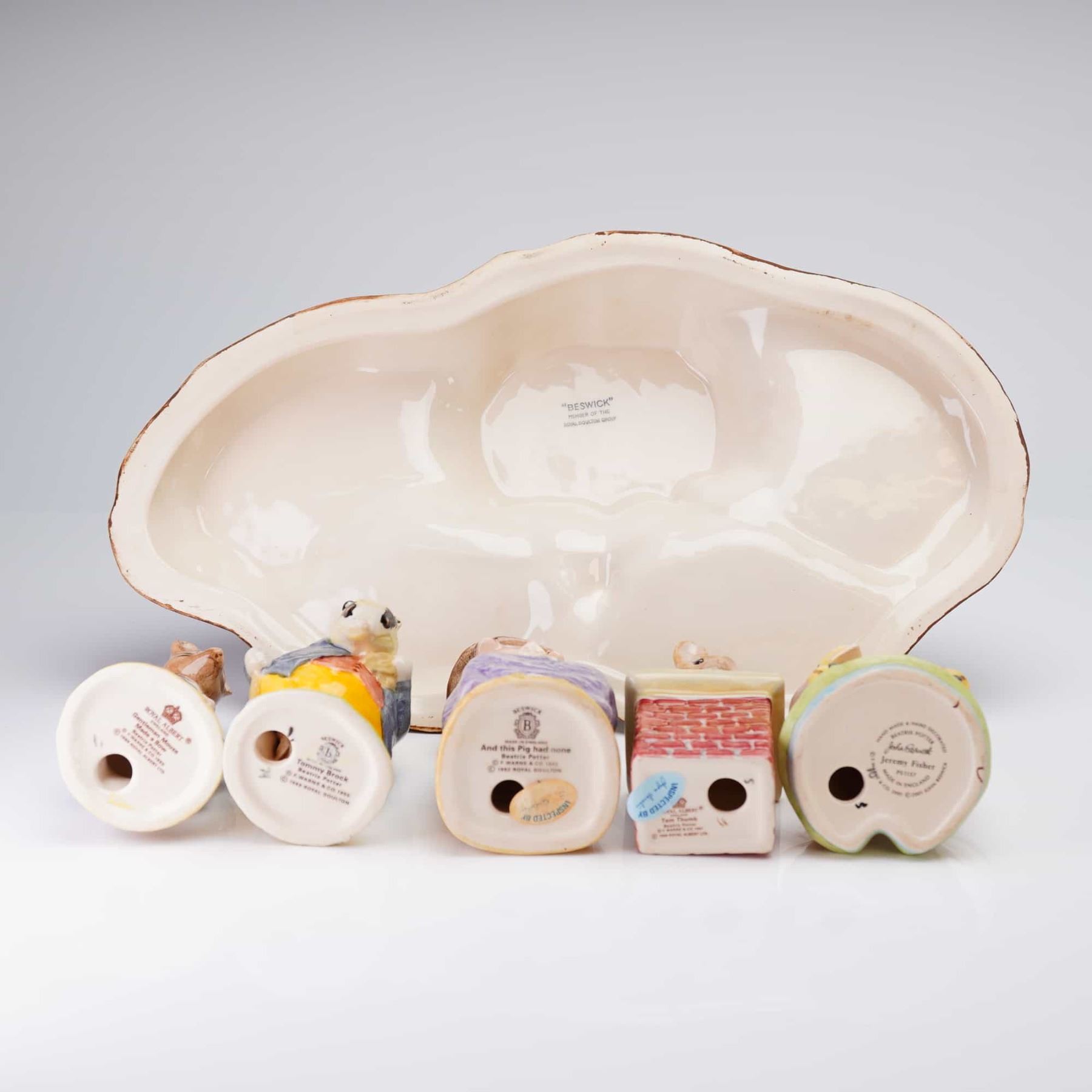 A collection of six ceramic items comprising five polychrome glazed figurines depicting anthropomorphized characters from the Beatrix Potter stories and one large display plinth shaped as a reddish-brown tree stump base. The figures include two mice, a pig seated in a chair, a badger-like figure, and Jeremy Fisher the frog. Markings on the underside of the figures confirm manufacture by Beswick, reading MADE IN ENGLAND, with character names such as And this Pig had none and Jeremy Fisher, and a 1992 Royal Doulton copyright. The large ceramic base is measurement shown.