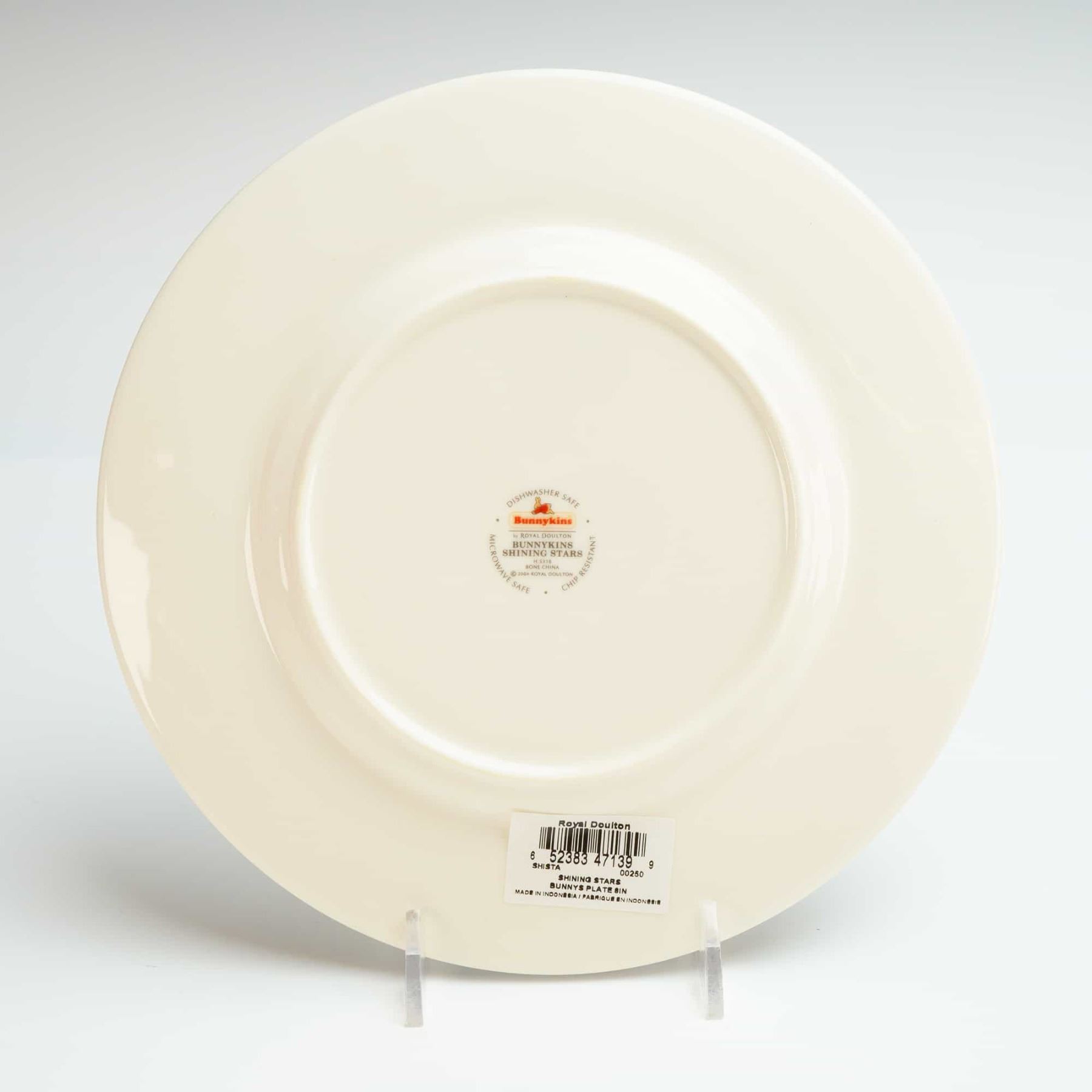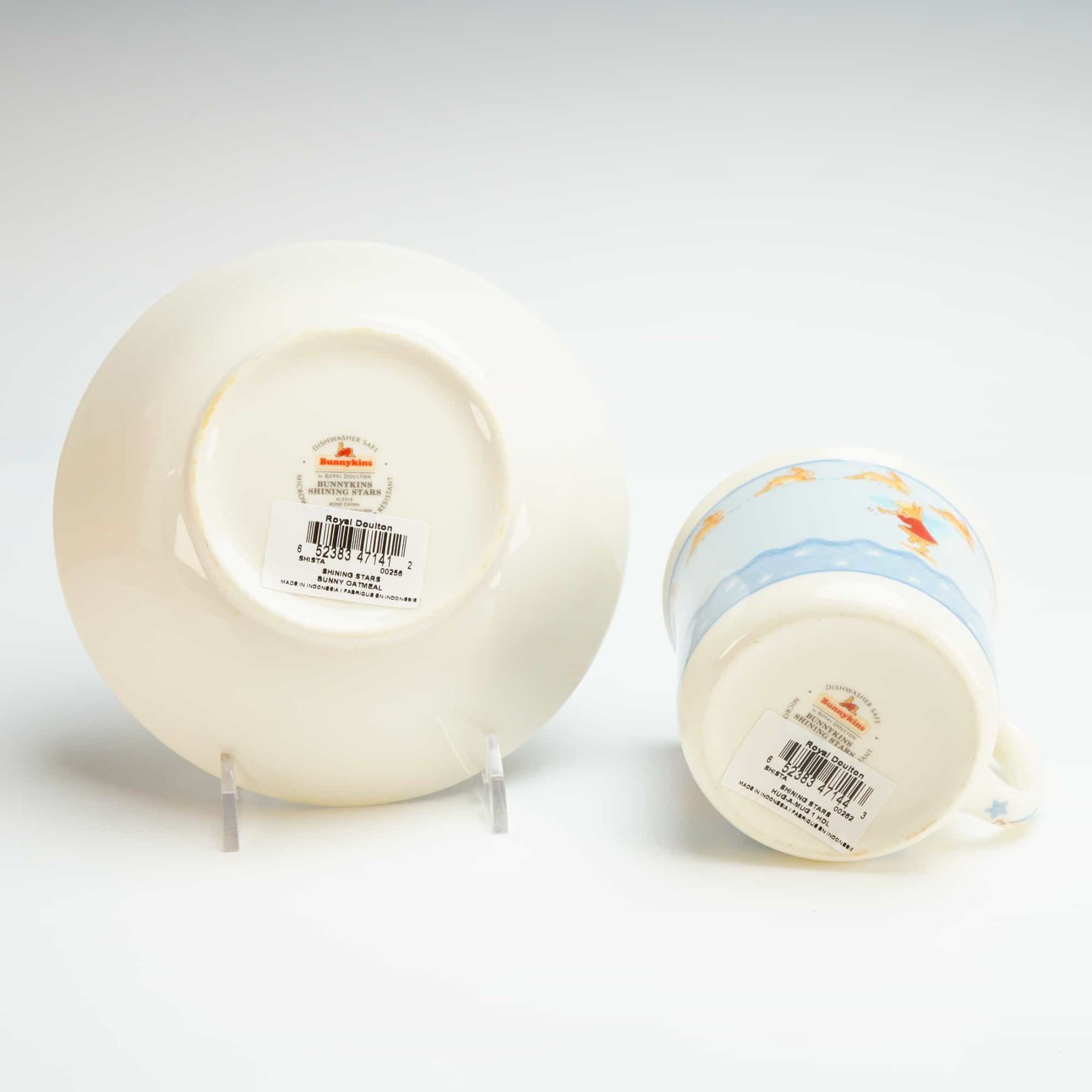 The set includes a plate, bowl, and single-handled mug. Each piece is constructed of bone china and features whimsical illustrations of anthropomorphic rabbits. The plate depicts a rabbit wearing a crown and red robe seated on a tree stump, the bowl shows a rabbit on a rocking horse, and the mug illustrates a rabbit playing a trumpet. The decoration includes a border of running yellow bunnies and blue stars against a pale blue and white background. The underside of each piece is marked Bunnykins by Royal Doulton, Shining Stars, Bone China, copyright 2004 Royal Doulton, and Made in Indonesia. The set retains original retail barcode labels and is accompanied by the original red retail box.