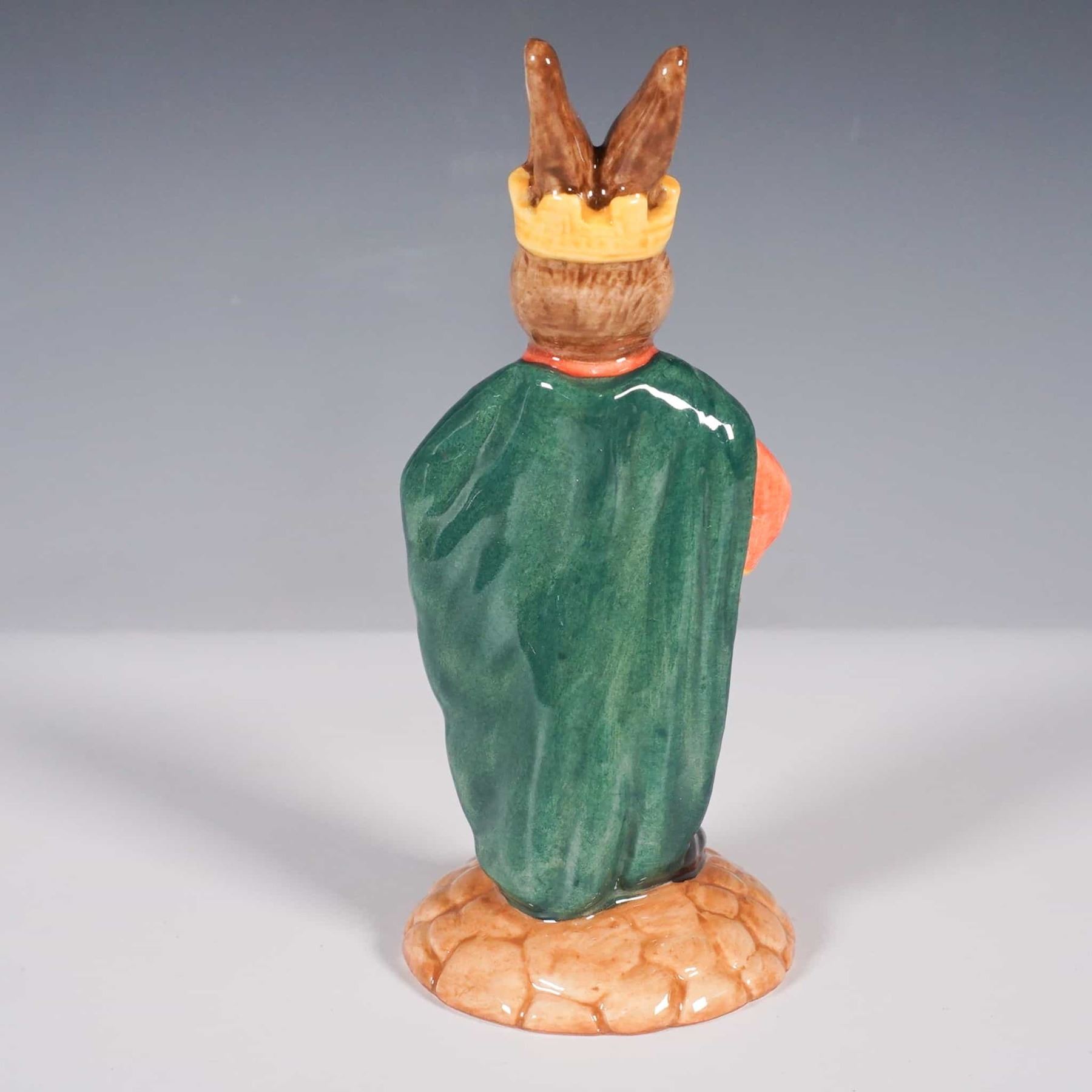 This Royal Doulton Bunnykins figurine portrays Prince John from the Robin Hood series, capturing the regal yet mischievous character in fine ceramic detail. Handcrafted and hand painted, the figure features a vibrant orange tunic, a green cape draped over one shoulder, and a golden crown atop his head. Prince John stands confidently on a textured base, embodying the essence of the classic folklore. Part of the sought-after Bunnykins collection, this figurine was meticulously crafted in England. The lot includes its original box, enhancing its appeal for collectors and enthusiasts alike.