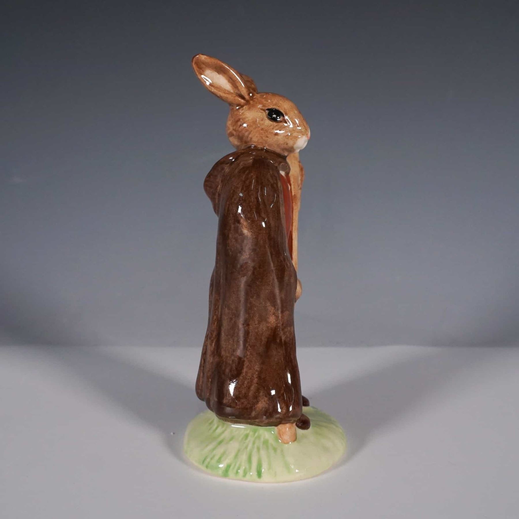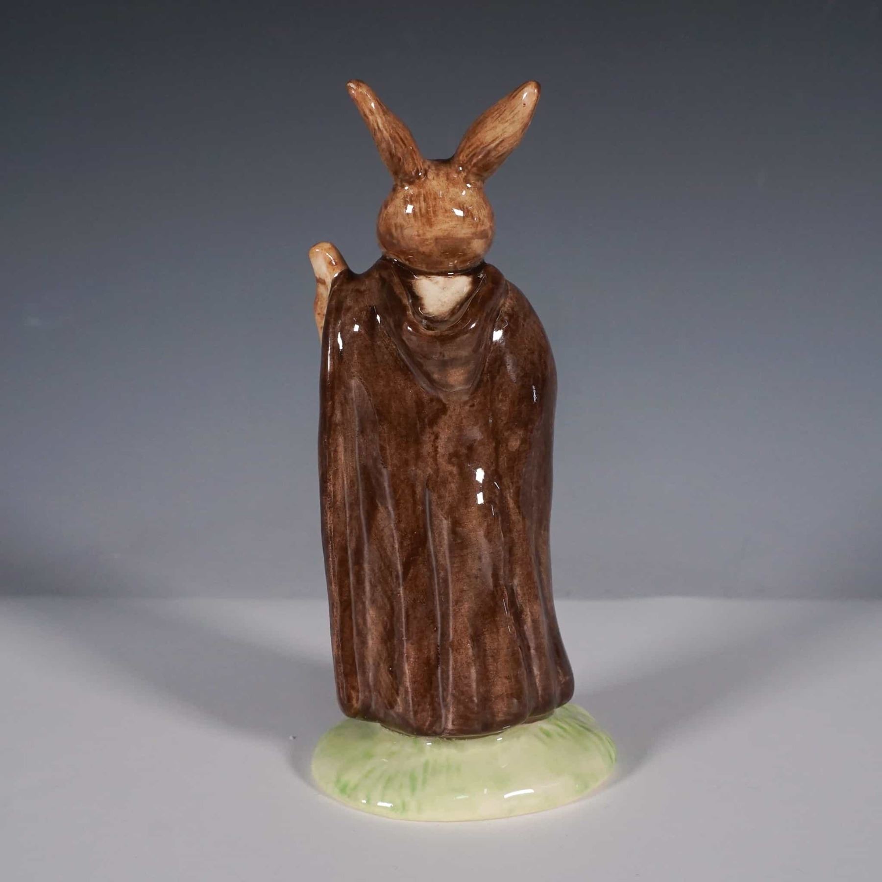 Charming Royal Doulton Bunnykins figurine titled Little John Bunnykins from The Robin Hood Collection. Issued in 2000, this hand-painted and hand-decorated bone china figure depicts Little John, one of Robin Hood's trusted companions, dressed in a brown cloak and red tunic while holding a staff. The piece features fine detailing and vibrant colors characteristic of the beloved Bunnykins series. Marked to the base with the Royal Doulton backstamp and the model number DB 243. This item has its original box.