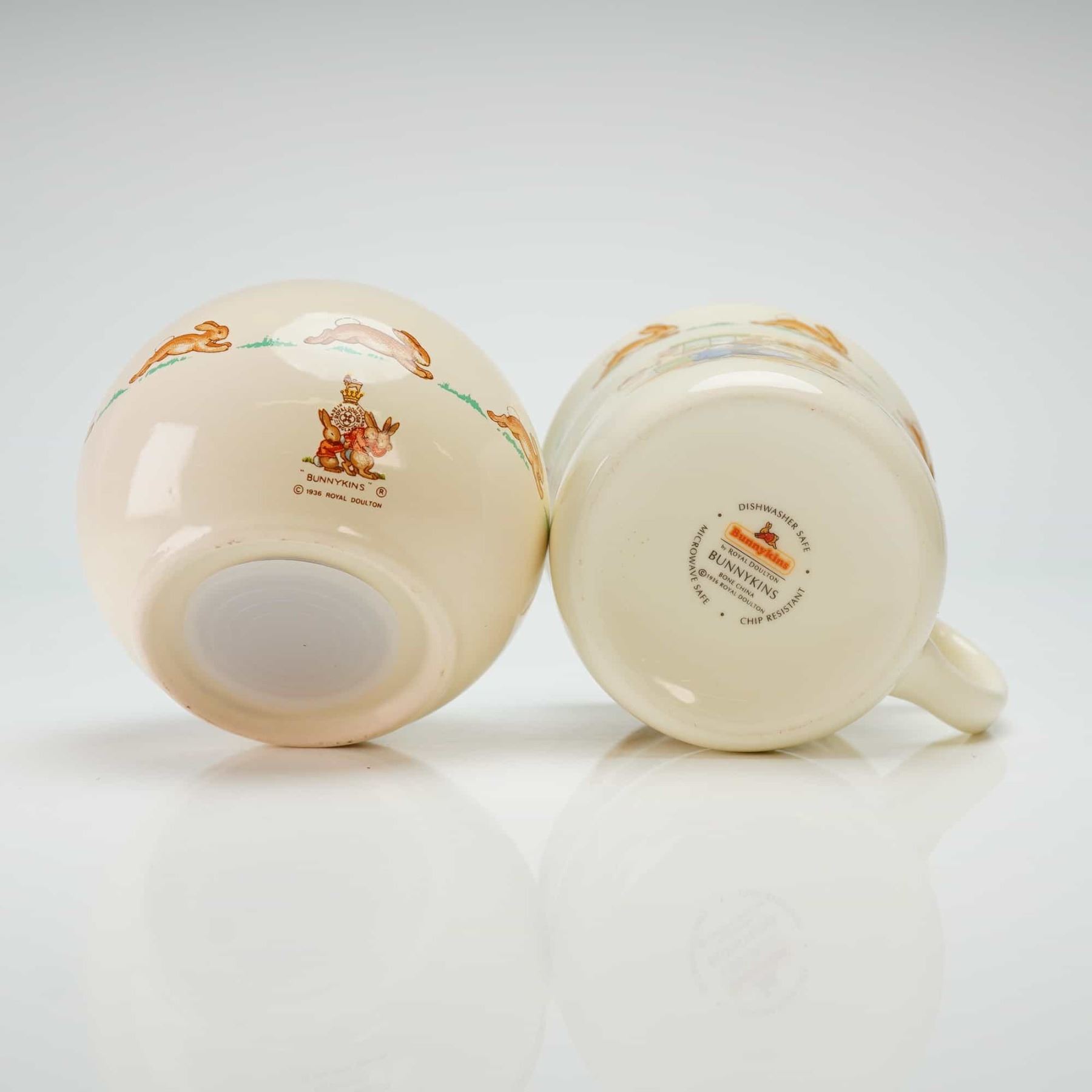 A 2pc Royal Doulton Bunnykins bone china nursery ware set comprising a spherical money ball and a single-handled mug. Each piece is decorated with polychrome transfer-printed scenes depicting anthropomorphic rabbits in narrative settings, including a picnic and domestic chores, bordered by the signature running rabbit frieze. The money ball is fitted with a plastic base stopper. The undersides feature the Royal Doulton Bunnykins backstamps with a 1936 copyright date. The mug is additionally marked as dishwasher safe, microwave safe, and chip resistant.