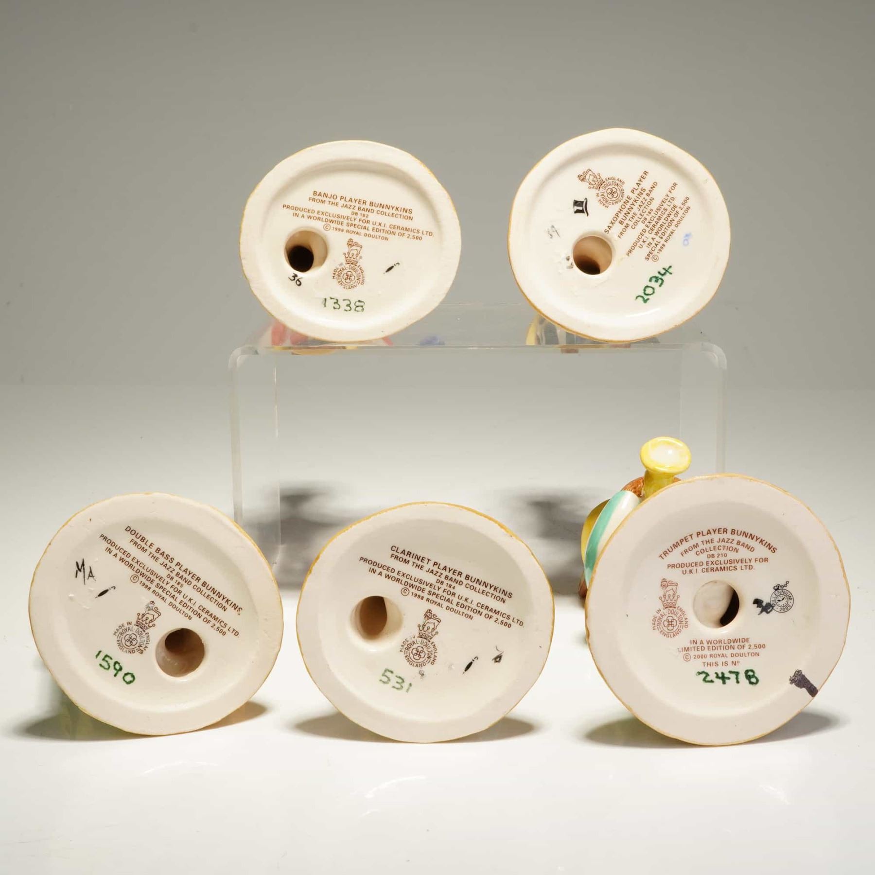 A collection of five Royal Doulton Bunnykins glazed ceramic figurines from The Jazz Band Collection, produced as a limited edition for U.K. International Ceramics Ltd. circa 1998-2000. The group features anthropomorphic rabbits wearing colorful striped and solid-colored blazers with straw hats, each depicted playing a musical instrument. The set includes the limited edition Banjo Player DB182 numbered 1338/2500, the Clarinet Player DB184 numbered 531/2500, the Double Bass Player DB185 numbered 1590/2500, the limited edition Saxophone Player DB186 numbered 2034/2500, and the limited edition Trumpet Player DB210 numbered 2478/2500. Each hand-painted figure is mounted on a circular base with a wood-textured finish. The undersides bear the Royal Doulton backstamp, character title, model number, and hand-written limited edition numbering. One original certificate of authenticity for the Banjo Player Bunnykins is included.