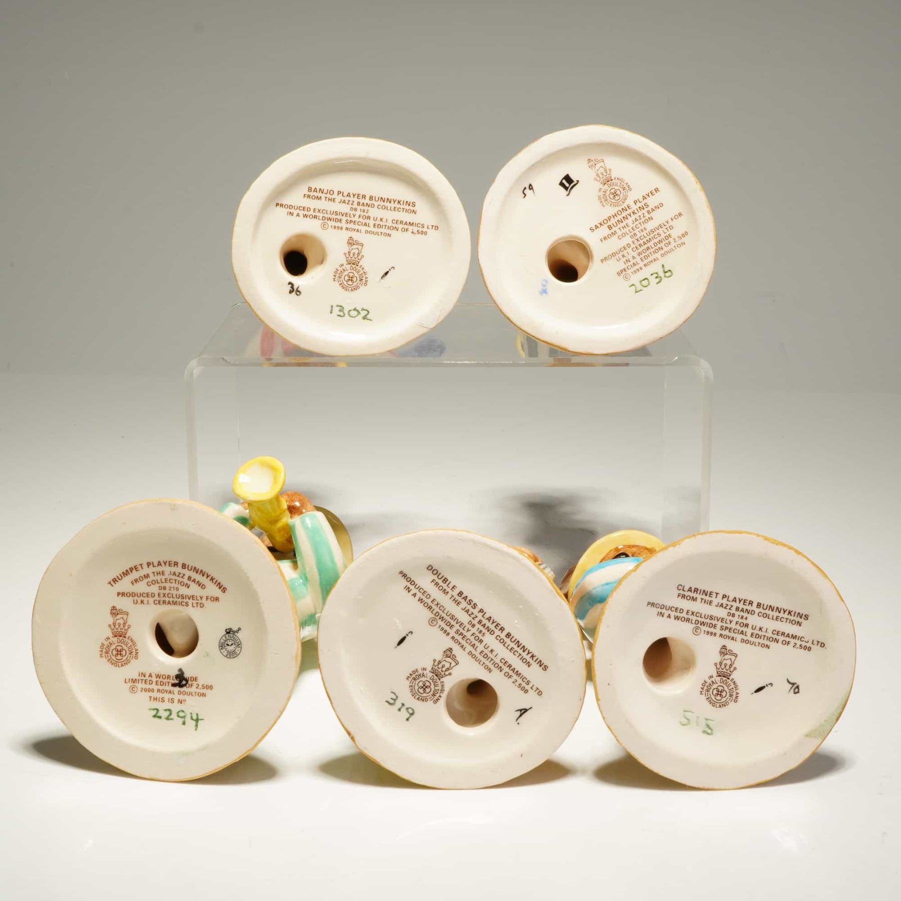 A collection of five Royal Doulton ceramic Bunnykins figurines from The Jazz Band Collection. Each figure is rendered in a hand-painted glaze and depicts an anthropomorphic rabbit musician wearing a colorful striped jacket and boater hat, standing on a circular textured base. The group includes the Banjo Player DB 182, Double Bass Player DB 185, limited edition Saxophone Player DB 186 numbered 2036/2500, limited edition Trumpet Player DB 210 numbered 2294/2500, and Clarinet Player DB 184. These pieces were produced as part of a limited edition of 2,500 for U.K.I. Ceramics Ltd between 1998 and 2000. The undersides bear the official Royal Doulton backstamp, specific character titles, and unique hand-written edition numbers.