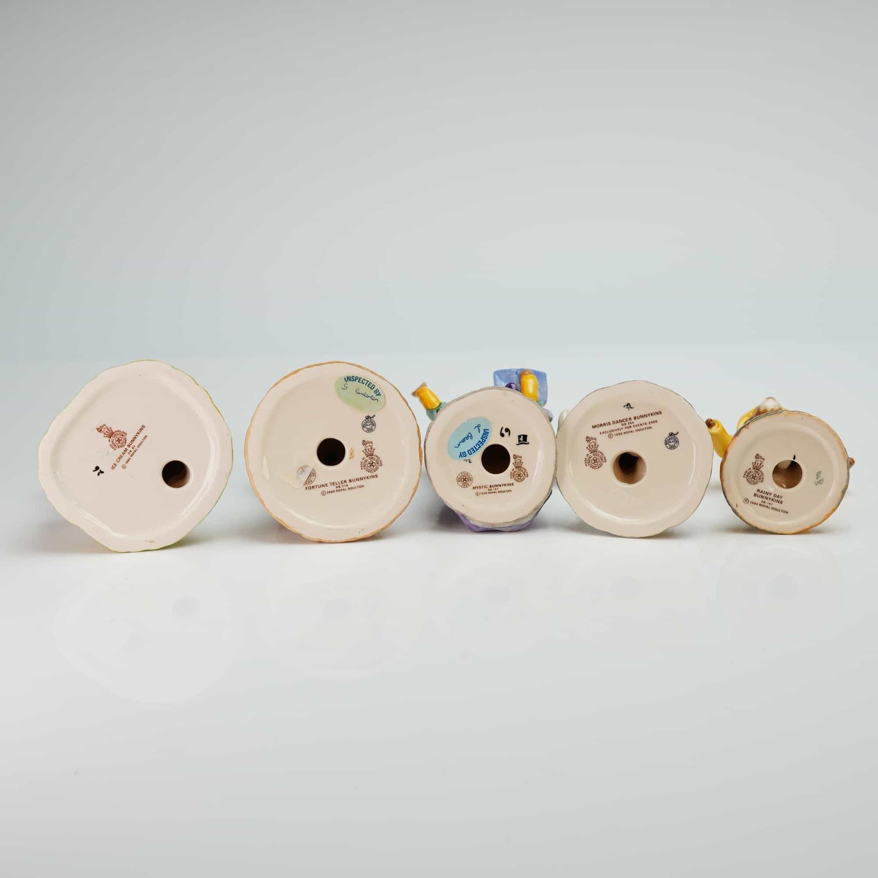 A collection of Royal Doulton Bunnykins glazed ceramic figurines featuring anthropomorphic rabbit characters. The group includes Ice Cream Bunnykins DB 82, dated 1989, Fortune Teller Bunnykins DB 218, dated 2000, Mystic Bunnykins DB 197, dated 1999, Morris Dancer Bunnykins DB 204, produced exclusively for Events 2000, dated 1999, and Rainy Day Bunnykins DB 147, dated 1994. Each piece displays hand-painted details and carries the official Royal Doulton backstamp on the base. Some pieces include original quality control inspection stickers.