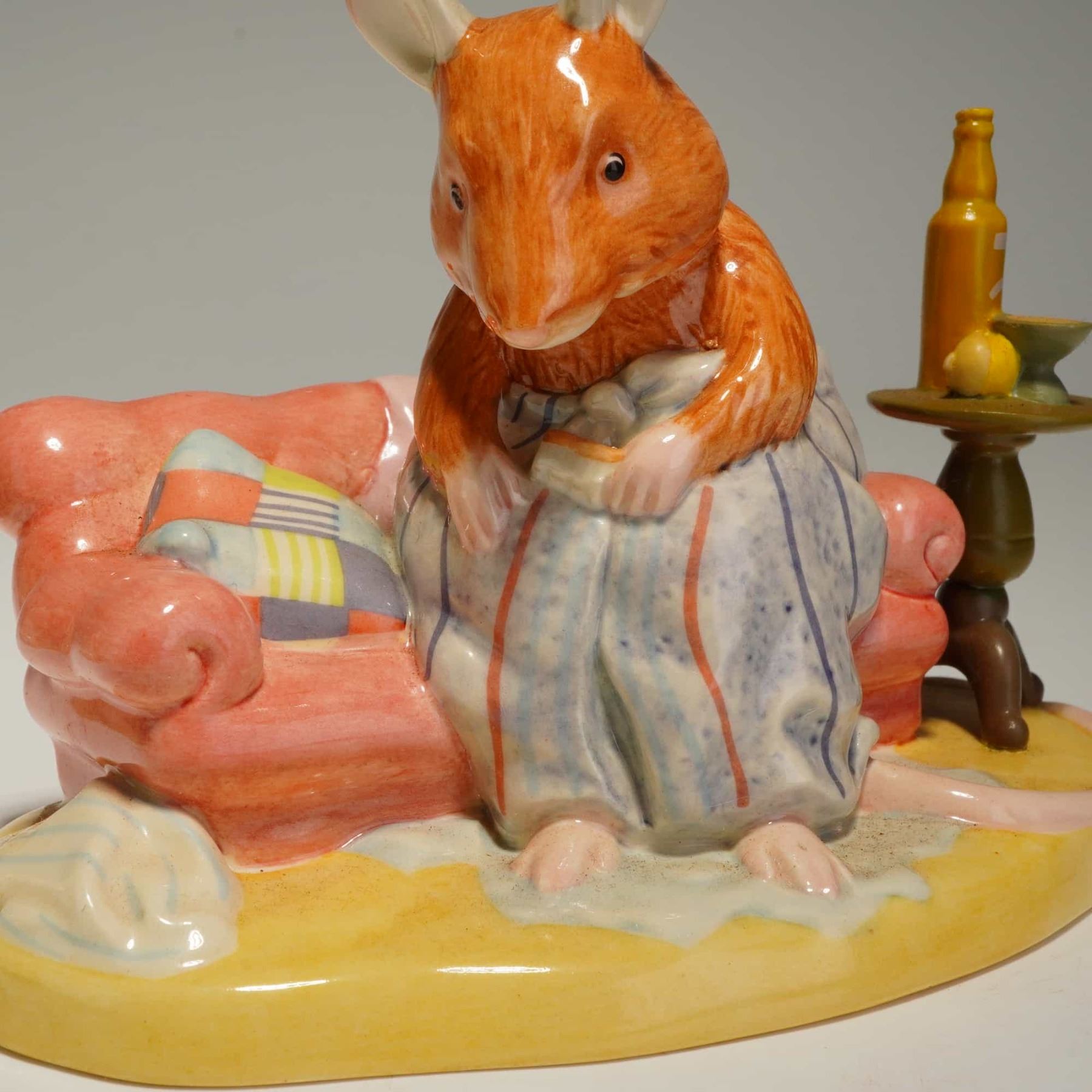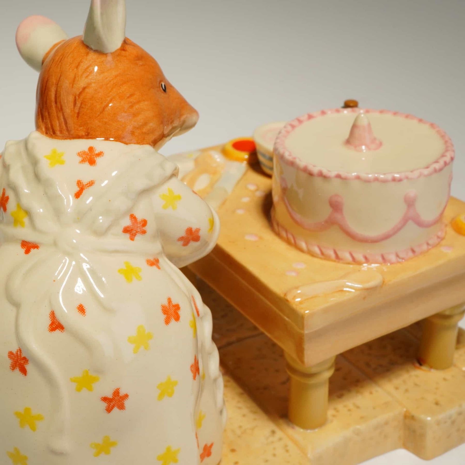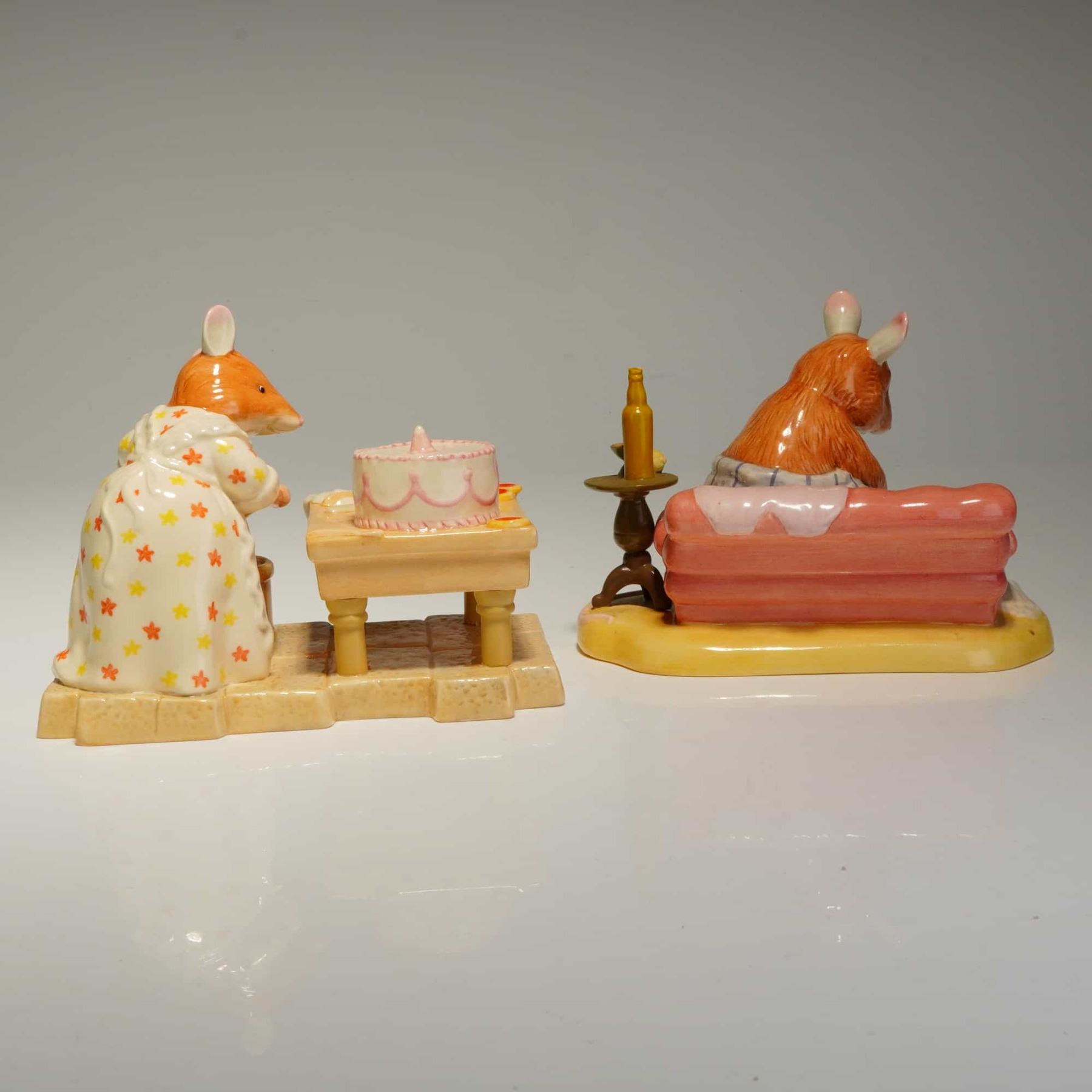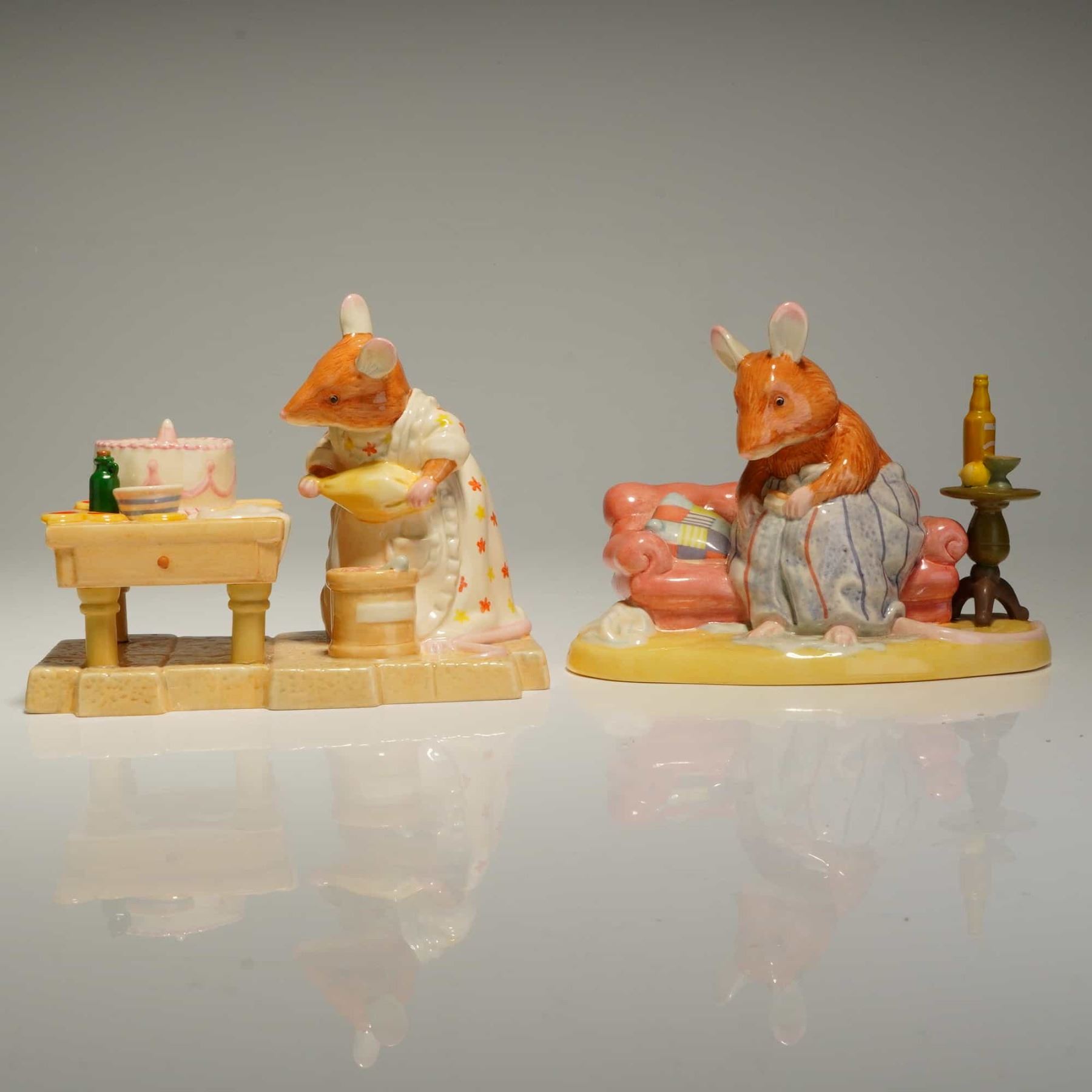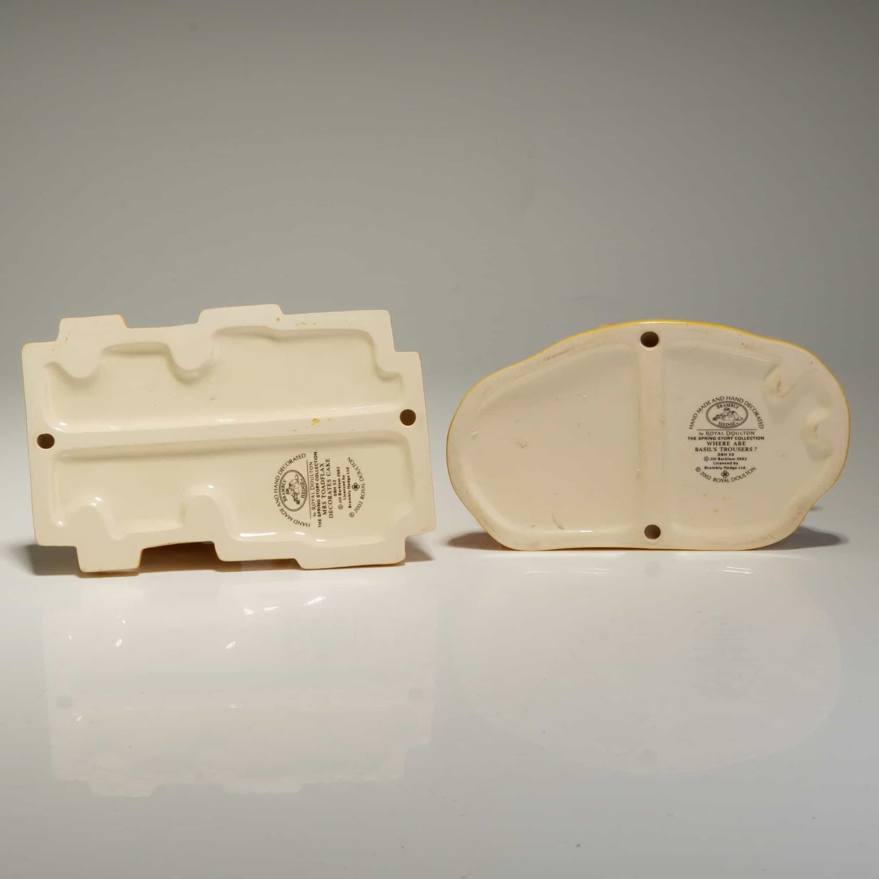 Two Royal Doulton hand-made and hand-decorated ceramic figurines from the Brambly Hedge: The Spring Story Collection, based on the illustrations of Jill Barklem. The first figurine, where are Basil's Trousers? (DBH50), depicts an anthropomorphic mouse in blue and white striped pajamas seated on a salmon-colored sofa beside a side table with a bottle and citrus fruit. The second figurine, Mrs. Toadflax Decorates a Cake (DBH52), features a mouse in a floral dress standing at a kitchen table with a pink-iced cake. Both items exhibit a high-gloss glazed finish. The underside of each piece bears the complete manufacturers backstamp, including the Royal Doulton logo, the collection title, the model name, and the date 2002. Measurement is of largest item.