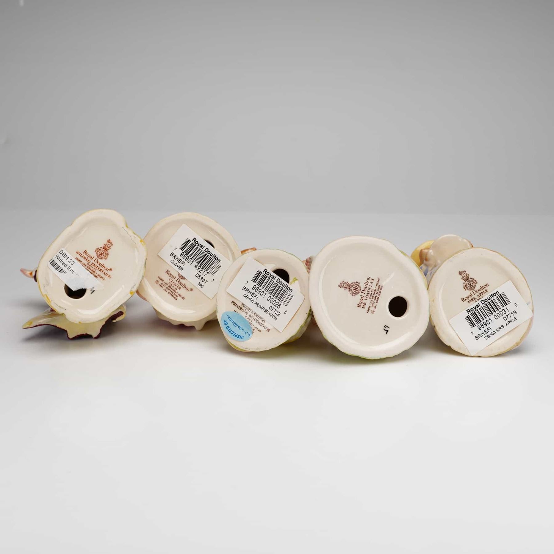 A set of five Royal Doulton glazed ceramic figurines from the Brambly Hedge series, based on the illustrations by Jill Barklem. The collection includes the characters Mrs. Apple DBH3, Clover DBH16, Wilfred Entertains DBH23, Primrose Woodmouse DBH8, and Mr. Toadflax DBH10. Each figure is hand-decorated in a polychrome palette, depicting anthropomorphic mice in detailed period-style clothing such as aprons, striped dresses, and a feathered hat. The bases feature the Royal Doulton lion and crown backstamp, character identification, and copyright dates ranging from 1982 to 1991.