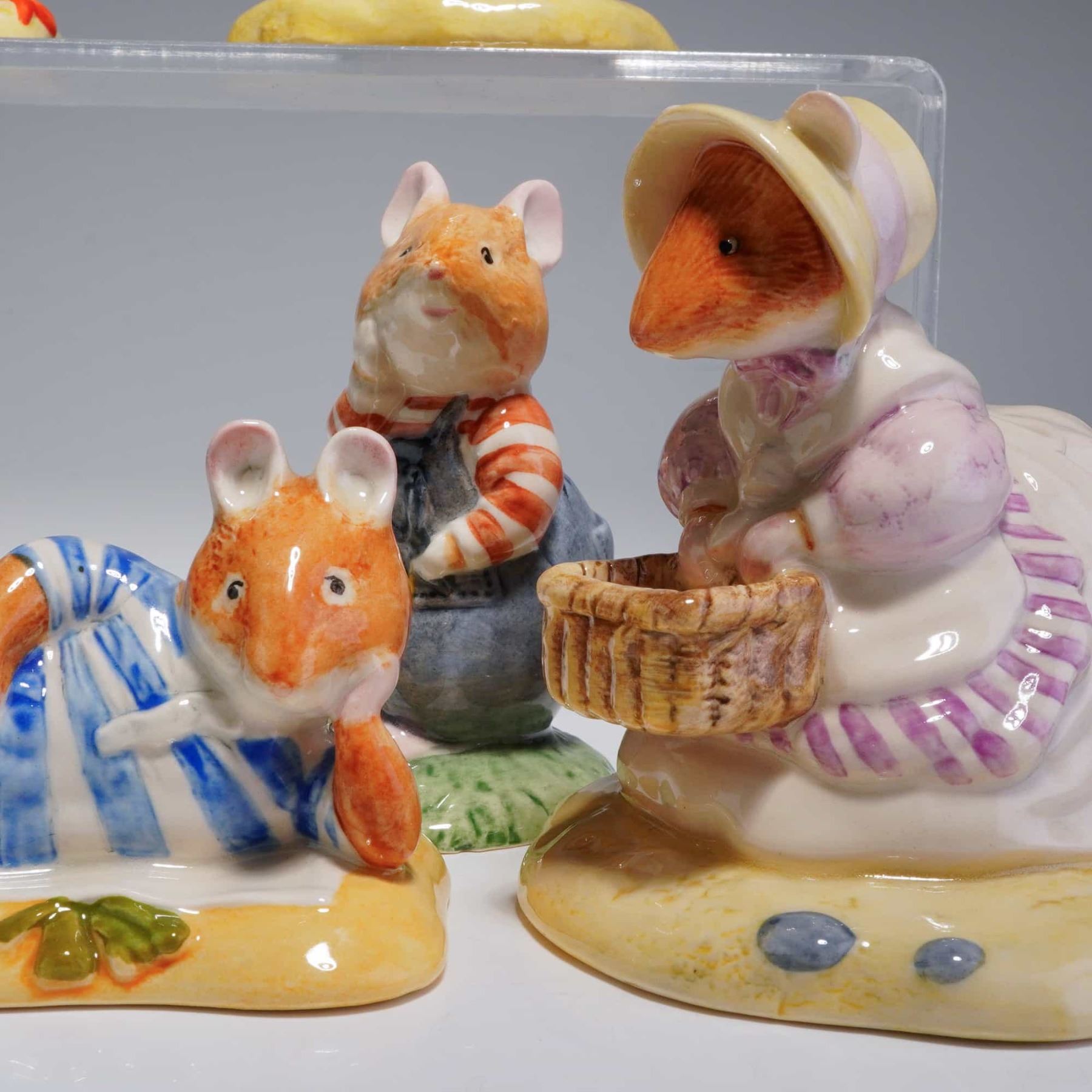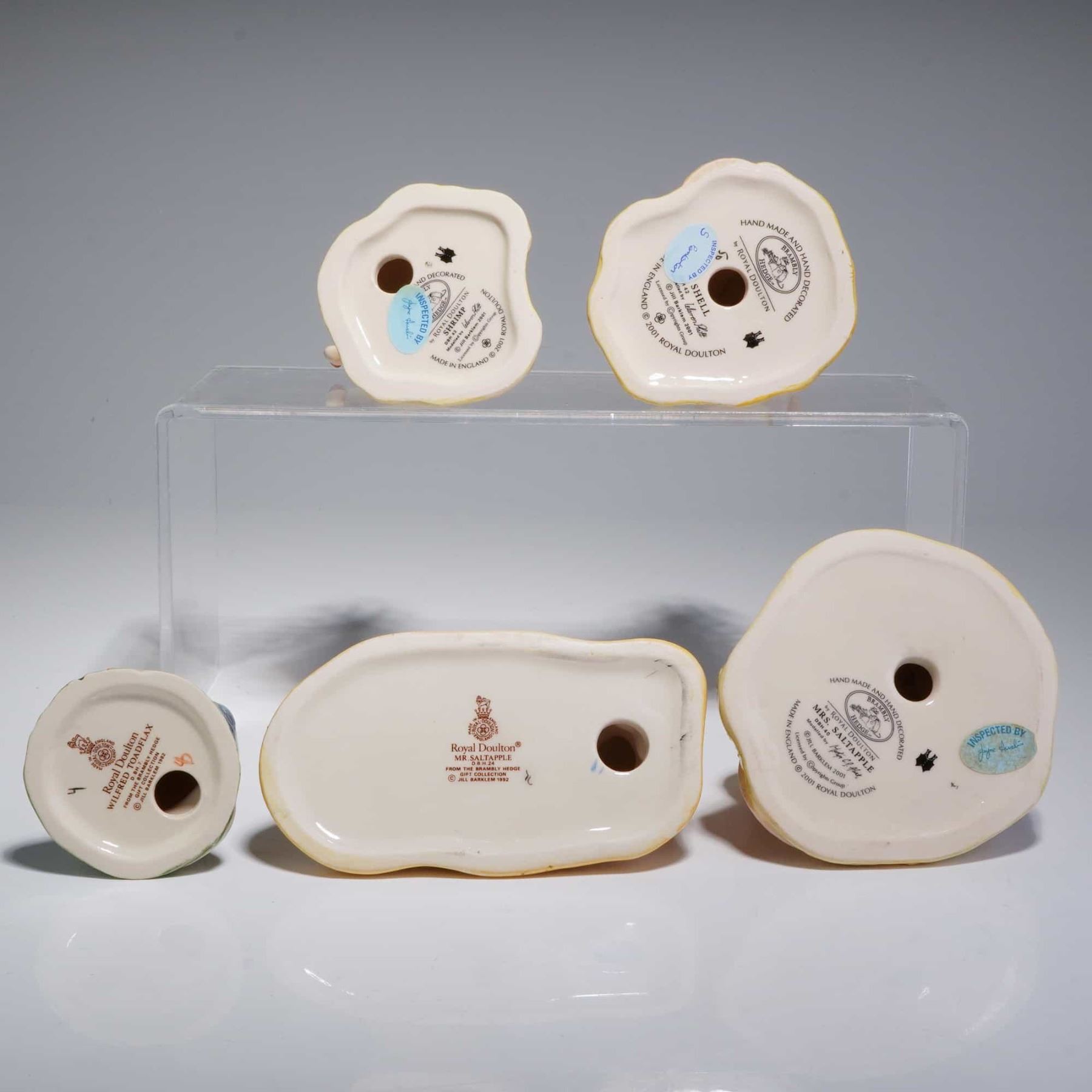 A collection of five Royal Doulton ceramic figurines from the Brambly Hedge Gift Collection, inspired by the illustrations of Jill Barklem. This group features various characters including Wilfred Toadflax DBH7 in denim overalls, Mr. Saltapple DBH24 reclining in a blue and white striped outfit, Mrs. Saltapple DBH40 holding a wicker basket, Shell DBH42, and Shrimp DBH43. Each figurine is hand-made and hand-decorated with a high-gloss glaze. The undersides bear official Royal Doulton backstamps with production dates ranging from 1982 to 2001, indicating they were made in England. Measurement is of largest item.