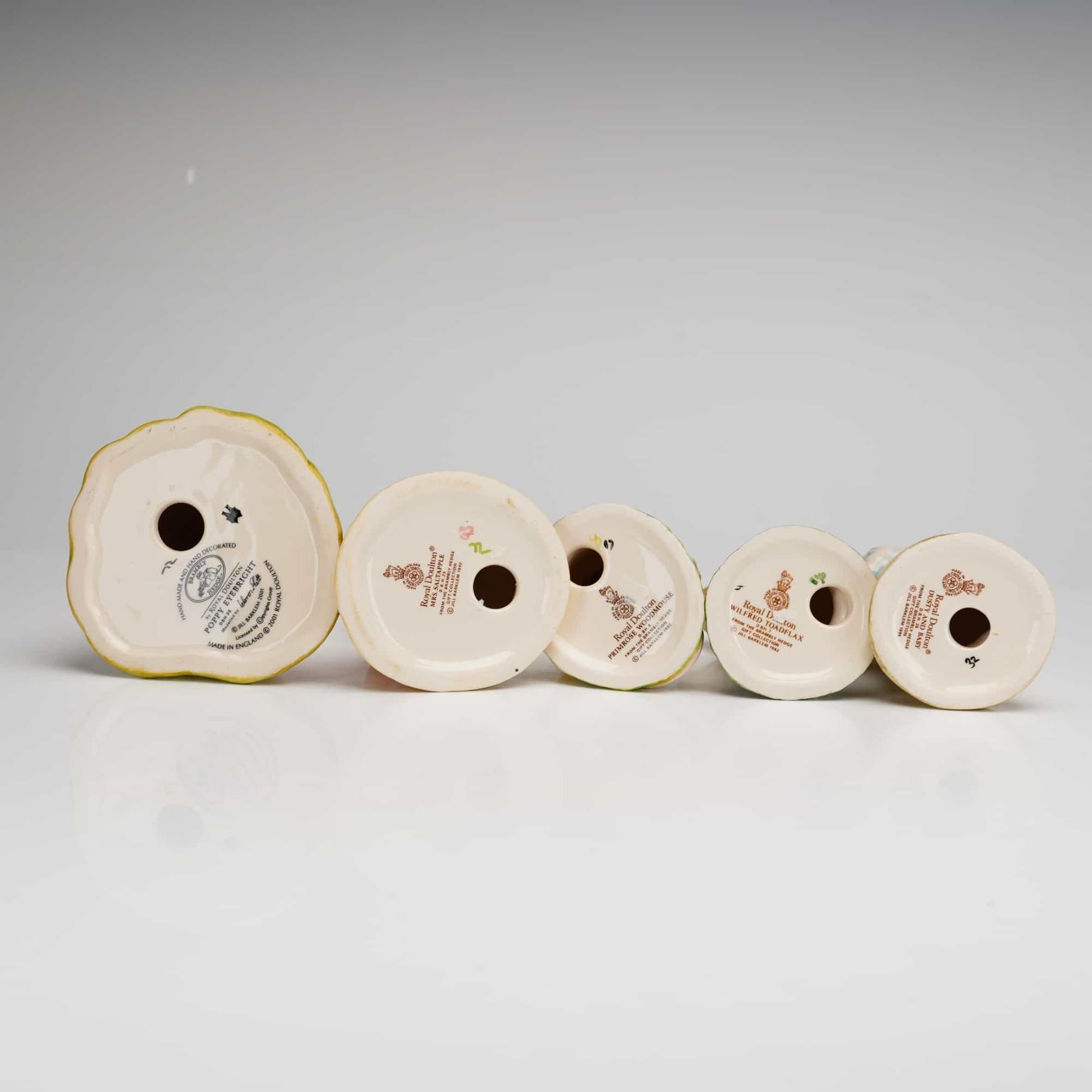 A collection of 5 Royal Doulton glazed ceramic figurines from the Brambly Hedge gift collection, based on the illustrations by Jill Barklem. This group includes Poppy Eyebright DBH36, Wilfred Toadflax DBH7, Dusty and Baby DBH26, Mrs. Saltapple DBH25, and Primrose Woodmouse DBH8. Each anthropomorphic mouse figure is hand-decorated in soft pastel colors and mounted on a naturalistic base. The underside of each figurine features the official Royal Doulton maker's mark, character name, and copyright information. The backstamps show various production dates including 1982, 1983, 1994, 1995, and 2001.
