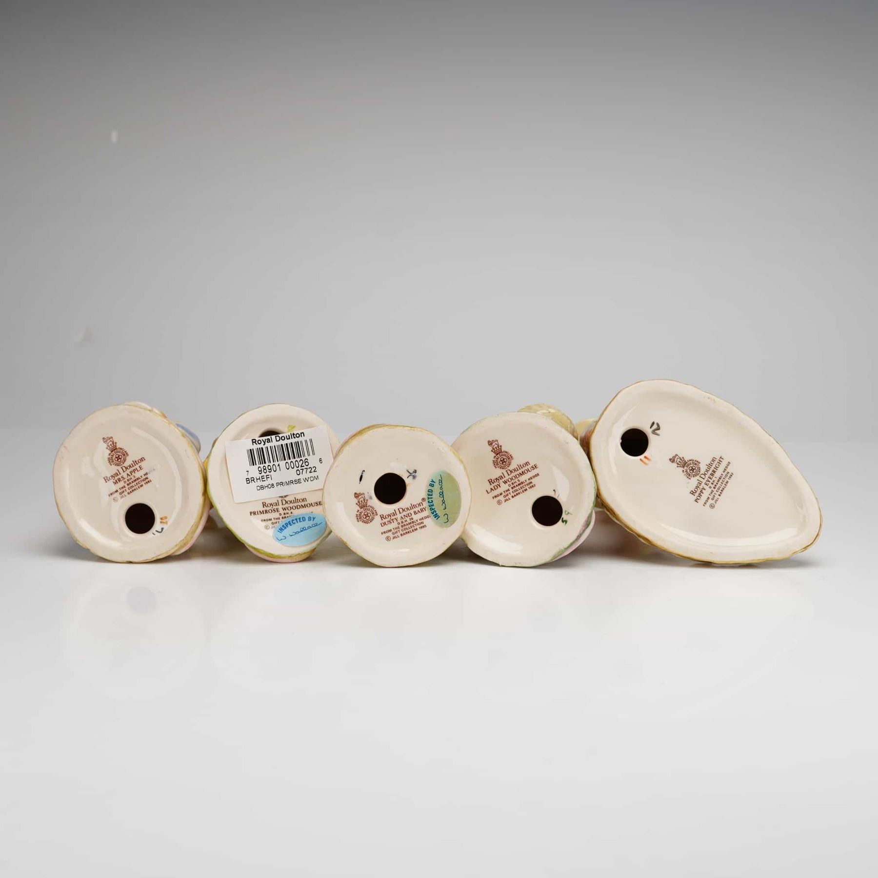 A collection of five Royal Doulton glazed ceramic figurines from the Brambly Hedge series, based on the illustrations of Jill Barklem. The group features Dusty and Baby DBH26, Mrs. Apple DBH3, Poppy Eyebright DBH1, Primrose Woodmouse DBH8, and Lady Woodmouse DBH5. Each figure is rendered with multi-colored glazes and depicts an anthropomorphic mouse character in period-style attire. The underside of each figurine bears the Royal Doulton backstamp, the specific character title, and copyright dates ranging from 1982 to 1995.