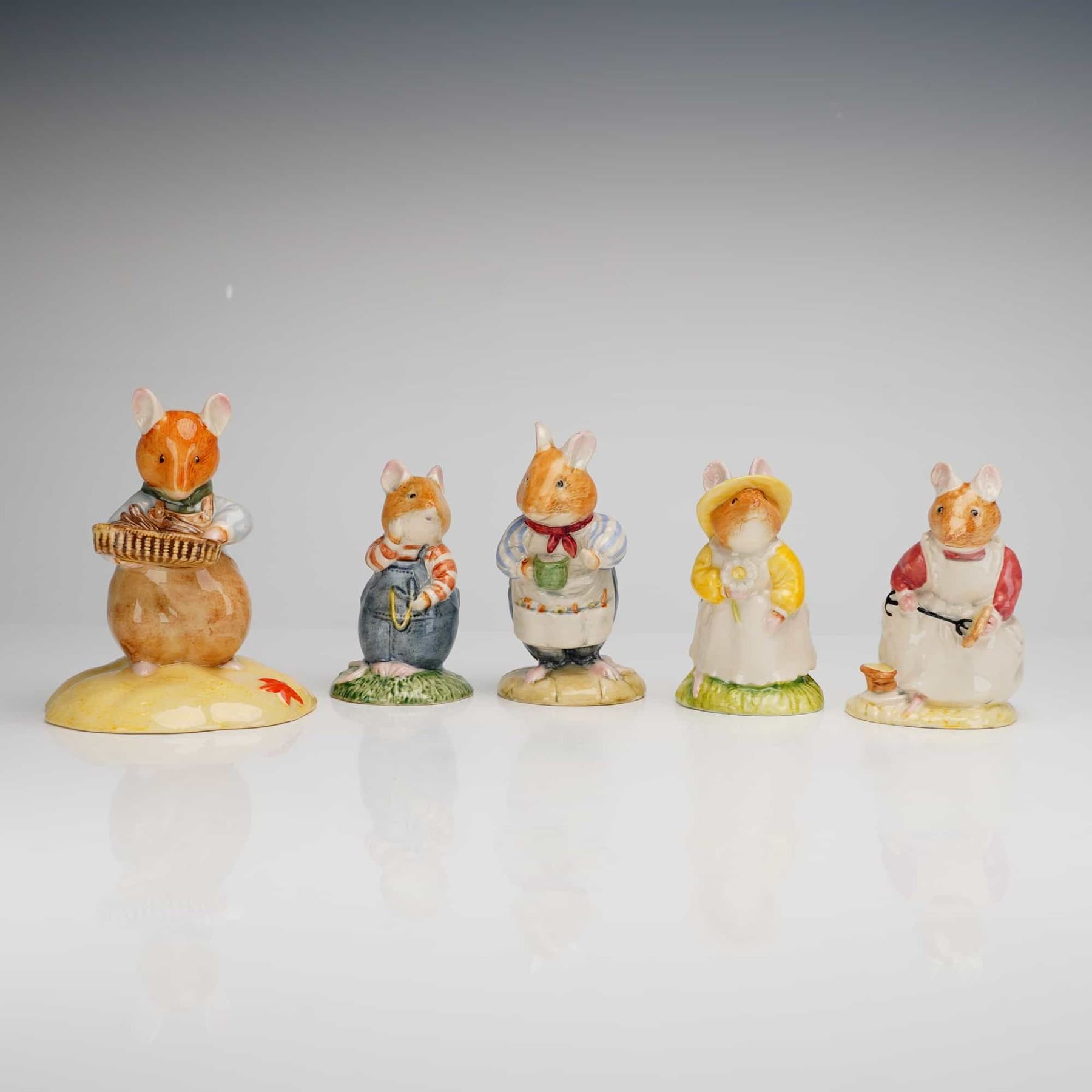 A collection of five Royal Doulton polychrome glazed ceramic figurines from the Brambly Hedge series, based on the illustrations by Jill Barklem. This set includes the characters Mr. Saltapple DBH39, Mr. Apple DBH2, Clover DBH16, Wilfred Toadflax DBH7, and Primrose Woodmouse DBH8. Each figure is modeled as an anthropomorphic mouse in detailed costume with various accessories, including a harvest basket, a teacup, and garden attire. The figurines are set on low integral bases, with the largest piece standing on a broader mound decorated with a leaf. Royal Doulton backstamps.