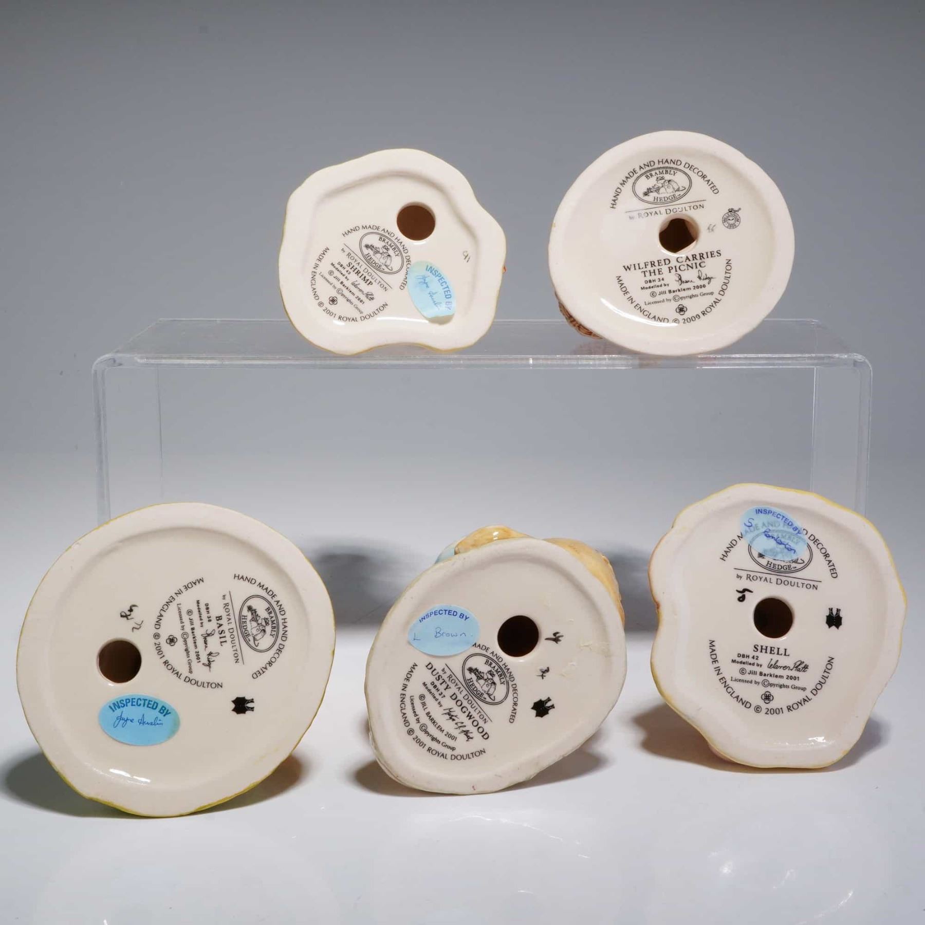 A 5pc collection of Royal Doulton ceramic figurines from the Brambly Hedge series, depicting anthropomorphic mouse characters based on the illustrations of Jill Barklem. The group includes Wilfred Carries the Picnic DBH34, Dusty Dogwood DBH37, Basil DBH38, Shell DBH42, and Shrimp DBH43. Each piece is hand-made and hand-decorated in England, finished in a traditional polychrome glaze. The underside of each figurine bears a detailed backstamp including the Royal Doulton hallmark, character name, DBH series model number, modeler name, and copyright dates from 2000 and 2001. Measurement is of largest item.