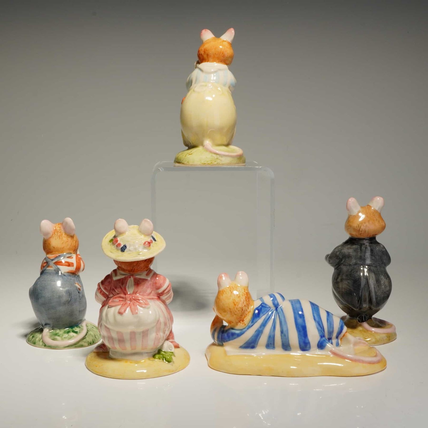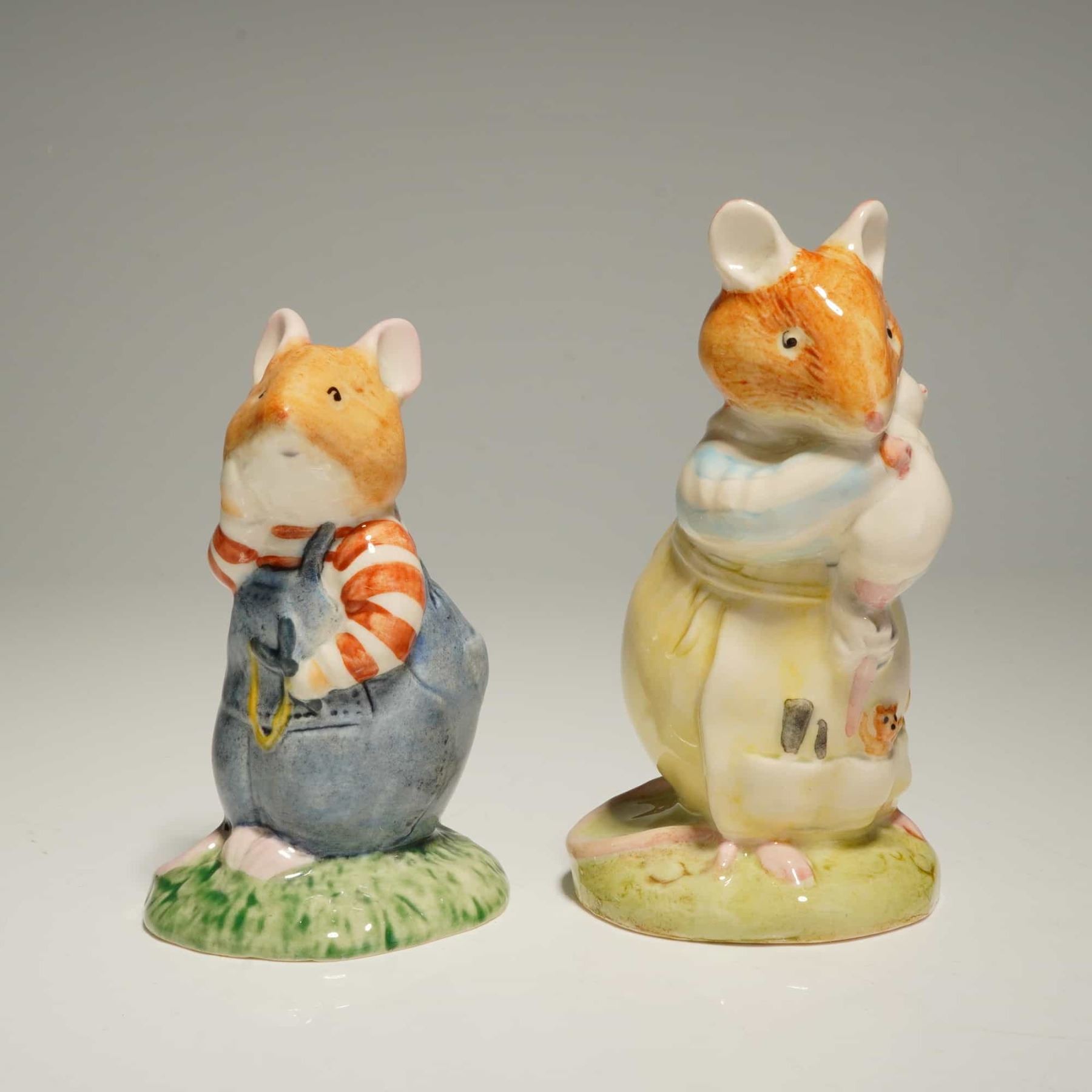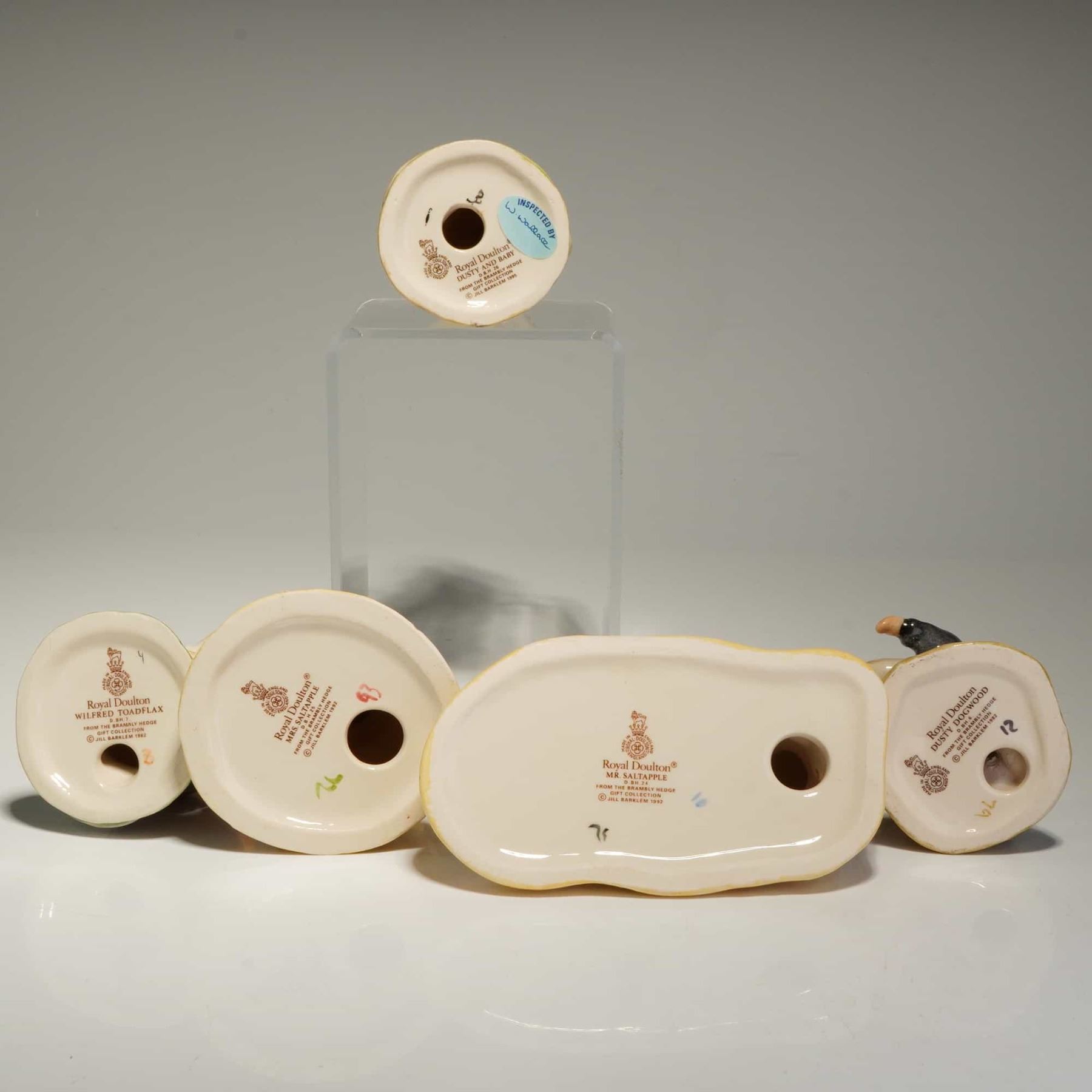 This 5pc collection of Royal Doulton ceramic figurines is from the Brambly Hedge Gift Collection, based on the illustrations of Jill Barklem. The group includes Wilfred Toadflax DBH7, Mrs. Saltapple DBH25, Mr. Saltapple DBH24, Dusty Dogwood DBH6, and Dusty and Baby DBH26. Each figurine is crafted from hand-painted glazed ceramic and depicts anthropomorphic mice in detailed costumes, such as Wilfred Toadflax in blue overalls and Dusty Dogwood in a formal black tailcoat. The underside of each piece features the official Royal Doulton backstamp, indicating the character name, DBH reference number, and copyright dates ranging from 1982 to 1995. Note that the measurement is of the largest figurine in the group.