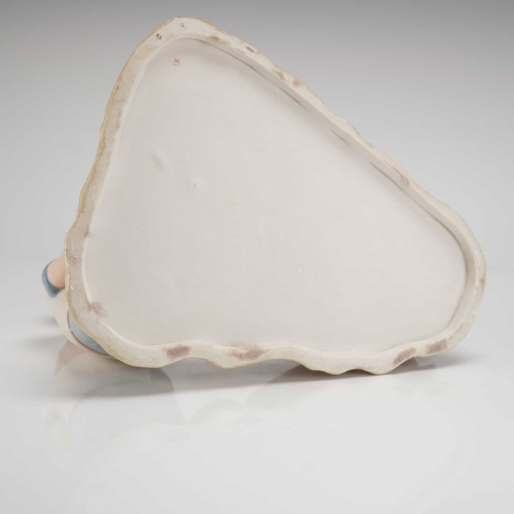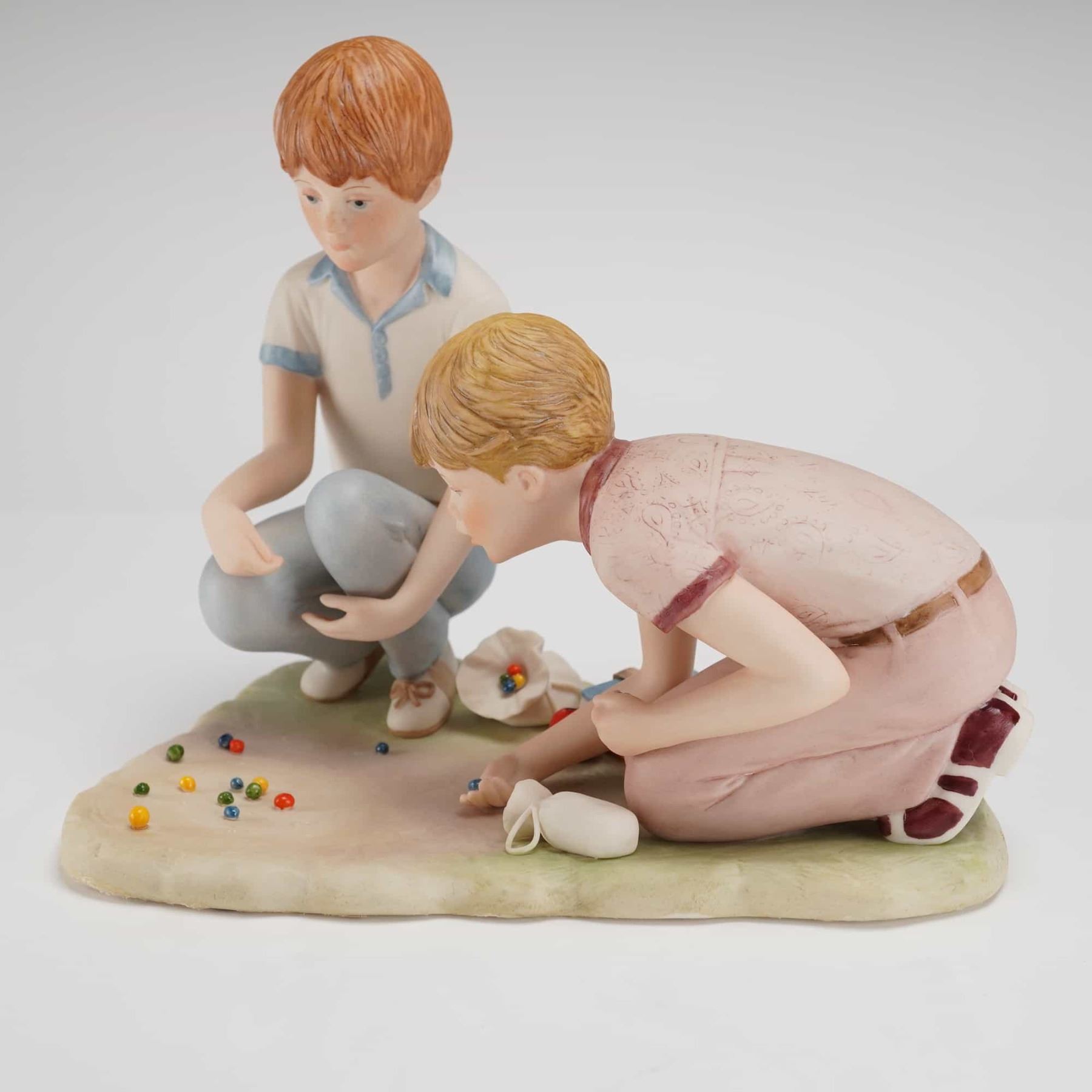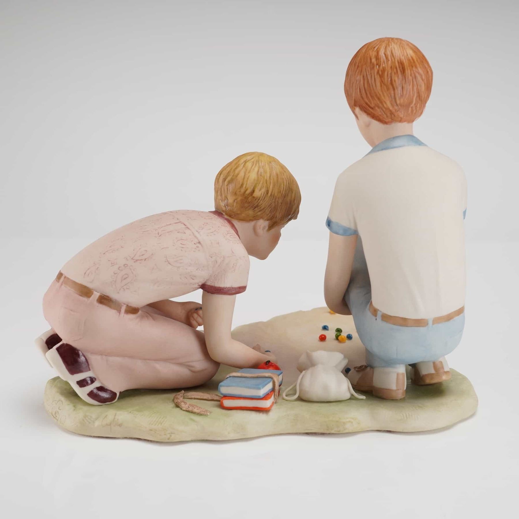A Cybis Porcelain Figurine depicting the figures known as Rusty and Jonny. This glazed porcelain figurine group features two young boys crouching on an integral base, engaged in playing marbles. The figure with reddish hair is rendered wearing a white polo shirt with blue trim and blue trousers. The blonde-haired figure wears a pale pink patterned shirt and pinkish-tan trousers. The integral base is naturalistically modeled to represent the ground, featuring 13 small, colorful marbles scattered across the surface. The scene also includes two small cloth bags and a stack of two miniature books visible on the reverse side of the sculpture. The underside of the base is unglazed and features a faint reddish production mark.