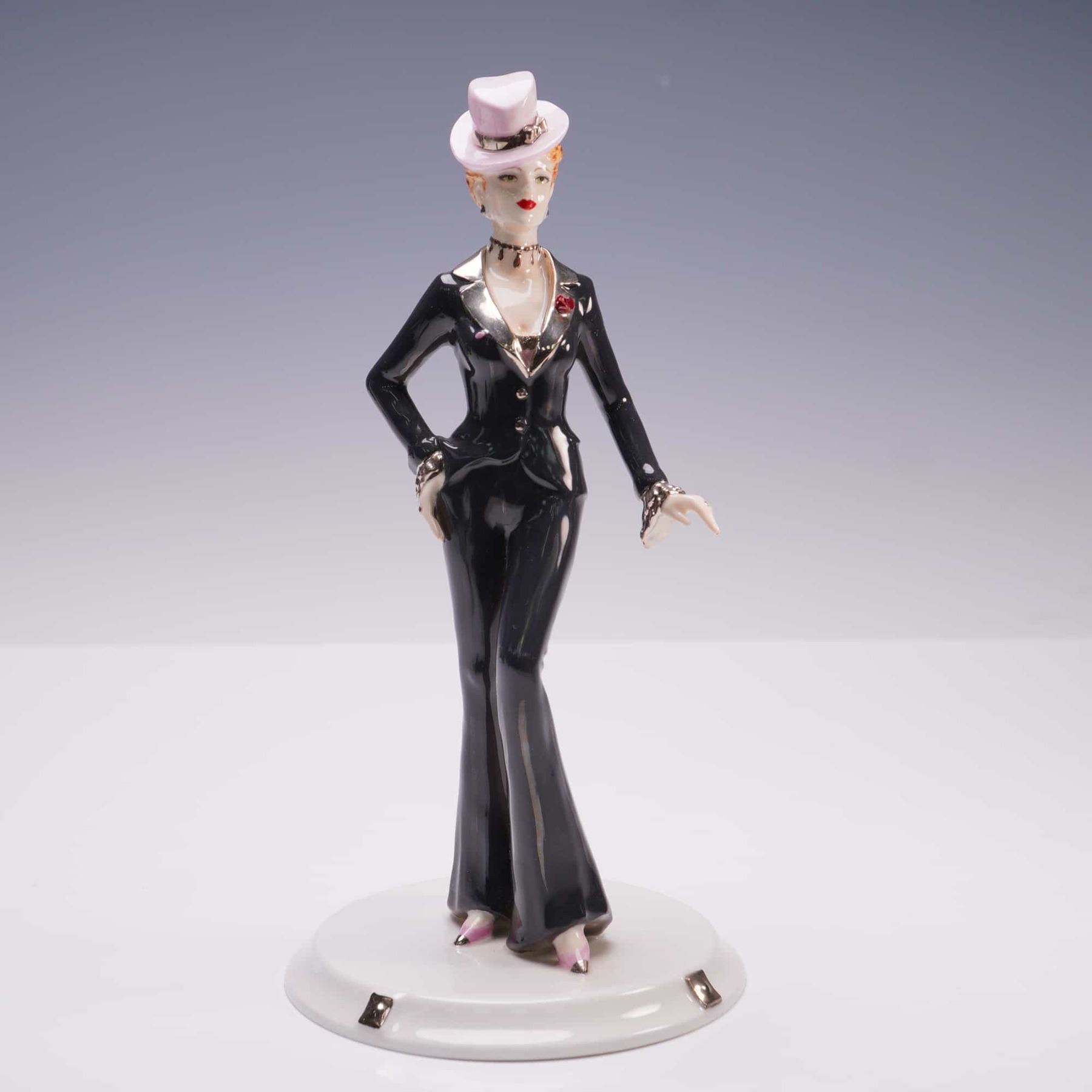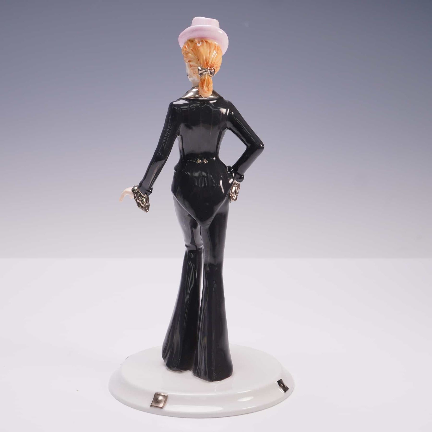 Limited edition Bone China from the David Shilling Celebration Collection. Depicts a poised female figure dressed in a glossy black tailored pantsuit with flared trousers and a fitted jacket accented by silver trim, a choker necklace, and a red brooch. She is adorned with a pale pink top hat and stands atop a circular white base marked with metal-like corner accents. Coalport backstamp.