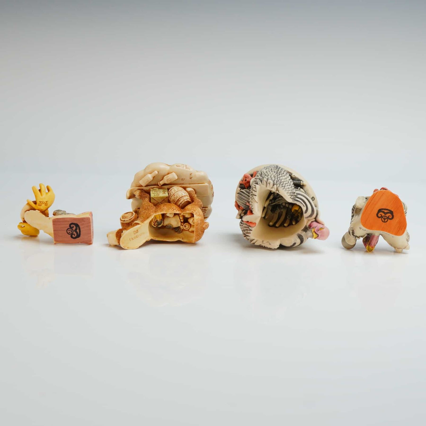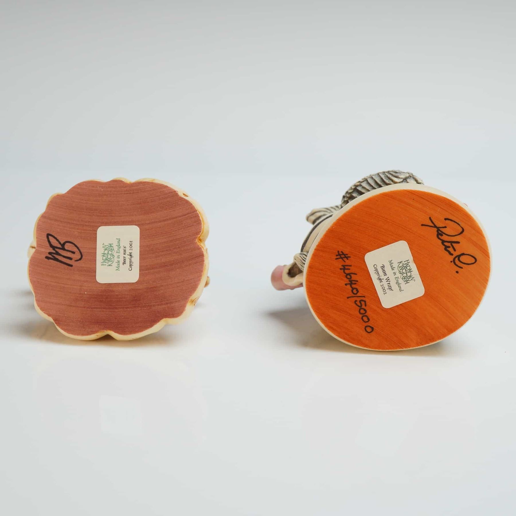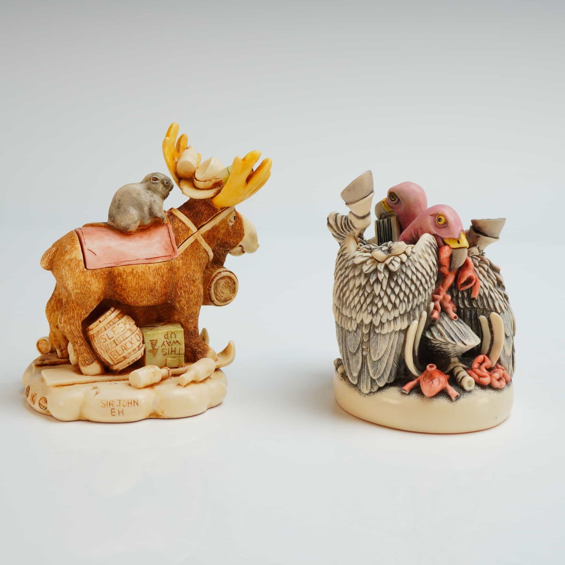 This lot features two Harmony Kingdom resin trinket boxes titled Beer Nuts and Bum Wrap, both signed by the artist. These hand-painted sculptural boxes are crafted in the miniature style characteristic of the maker and include hidden interior carvings. The first figurine, Beer Nuts, depicting a moose accompanied by beavers, skis, and barrels. The base is inscribed with the names RICH LITTLE and SIR JOHN EH and bears a manufacturer label. The second figurine, Bum Wrap, is a limited edition numbered. It portrays vultures with zebra-striped elements and a book titled Vulture Etiquette. This piece is signed on the base and also carries a manufacturer label. The model numbers are TJBB02 & TJLECAN2.