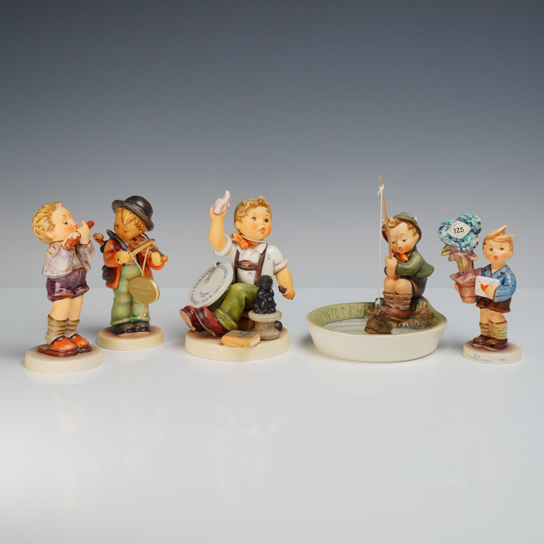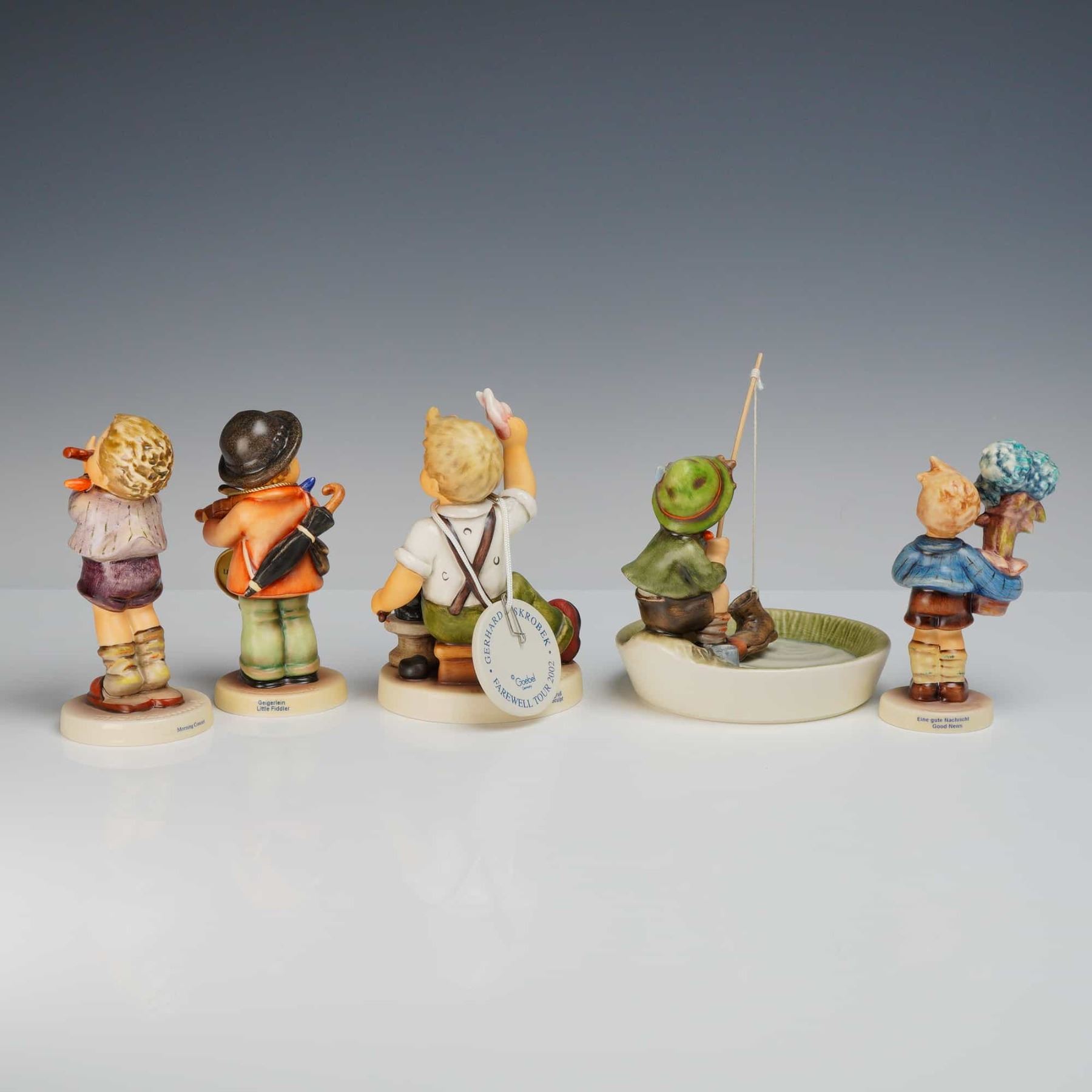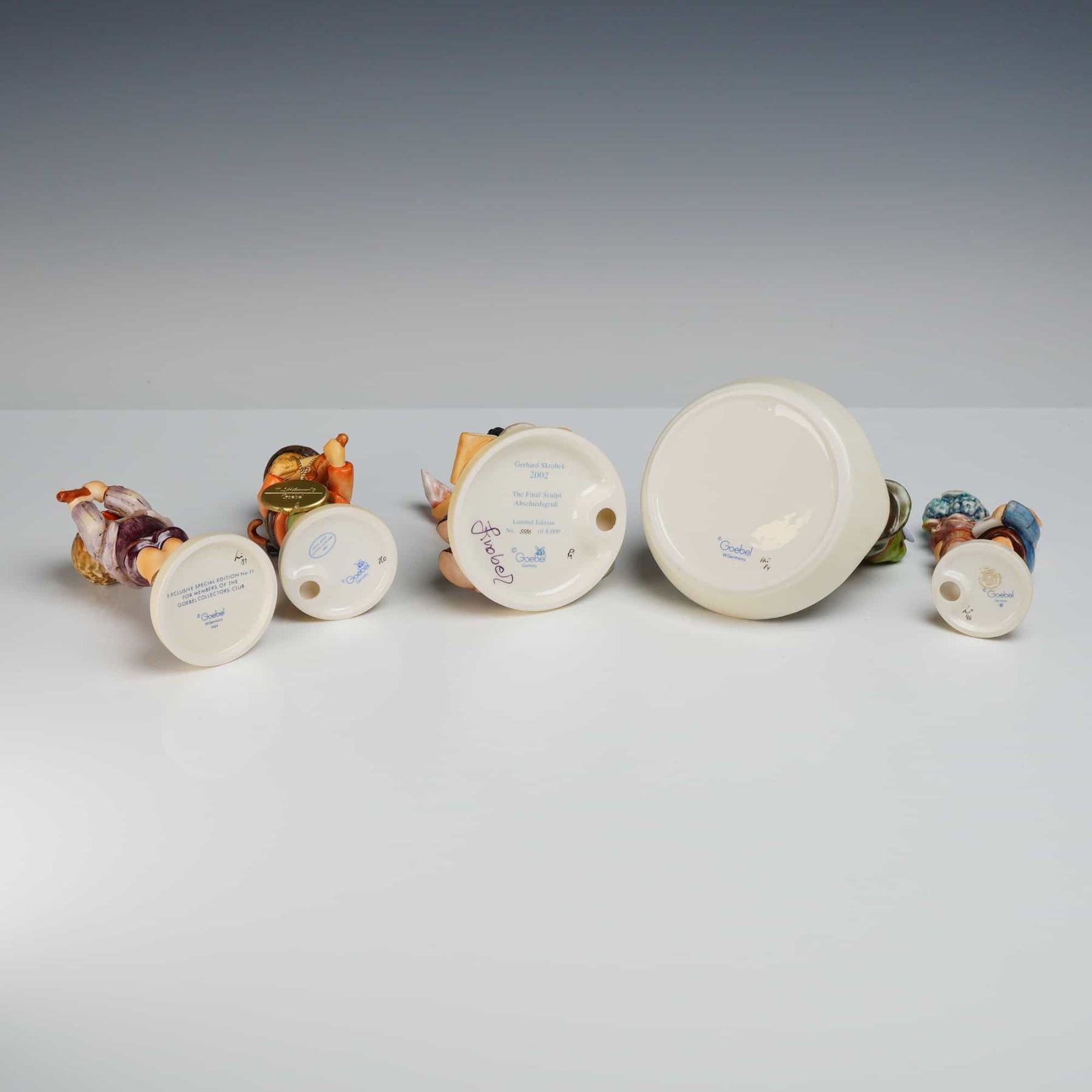 This collection consists of five hand-painted ceramic figurines manufactured by Goebel in the style of Sister Maria Innocentia Hummel. The group features various depictions of children in everyday scenes with a matte finish. The first figurine, titled Morning Concert, depicts a boy in a light purple jacket playing a recorder and is marked as an Exclusive Special Edition No. 11 for members of the Goebel Collectors Club with a 1984 copyright and incised number 450. The second figurine, titled Geigerlein or Little Fiddler, features a boy with a violin and black hat, bearing a Goebel West Germany stamp and a gold-toned M.I. Hummel medallion. The third piece, titled The Final Sculpt or Abschiedsgruß, is a limited edition shoemaker figurine numbered 5586 of 10,000, featuring the printed name Gerhard Skrobek, the year 2002, a bumblebee-in-V mark, and a cursive Goebel signature. The fourth figurine depicts a boy fishing into a circular basin and is marked with a Goebel West Germany stamp and the number 71. The fifth figurine, titled Eine gute Nachricht or Good News, shows a boy with a letter and a potted blue hydrangea, marked with a Goebel stamp, a crown-style mark, and numbers 96 and 10/I.