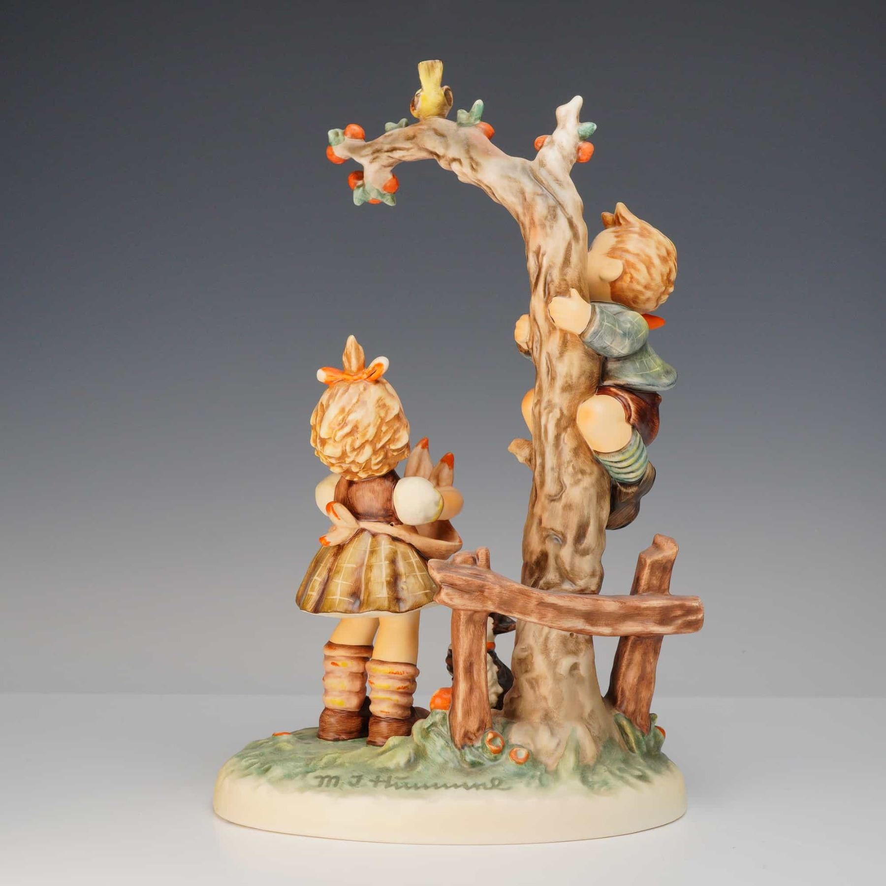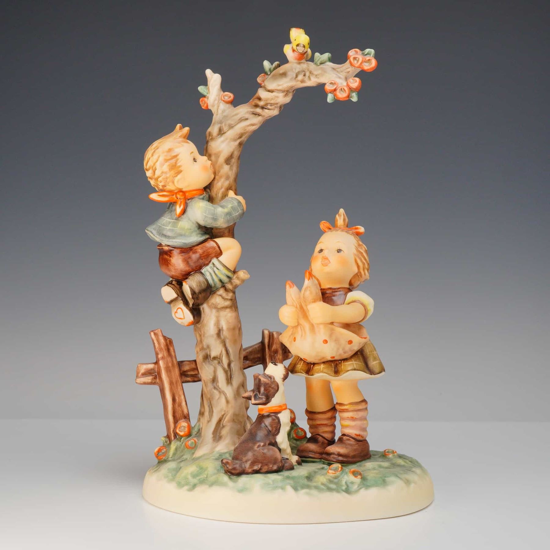 This large-scale hand-painted porcelain figurine is a premier piece from the Goebel M.I. Hummel Century Collection, titled Here's My Heart or Ein Herz für Dich. The vignette features a young boy in a green jacket and lederhosen climbing an apple tree toward a yellow bird, while a young girl in a dirndl stands below with her apron full of harvested apples. A small dog sits at the base of the tree near a rustic wooden fence. The underside is fully marked with the Goebel Germany factory mark, the Century Collection stamp dated 1998 with Roman numeral XX, and the dual-language title. The base includes the incised mold number 383 and KIS, along with a hand-painted decorator mark. This hum figurine is a significant addition to any collection of fine German porcelain. Height: 10.5 inches.