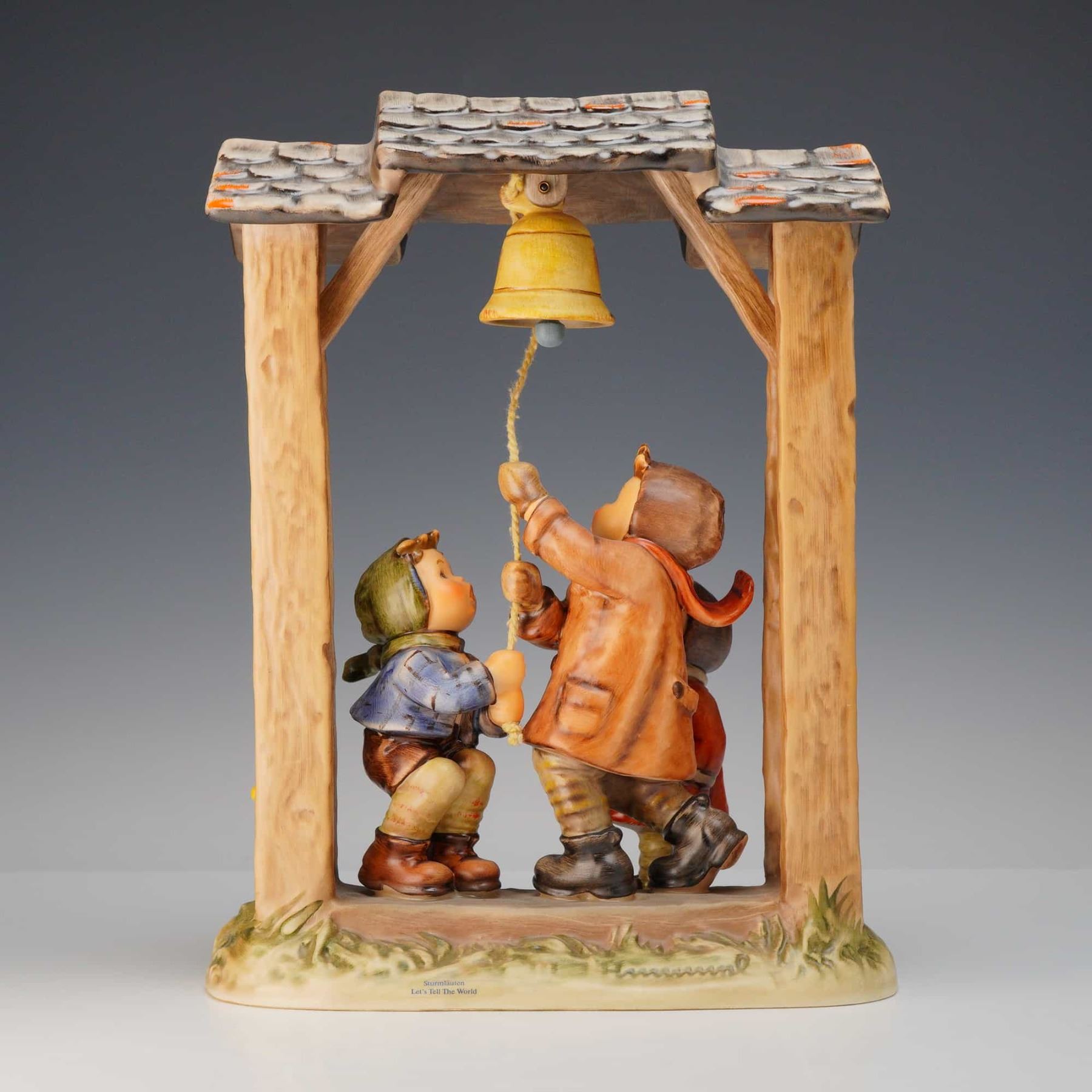 This large-scale Goebel Hummel figurine, titled "Let's Tell The World" (German title: Sturmläuten), is a premier piece from the XX Century Collection. Crafted in hand-painted glazed ceramic, the scene depicts three children in traditional winter clothing within a rustic wooden belfry, actively ringing a large yellow bell. This specific example features the TMK-7 "Goebel W. Germany" blue trademark stamp alongside the "M.I. Hummel 1990 XX Century Collection" commemorative mark, celebrating 55 years of production. The underside is stamped with model number VOS 333 (cataloged as Hummel 487) and includes the artist's mark "wi" in dark ink. A title decal is present on the front edge of the base. Height: 10.5 inches.