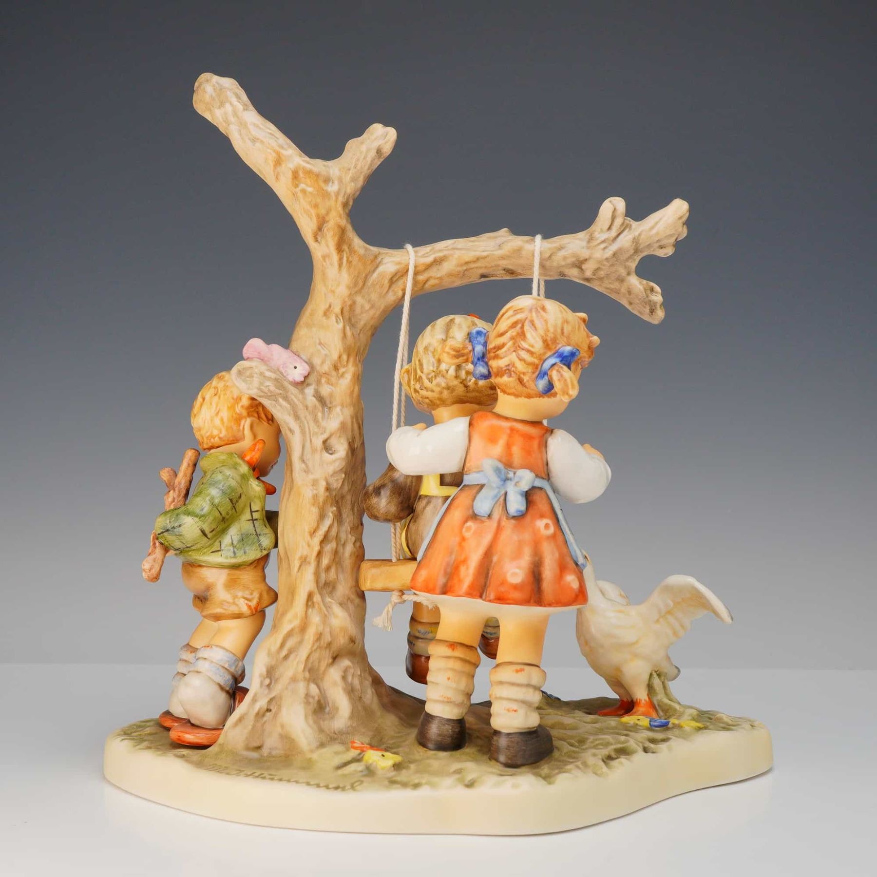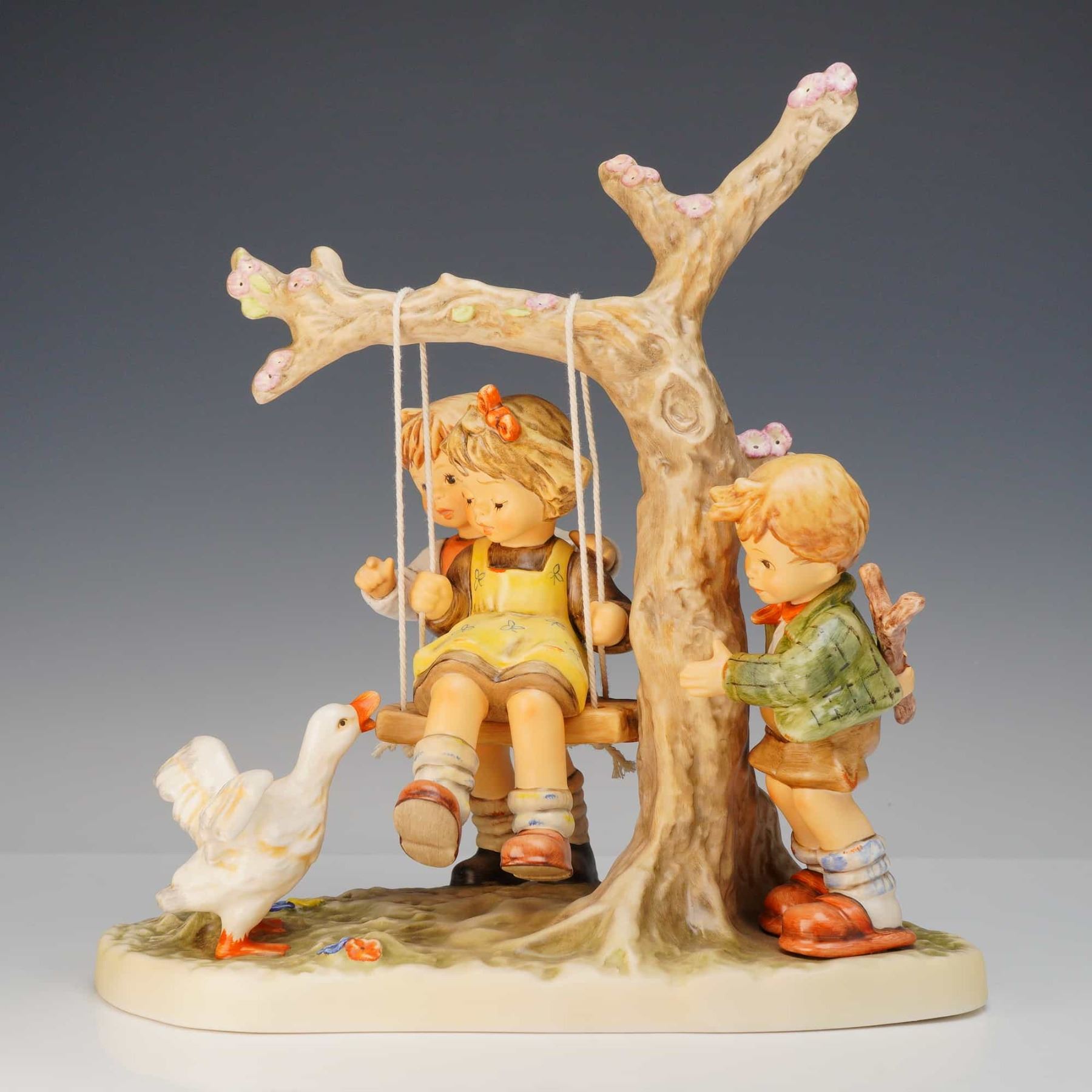 This is a large Goebel M.I. Hummel hand-painted porcelain figurine grouping titled Hey, tu mir nix / Can I Play? from the Moments in Time collection, model HUM 2097. The intricate scene depicts four children and a goose in a pastoral setting, with two children on a rope swing suspended from a blossoming tree. The underside features the blue Goebel bumblebee factory mark, the Moments in Time 2006 XXI collection stamp, and the title in both German and English. It includes a stamped M.I. Hummel signature, an incised signature on the base, and a hand-painted artist mark. This piece is a limited edition, hand-numbered 2322 of 3,000. Height: 9.5 inches.