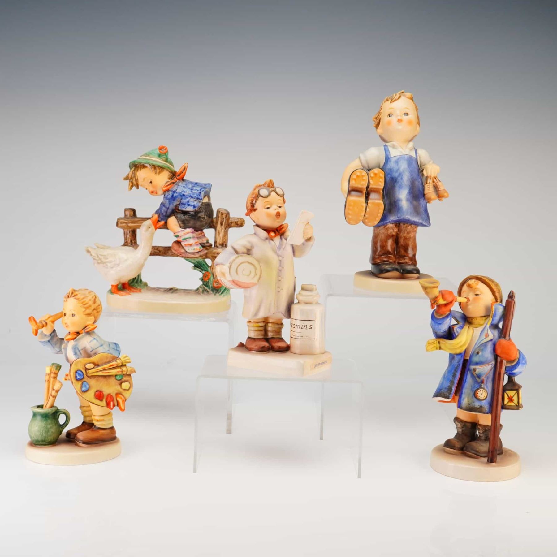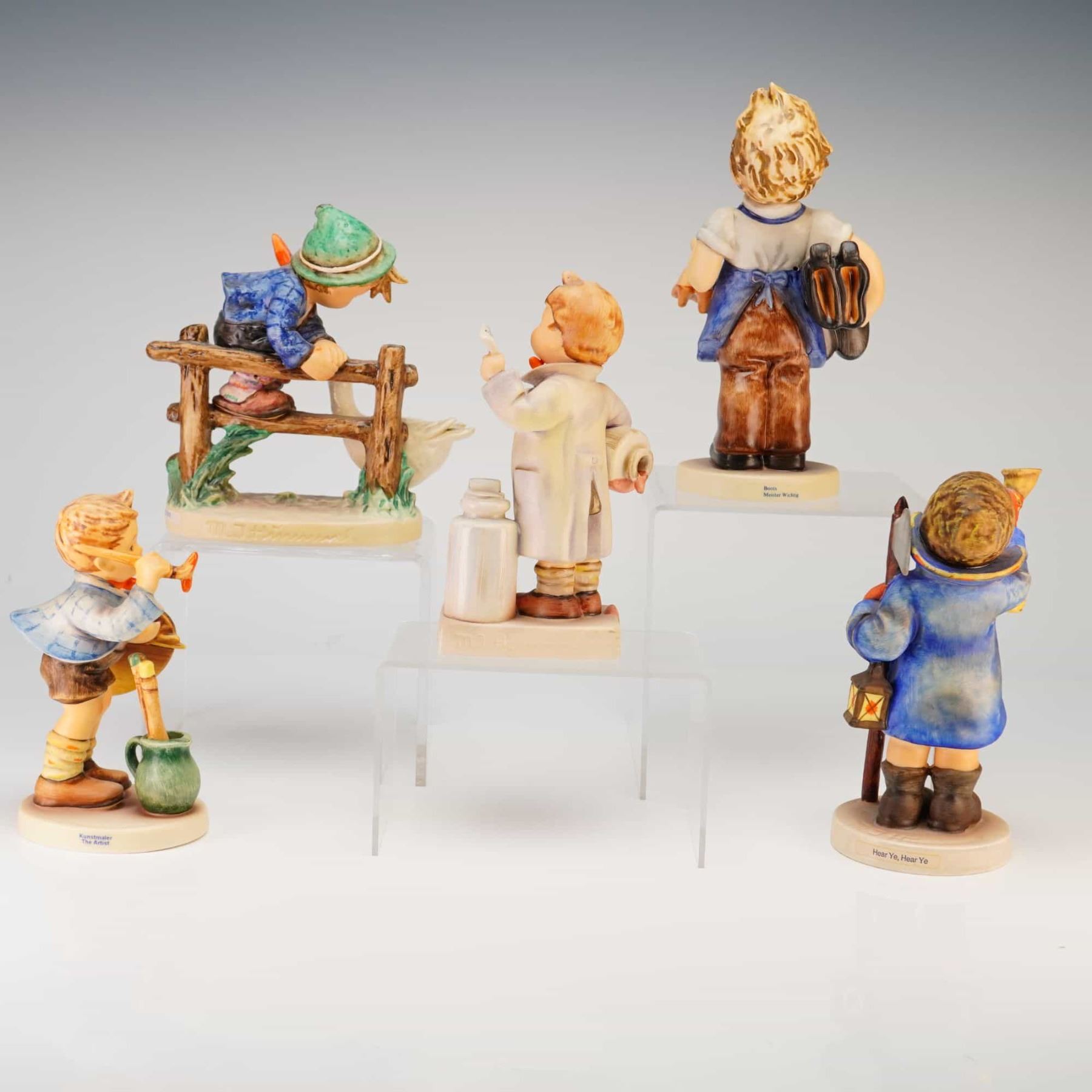 This collection consists of five hand-painted ceramic figurines produced by Goebel in Germany, featuring the designs of M.I. Hummel. The assortment includes various children in traditional roles and scenes, characterized by a matte glaze finish. The Artist (Kunstmaler) depicts a boy with a palette and brush, marked with incised number 311 and a Goebel Germany stamp with handwritten date 01. Barnyard Hero features a boy on a fence with a goose, bearing incised marks 195/I and 1948 with a Goebel W. Germany stamp and handwritten date 82. Little Pharmacist shows a boy in a lab coat with a vitamin bottle, marked with a Goebel W. Germany stamp and handwritten date 81. Boots (Meister Wichtig) portrays a boy carrying oversized footwear, featuring gold script labeling on the base and a Goebel mark partially obscured by a paper label. Hear Ye, Hear Ye depicts a night watchman with a lantern and horn, marked with a Goebel W. Germany stamp and handwritten date 81. These pieces represent the classic hum style popular in the mid-to-late 20th century.