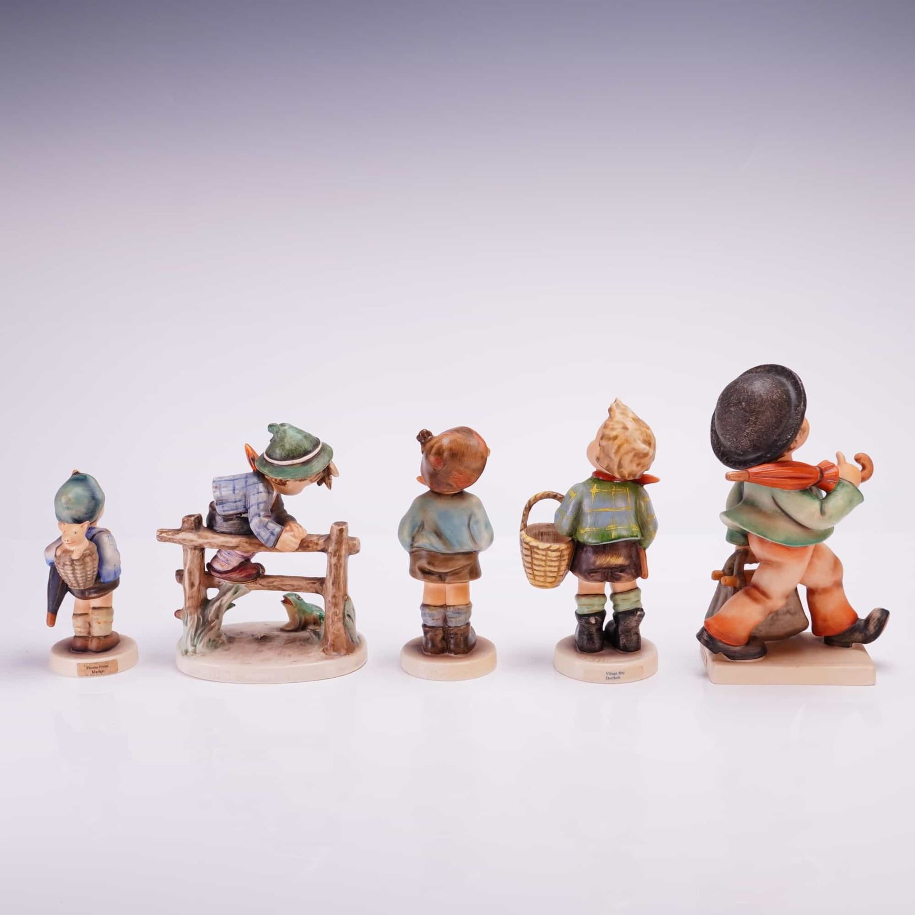 Porcelain figurines manufactured by Goebel, featuring the designs of M.I. Hummel. The group depicts young boys in traditional Alpine attire, including lederhosen and feathered caps, in various poses such as climbing a wooden fence, carrying a wicker basket, or holding a walking stick and umbrella. The underside of each base features the Goebel W. Germany backstamp, with several displaying the stylized bee trademark and incised model numbers. Identifying text on the bases of two figures includes Home from Market and Village Boy. Measurement is for largest item.