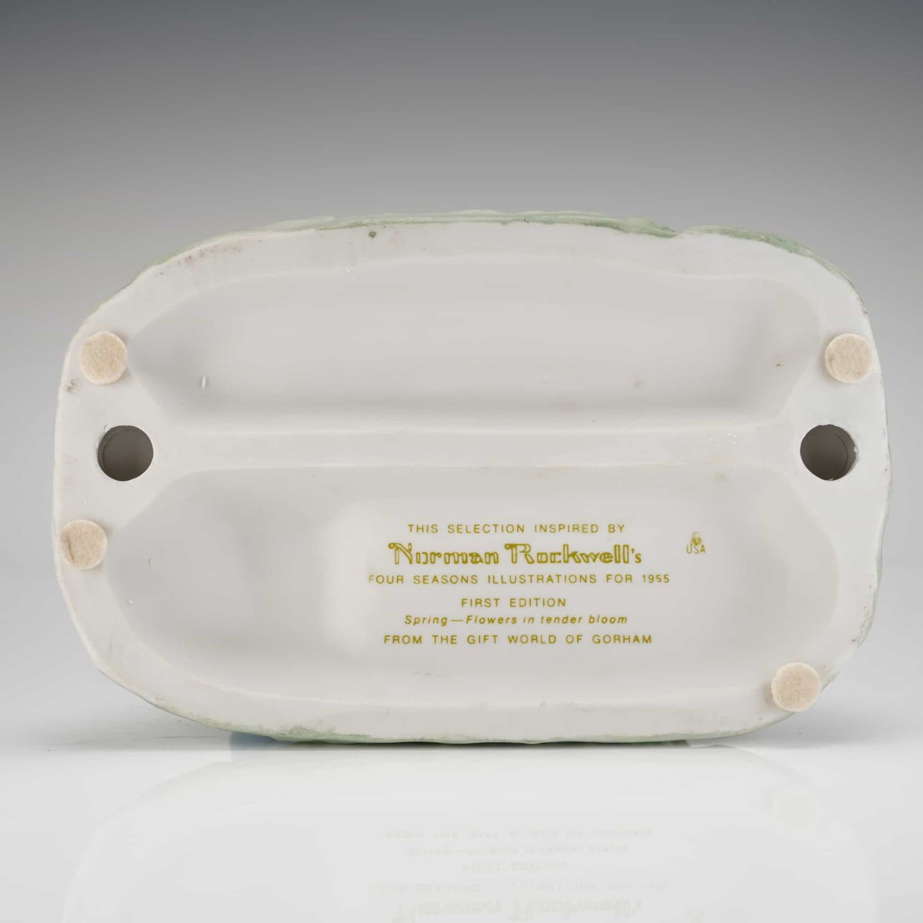 A single glazed ceramic figural group manufactured by Gorham, inspired by the illustrations of Norman Rockwell. The piece is commonly known as Sweet Song So Young, and is specifically marked as Spring¢â‚¬ÂFlowers in tender bloom from the Four Seasons Illustrations for 1955 series. The figurine depicts a barefoot boy in blue overalls playing a flute, seated beside a girl in a white dress, resting on a grassy mound. The scene includes two brown rabbits, two fox heads emerging from the foliage, and a white and blue goose. The piece features both matte and glazed finishes. The base is incised with the signature Norman Rockwell. The underside is marked THIS SELECTION INSPIRED BY NORMAN ROCKWELLS FOUR SEASONS ILLUSTRATIONS FOR 1955 FIRST EDITION Spring¢â‚¬ÂFlowers in tender bloom FROM THE GIFT WORLD OF GORHAM.