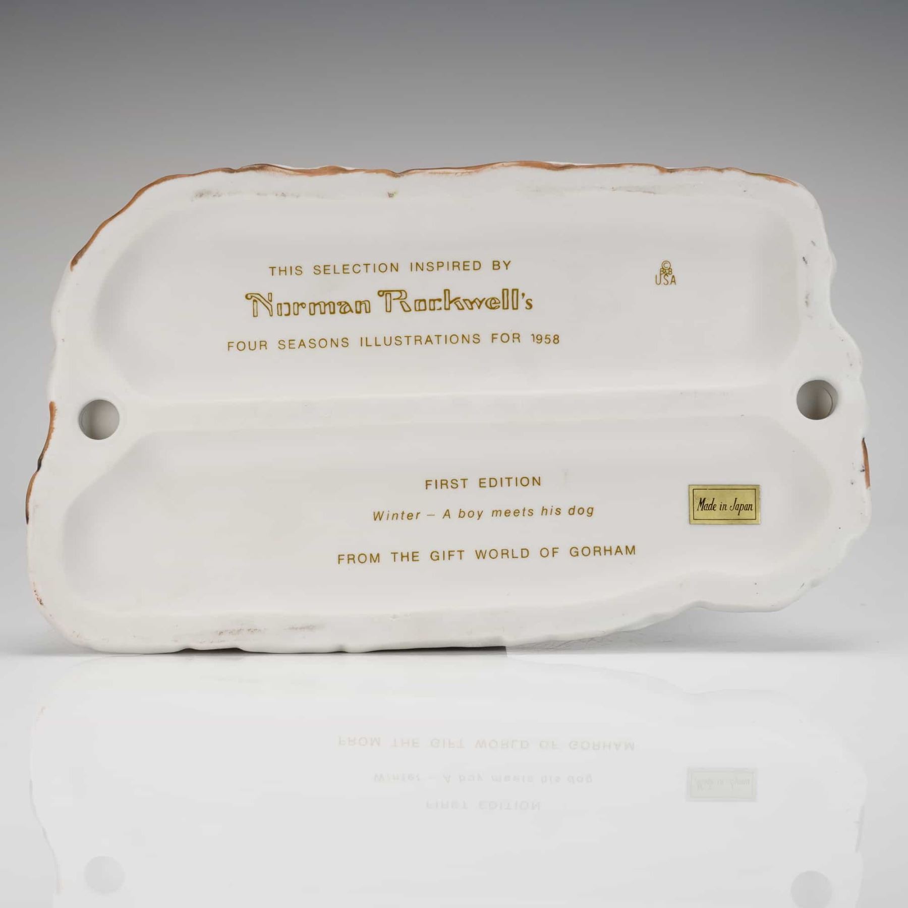 A single collectible figurine manufactured by Gorham, titled A Boy Meets His Dog and inspired by Norman Rockwells Four Seasons Illustrations for 1958. This Gorham A Boy Meets His Dog figurine is crafted from polychrome glazed ceramic, depicting a winter scene where a young boy, wearing a plaid shirt and knit cap, kneels beside a wooden crate containing a Beagle puppy. The crate prominently displays a sign reading DOG FOR SALE. The base is modeled as a snow-covered ground. The underside of the figurine features impressed text Norman Rockwell and printed markings identifying the piece as a FIRST EDITION titled Winter ¢â‚¬ A boy meets his dog, manufactured FROM THE GIFT WORLD OF GORHAM. A sticker indicates the origin as Made in Japan.