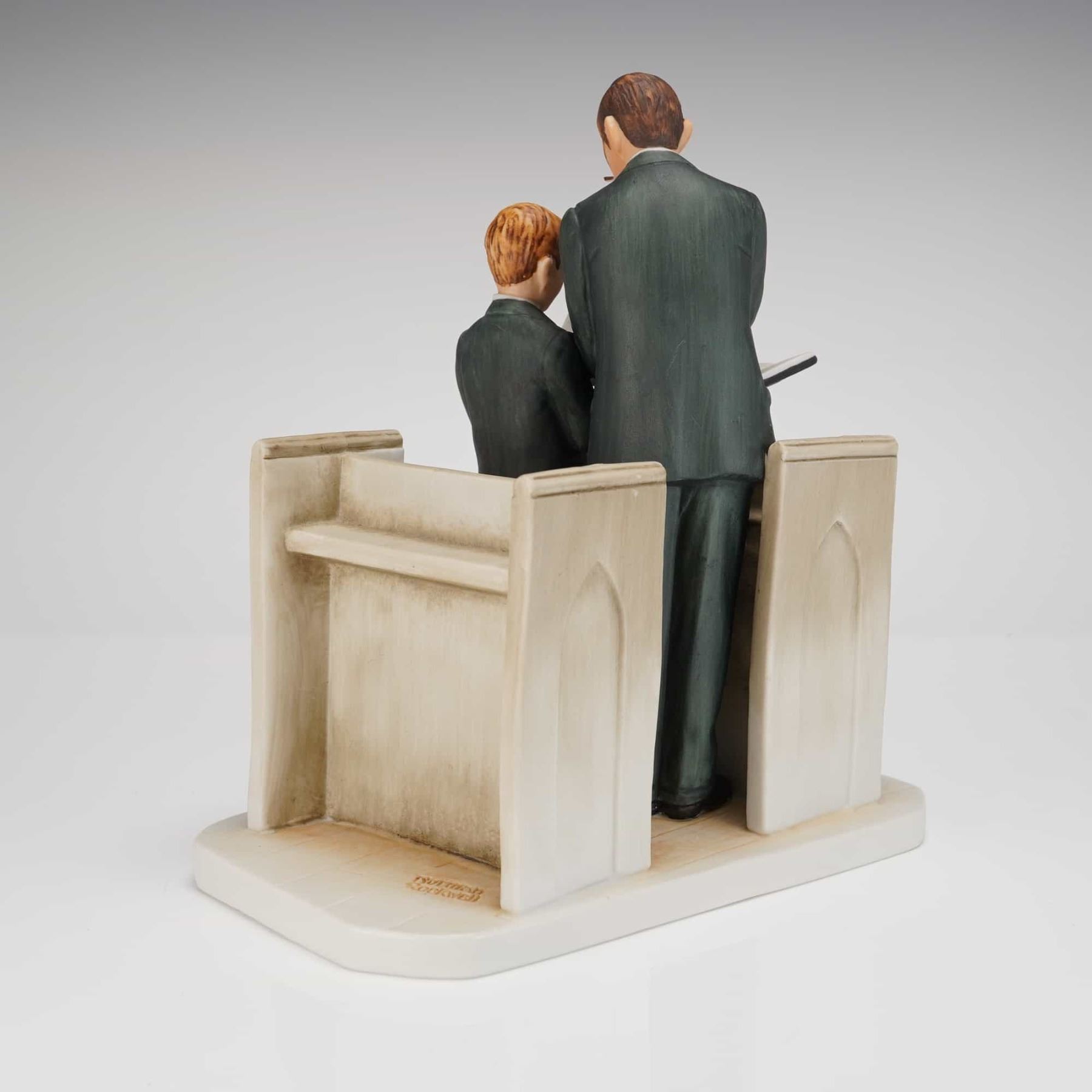 A limited edition painted ceramic figurine produced by Gorham, titled Spring ¢â‚¬ In His Spirit, inspired by Norman Rockwells Four Seasons Illustrations for the 1961 First Edition. The gorham in his spirit figurine depicts an adult male and a young boy, both dressed in dark suits, standing in a stylized beige church pew or booth with reddish-orange cushioned seats, looking down at open books. The piece is inspired by the sentimental style of American illustration art. The base is marked with the production details: This selection inspired by Norman Rockwells Four Seasons Illustrations for 1961 First Edition Spring ¢â‚¬ In His Spirit From the Gift World of Gorham. The base is numbered 0625 / 2500 and bears a sticker confirming it as An Authentic GORHAM Product MADE IN JAPAN. The side of the base features an incised signature of Norman Rockwell.