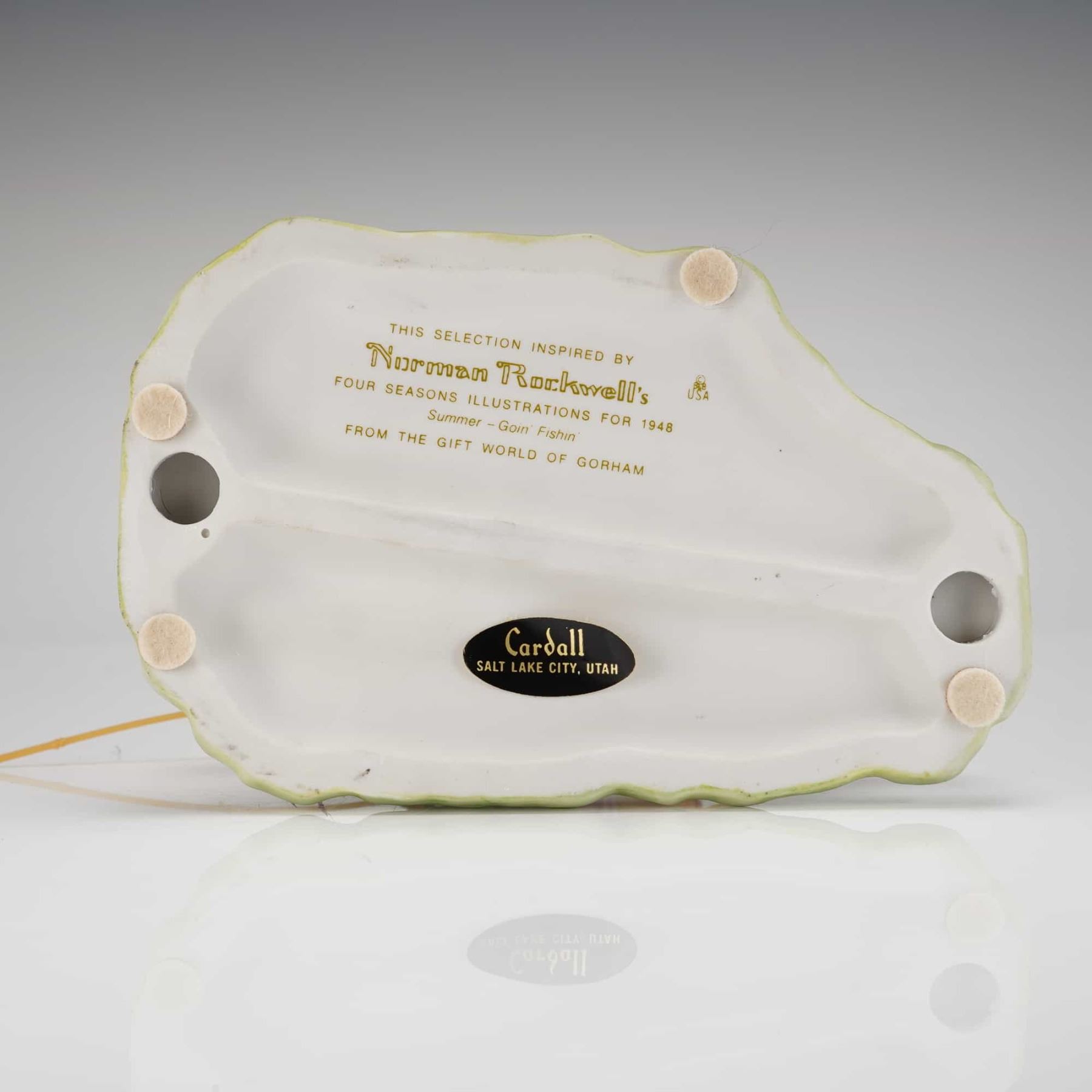 A Gorham porcelain figurine depicting the Norman Rockwell illustration & quot;Summer - Goin Fishin,& quot; part of the Four Seasons Illustrations for 1948. This polychrome painted figurine features an elderly man (grandpa) leaning on a stick, a young boy holding a straw hat, and a small brown and white dog investigating the sculpted green grassy base. The composition captures the nostalgic narrative of a boy and his grandfather going fishing. This highly recognizable Gorham goin fishing figurine is marked on the underside: & quot;THIS SELECTION INSPIRED BY / Norman Rockwells / FOUR SEASONS ILLUSTRATIONS FOR 1948 / Summer - Goin Fishin / FROM THE GIFT WORLD OF GORHAM,& quot; along with a & quot;USA& quot; mark and a black retail label for & quot;Cardall / SALT LAKE CITY, UTAH.& quot; The base is also incised with the signature & quot;Norman Rockwell.& quot;