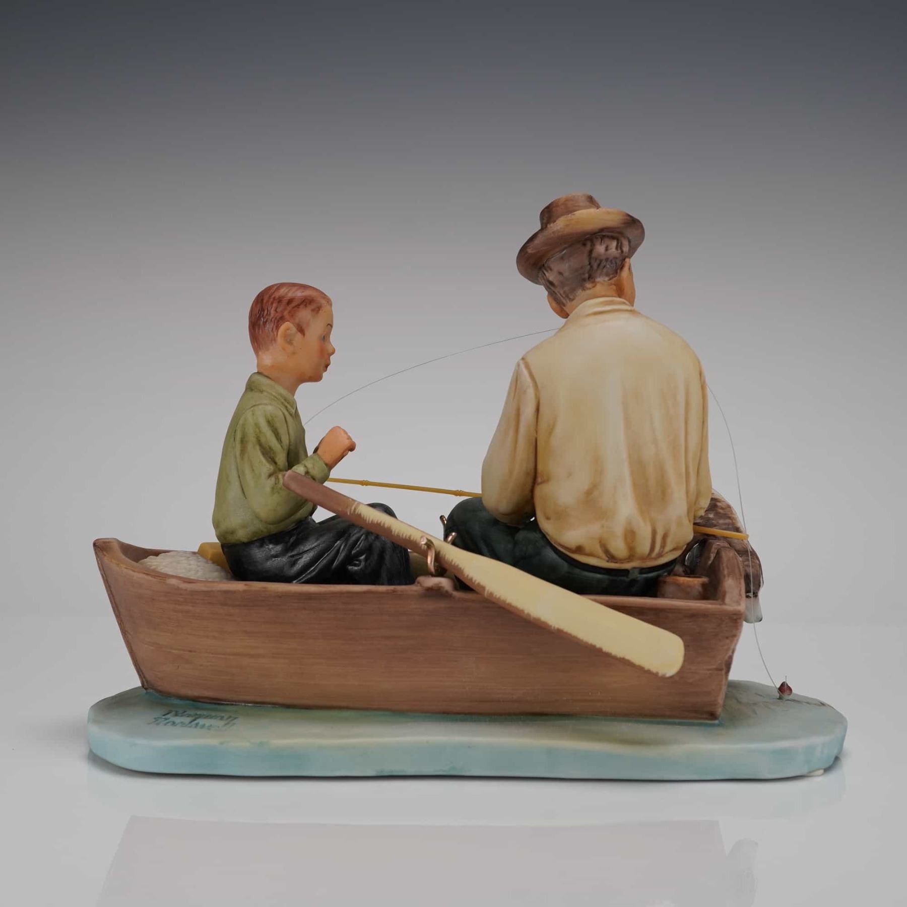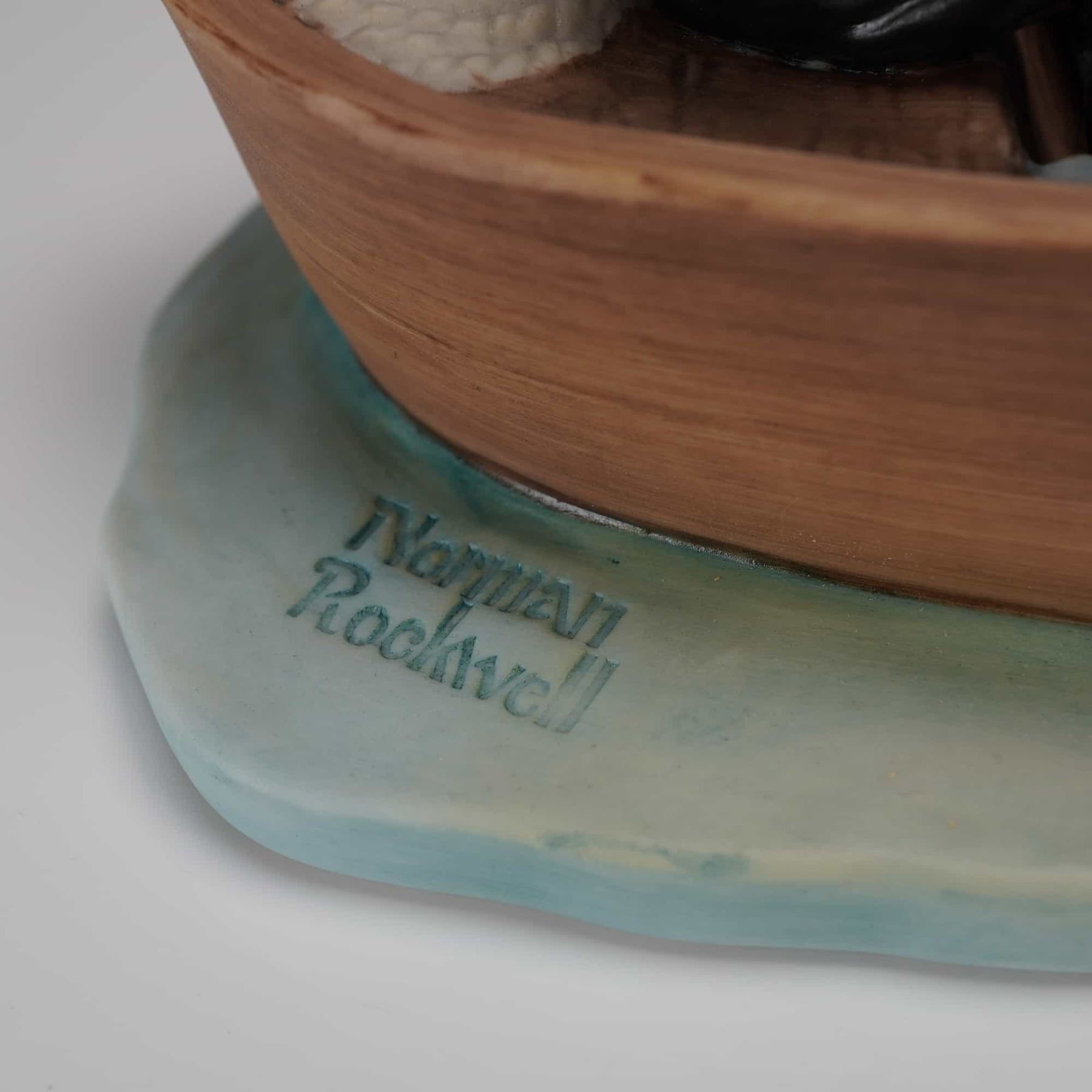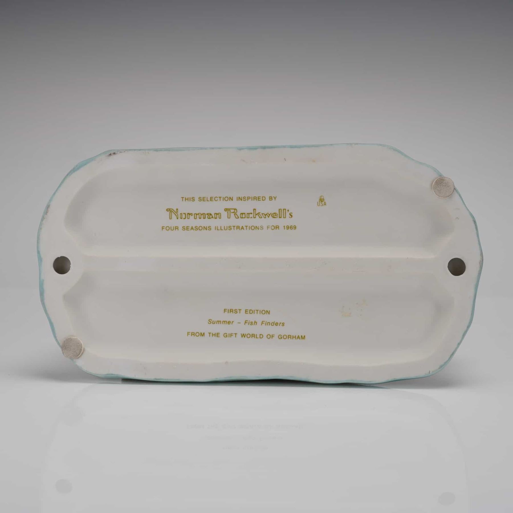 A single First Edition figural group titled Summer-Fish Finders Figurine, manufactured by Gorham. This porcelain or ceramic sculpture is inspired by Norman Rockwells Four Seasons Illustrations for 1969. The realistic composition depicts an older man, holding a catch, seated alongside a boy and a sleeping dog in a brown rowboat. The boat is mounted on a light blue base representing water. The side of the base is incised with the signature Norman Rockwell. The underside bears the text THIS SELECTION INSPIRED BY Norman Rockwells FOUR SEASONS ILLUSTRATIONS FOR 1969, USA, FIRST EDITION, Summer ¢â‚¬ Fish Finders, and FROM THE GIFT WORLD OF GORHAM.