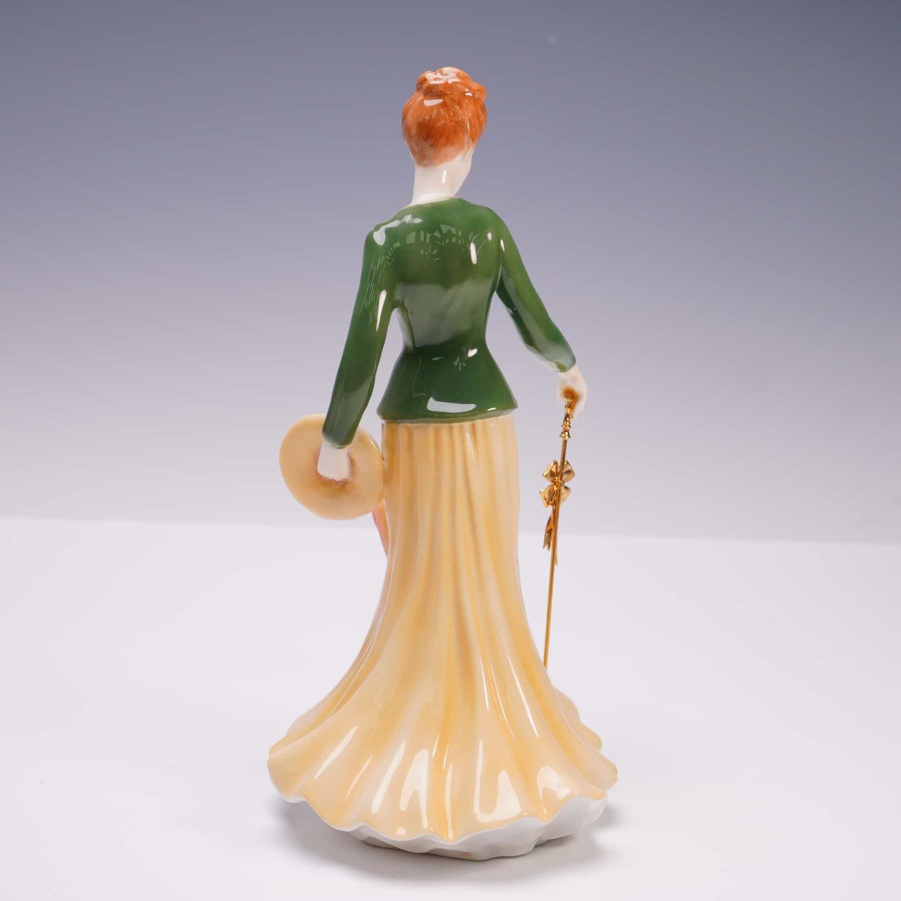 Royal Worcester bone china figurine titled Margaret, modeled by Richard Moore as the Premiere Figurine of 2000. This elegant piece features a refined woman with an upswept hairstyle, wearing a flowing golden skirt and green jacket while holding a pale hat and gilt-tipped cane. Fully marked to base. Measures approx. 9.25"H.