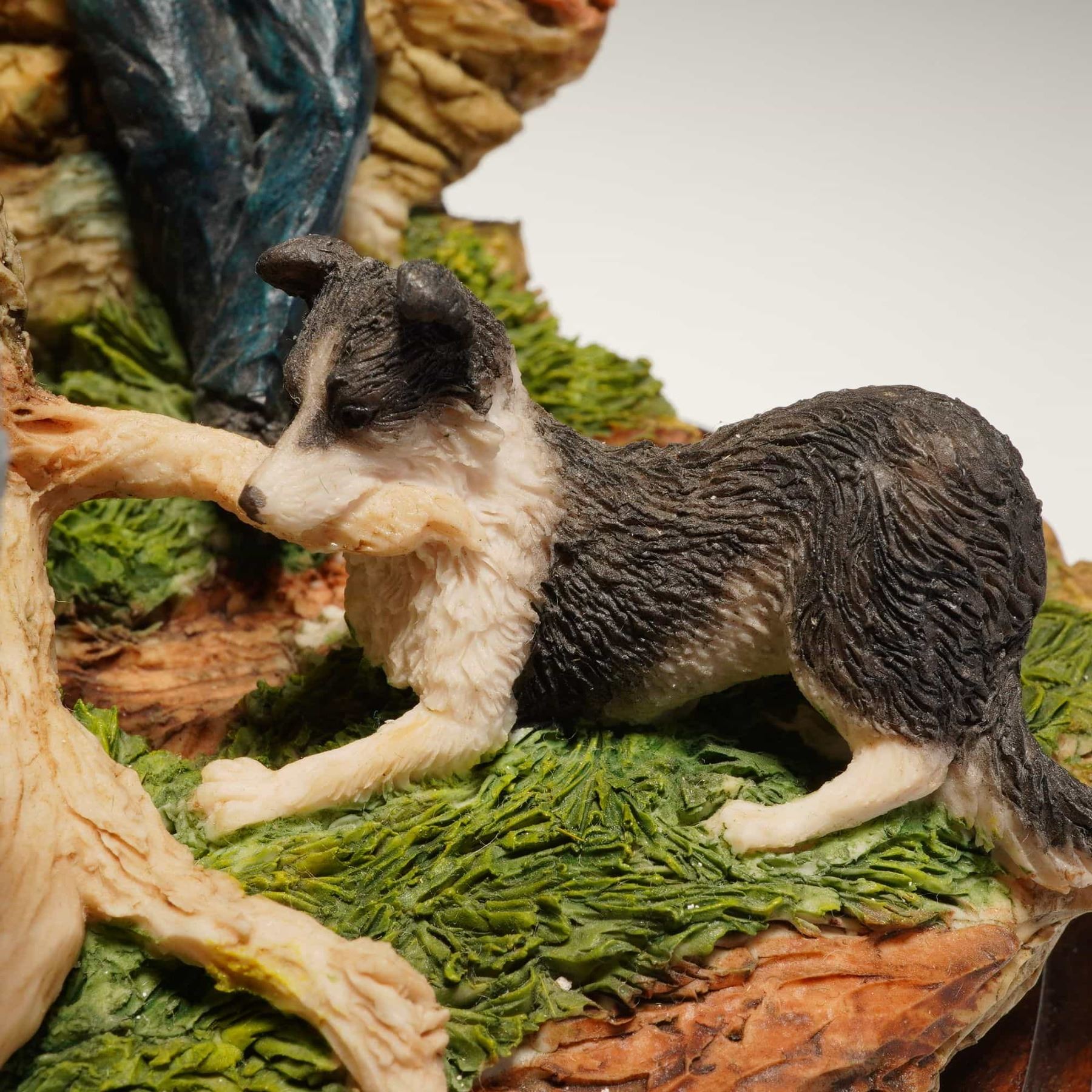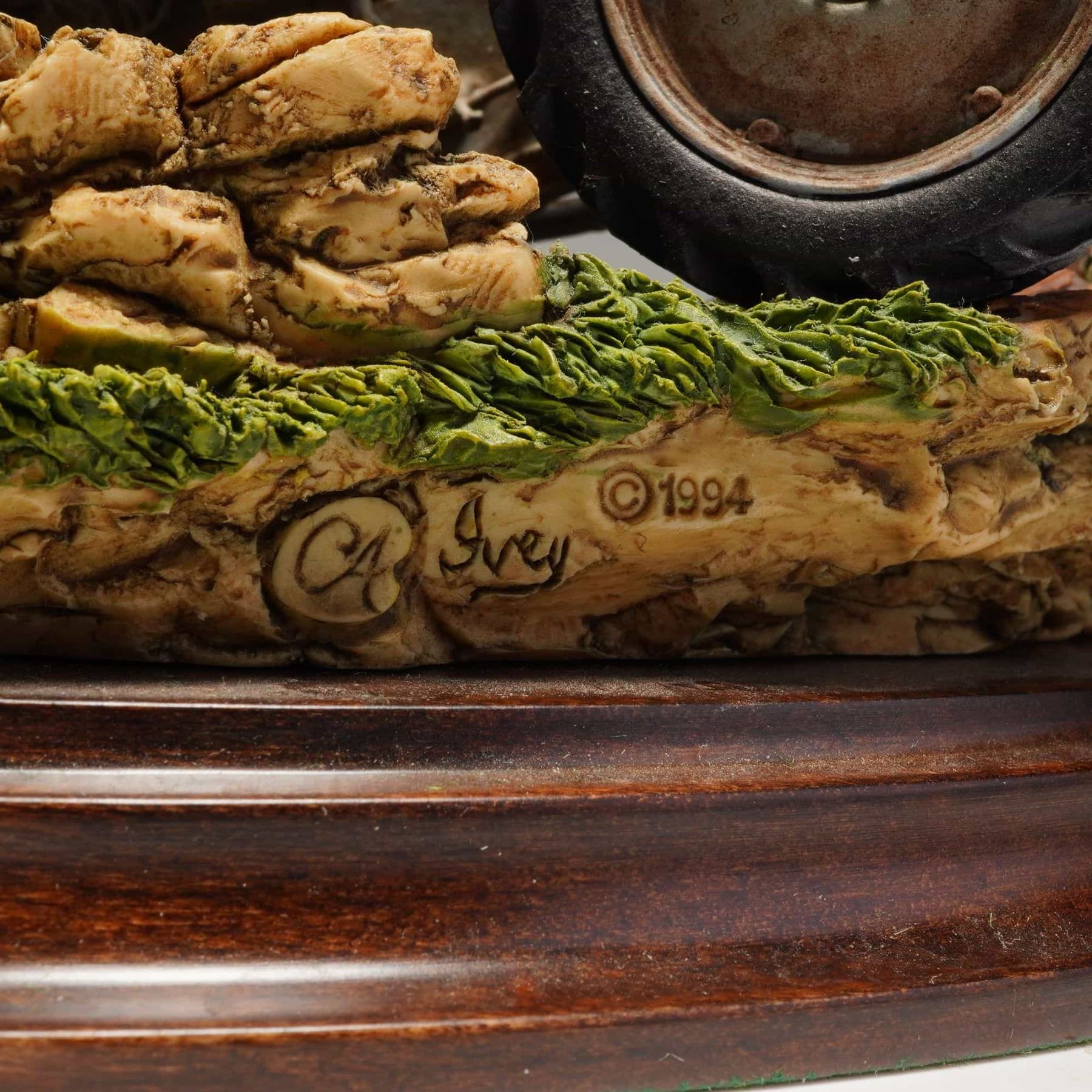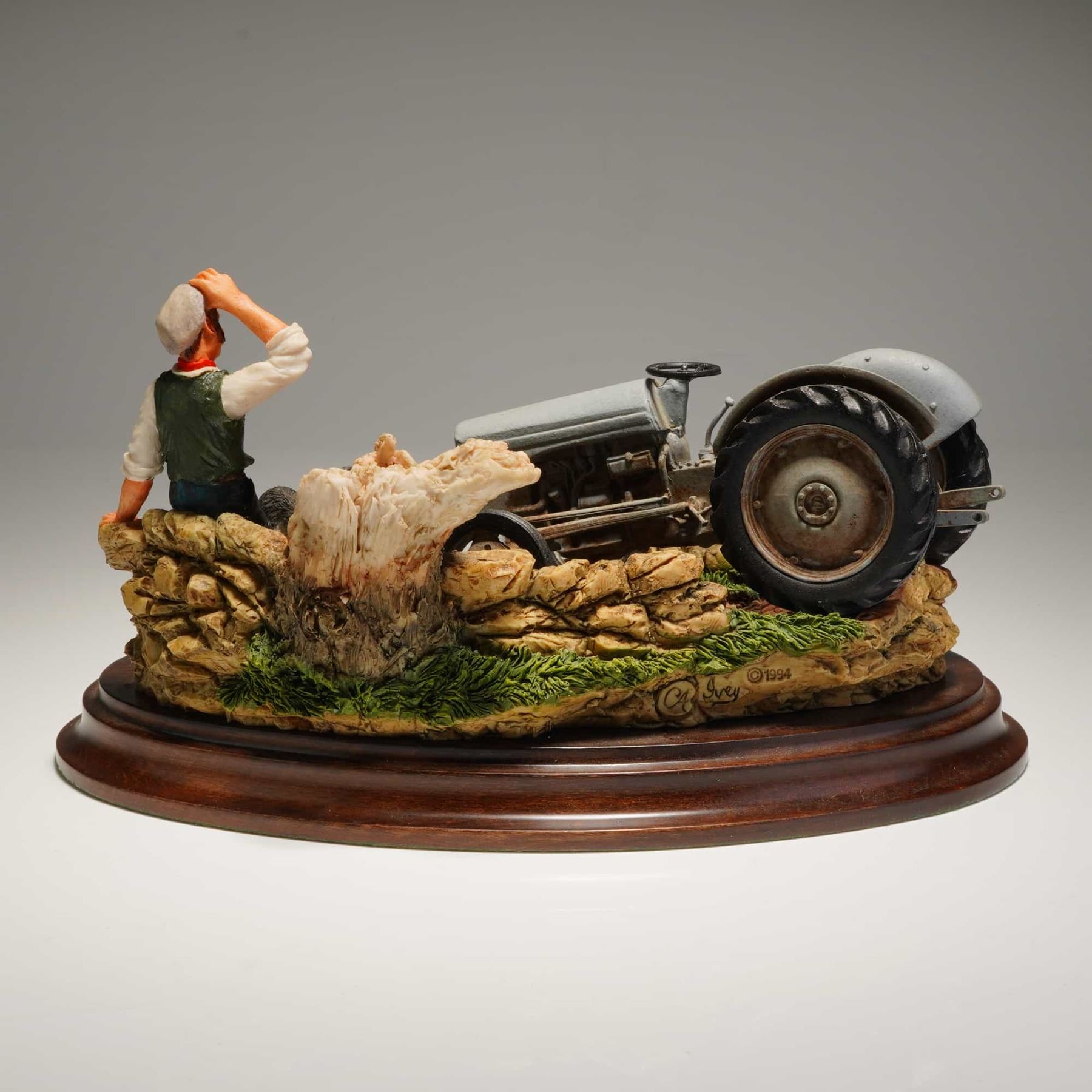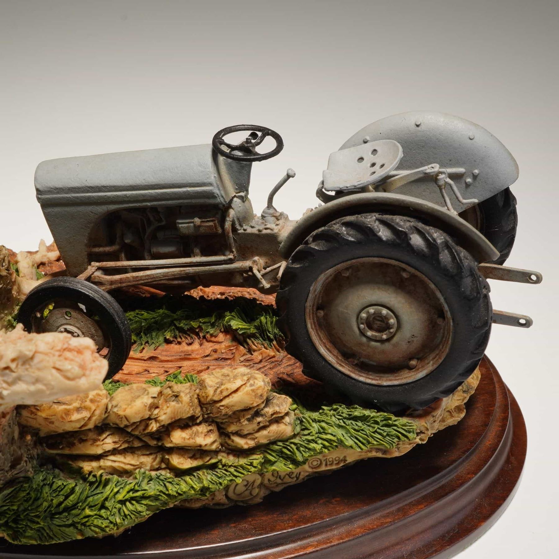 A Country Artists resin tableau CA 731 titled Helping Hand, depicting a hand-painted scene of a man, a border collie, and a grey tractor on a rocky base affixed to wooden base, inscribed 1994.