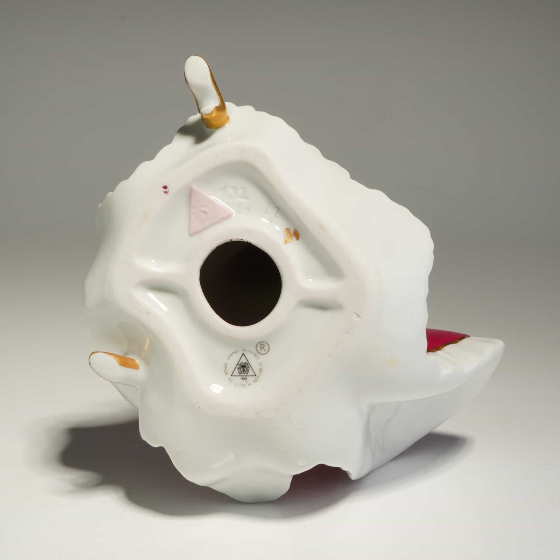 This hand-painted porcelain Royal Dux Bohemia figurine depicts a lady with hat in a stylized pose. The figure is shown wearing a burgundy full-length gown with white ruffled trim and gold-gilt accents. The subject features a wide-brimmed white hat and red hair. The underside of the base is marked with the Royal Dux pink triangle and a circular backstamp reading ROYAL DUX BOHEMIA / HAND PAINTED / MADE IN CZECH REPUBLIC. The base also contains impressed model numbers 132, 47, and 22.