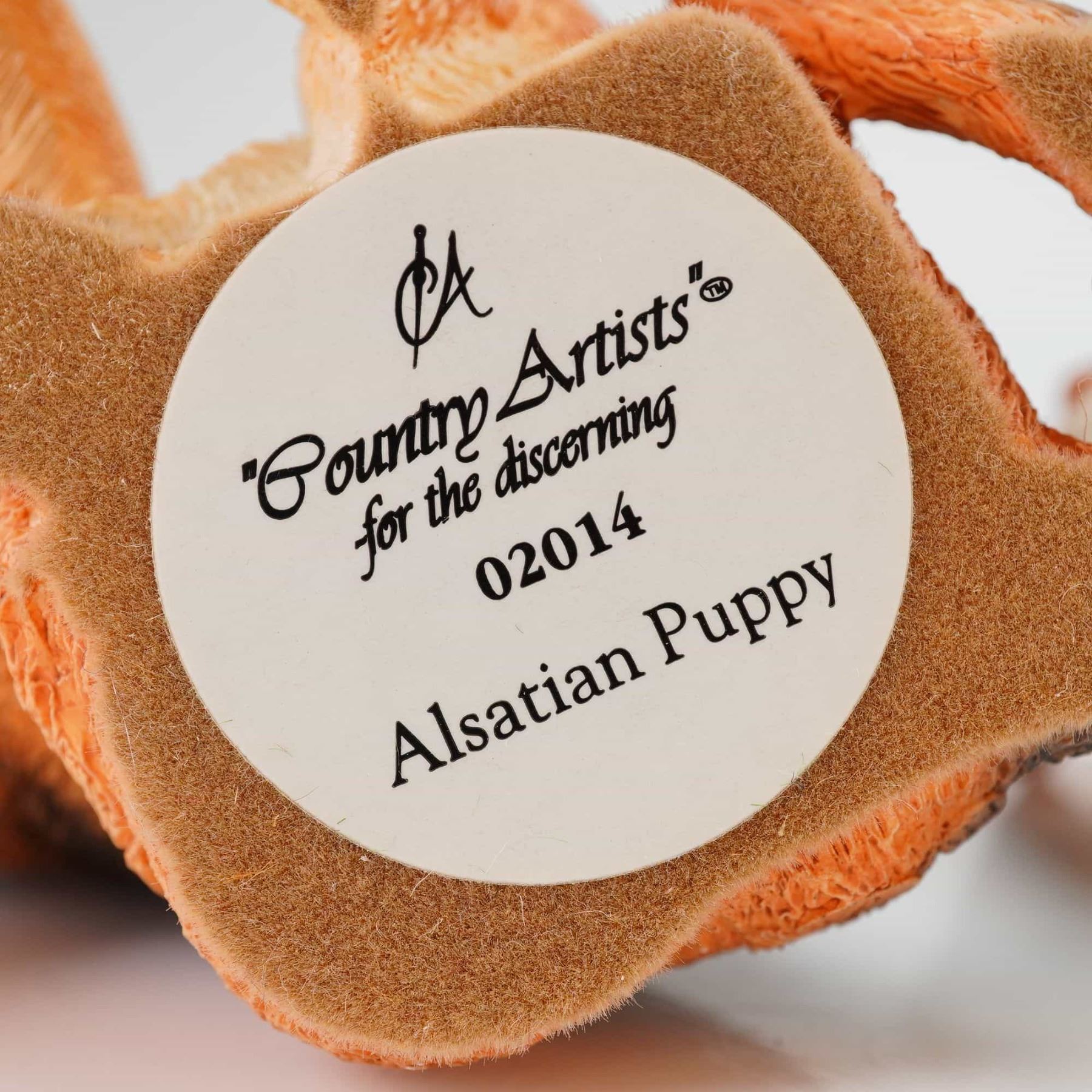 The collection includes an Alsatian puppy, a Dalmatian puppy, and a spaniel-type dog. Each figure is modeled with realistic fur textures and lifelike coloration. The Alsatian figure features a manufacturer label on the felt-lined base for Country Artists for the discerning, identifying it as model number 02014. The Dalmatian figure is embossed with a 2001 copyright mark and bears a Made in China sticker. The smallest figure, a spaniel, has a handwritten inventory sticker on the underside. All pieces include protective felt padding on their bases.