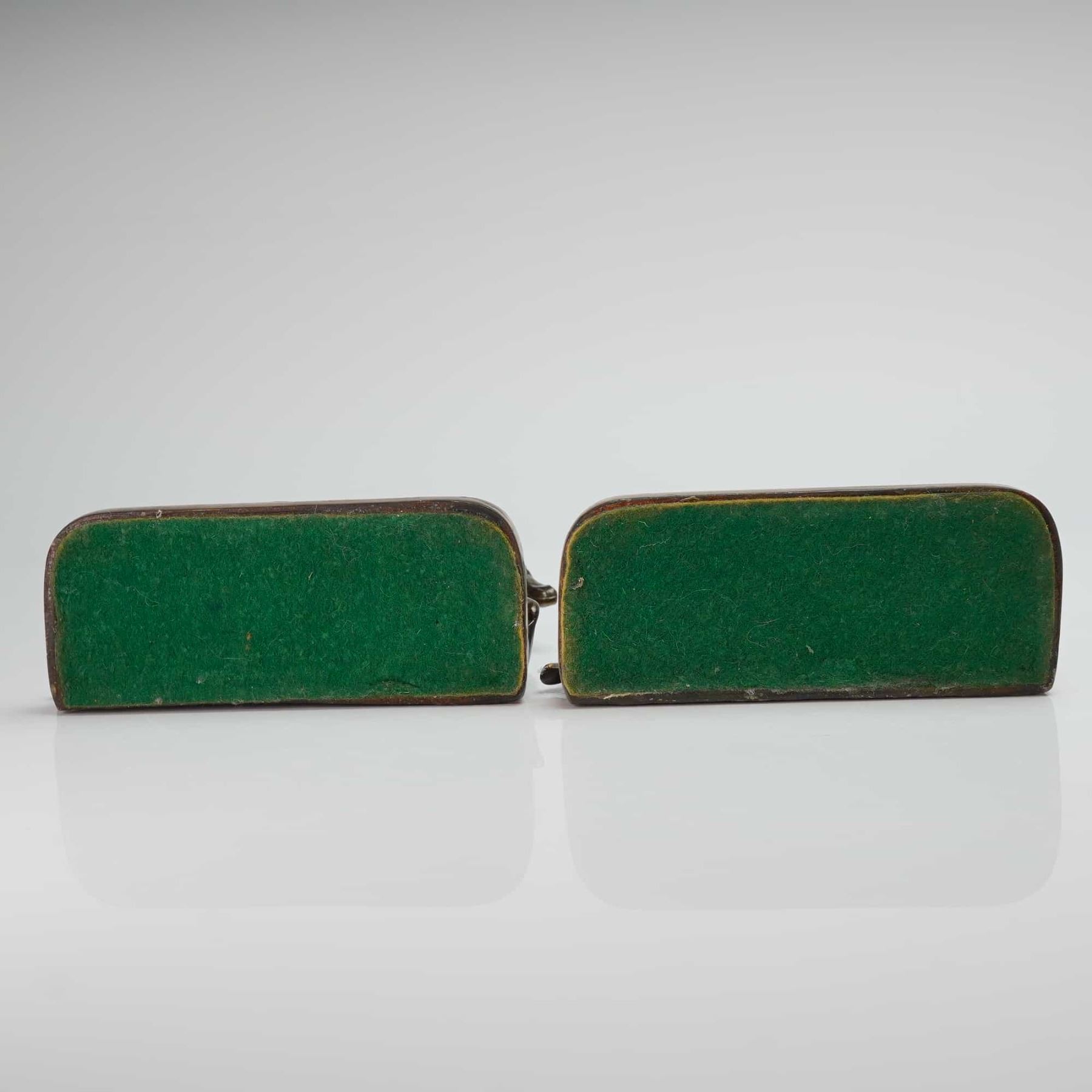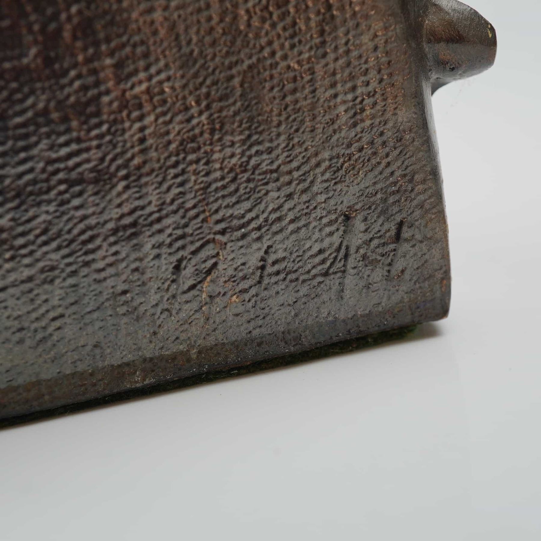 This pair of horse bookends features cast metal figures of running horses over stylized, textured mounds. Each piece is finished with a dark patina and exhibits gold-toned highlights on the raised edges and base. An incised signature is located on the reverse of the textured mounds. The figures are set upon weighted rectangular bases with green felt applied to the undersides.