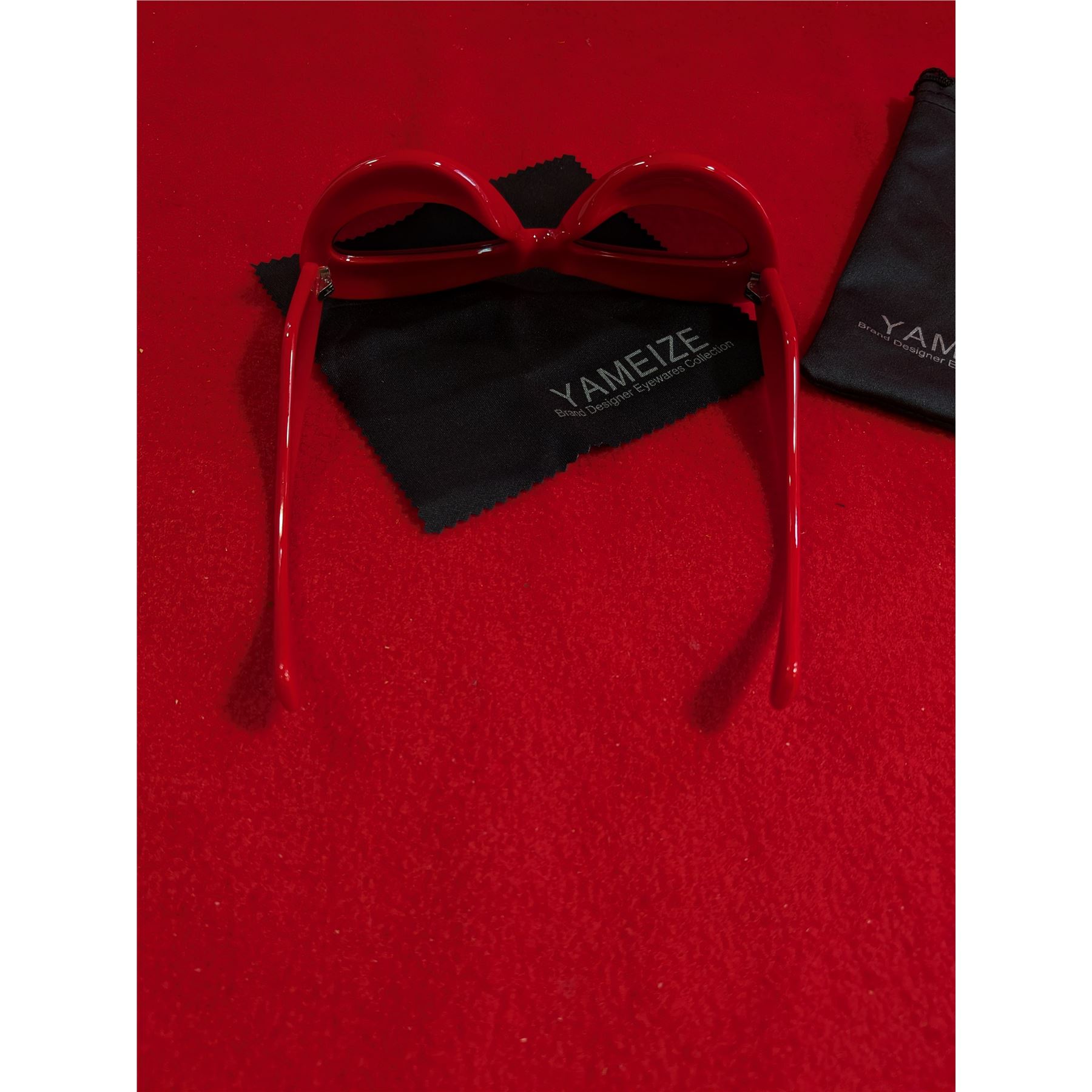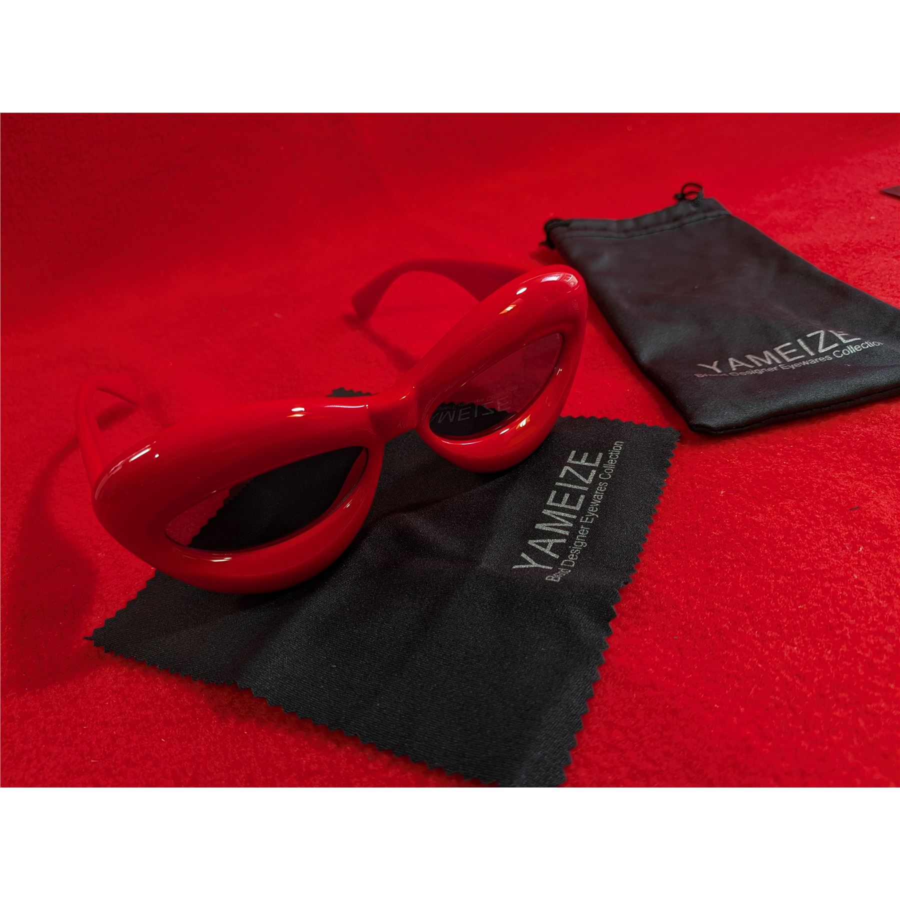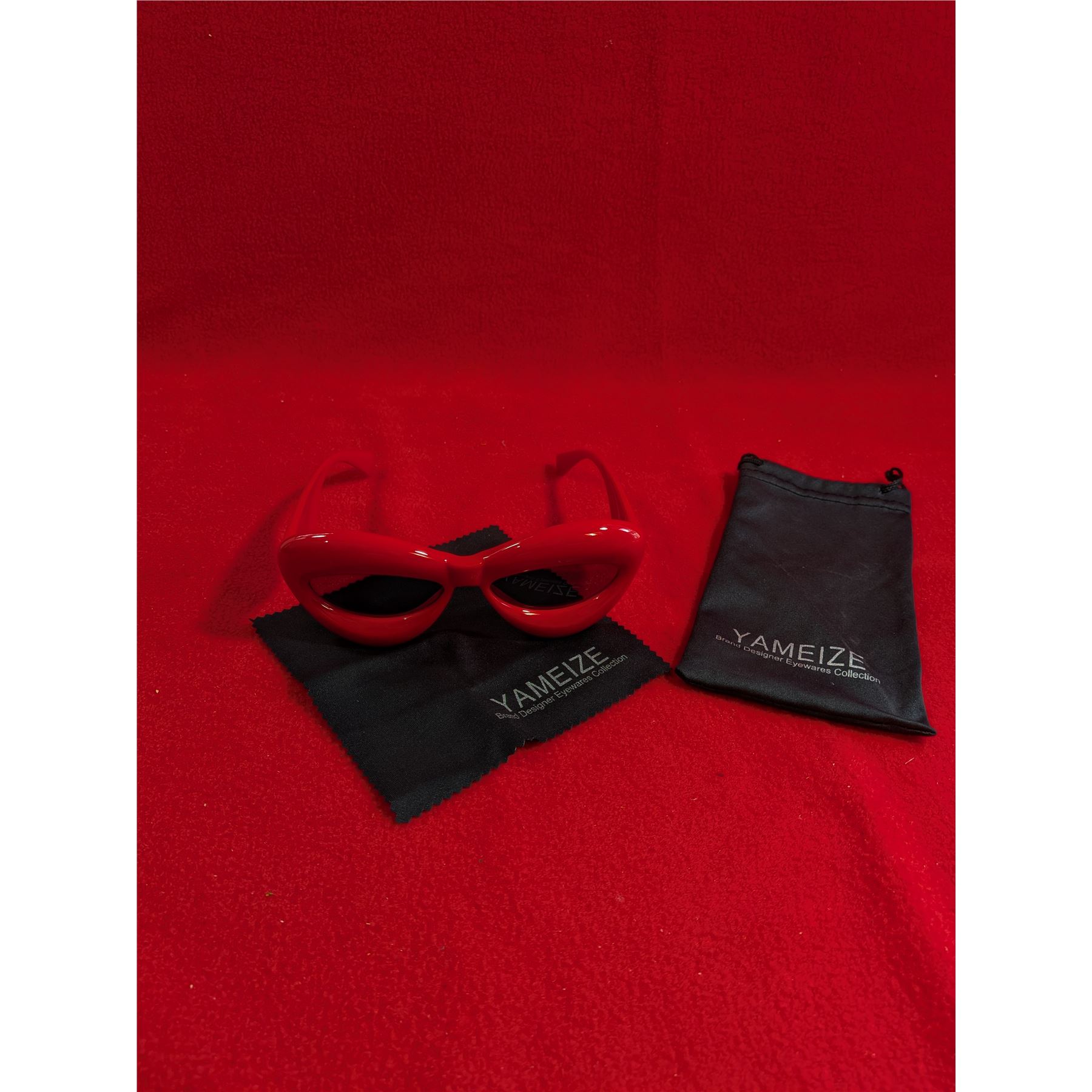 Yameize brand red lip-shaped sunglasses featuring an exaggerated, thick, inflated cat-eye frame.