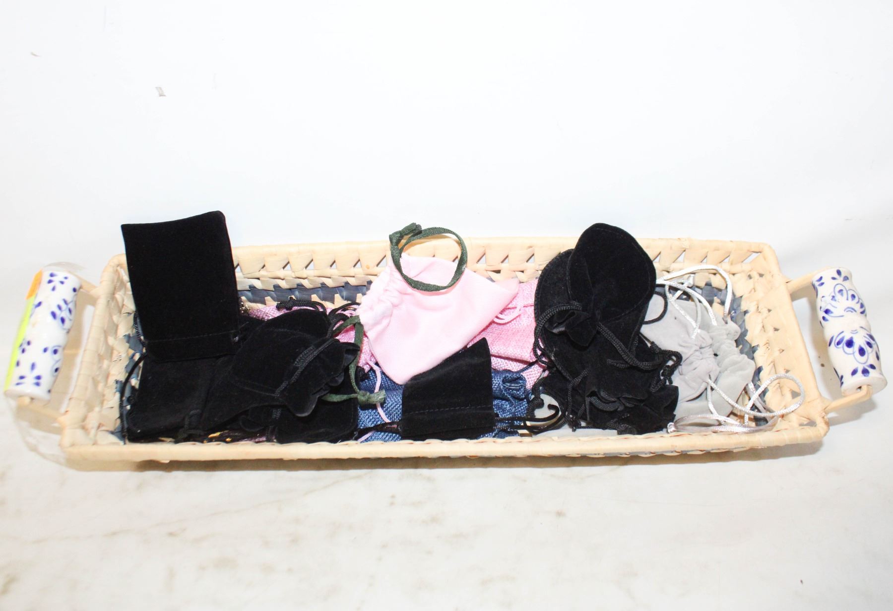 LOT OF 17 JEWELRY BAGS IN WICKER BASKET