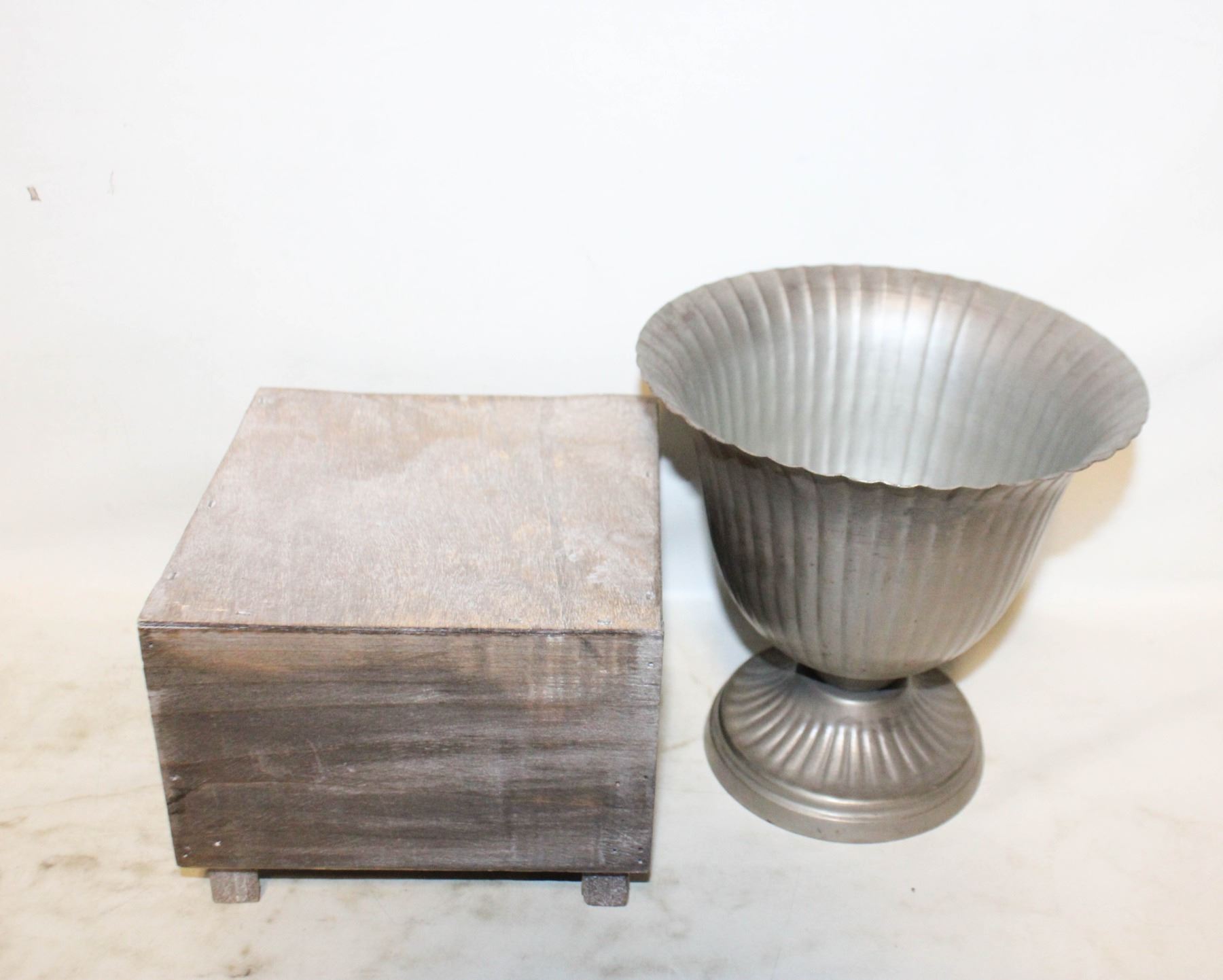 Lot 7301 VINTAGE WOOD DISPLAY RISER & METAL VASE