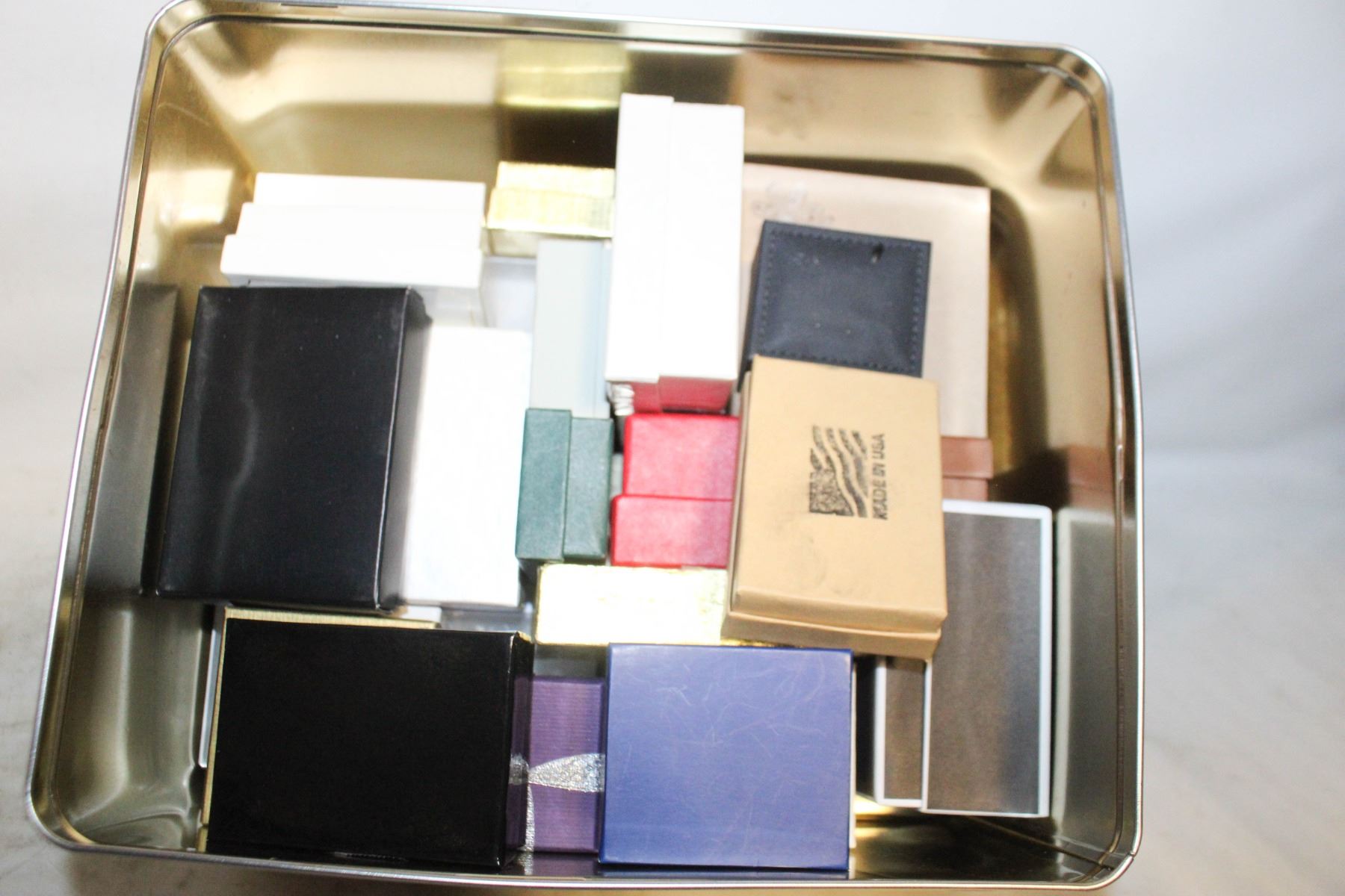 TIN FILLED WITH 28 EMPTY JEWELRY BOXES