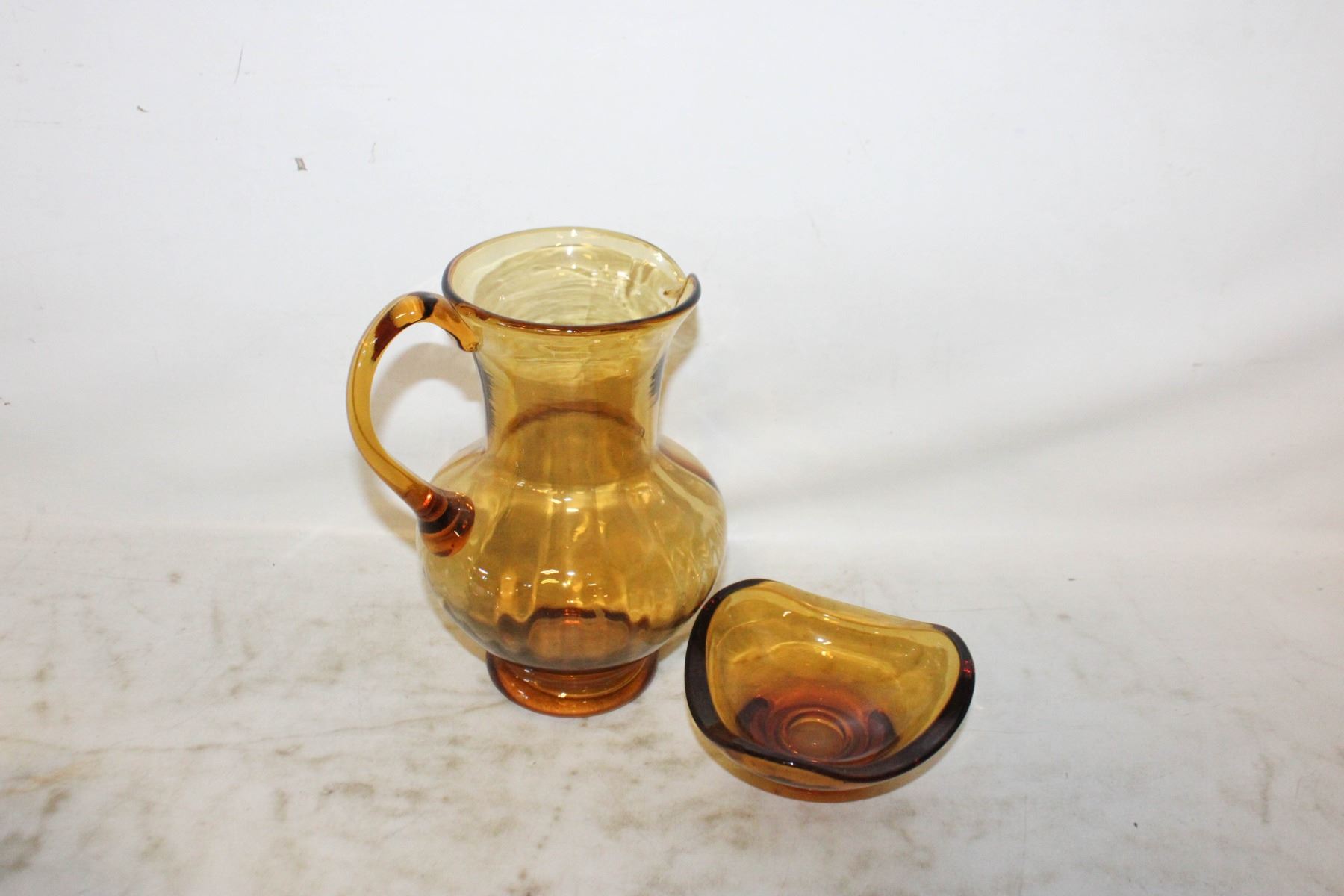 MCM AMBER HANDBLOWN PITCHER & TRICORN SHAPE BOWL