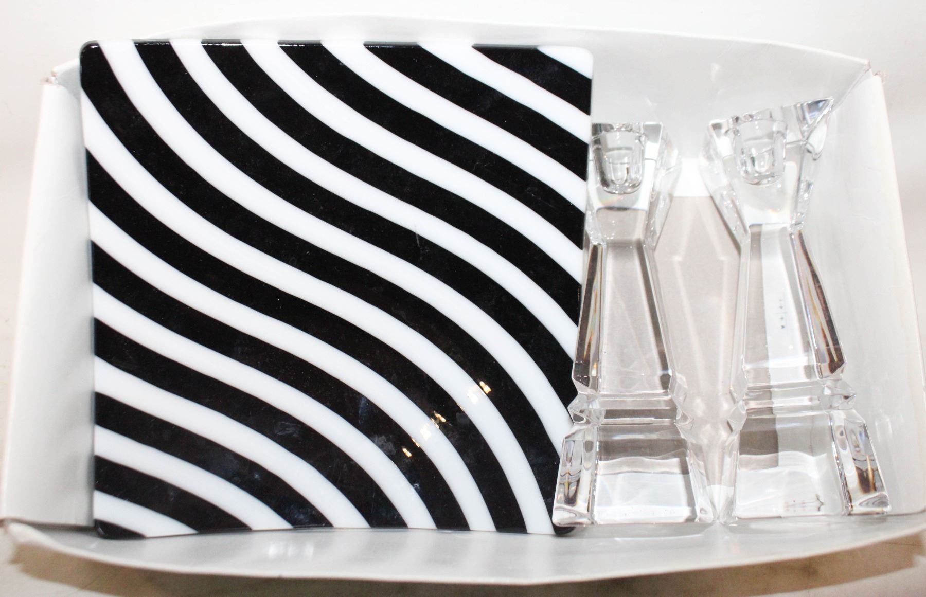 Lot 7647 PAIR OF BIRKS CRYSTAL CANDLE HOLDERS + FUSED GLASS