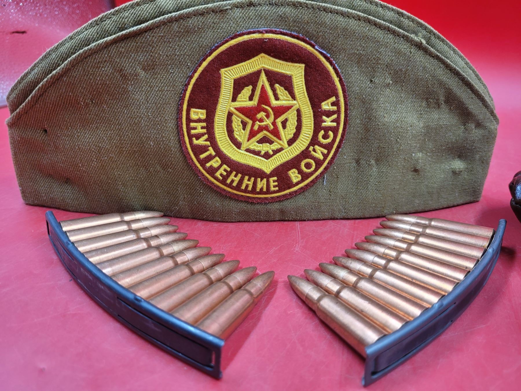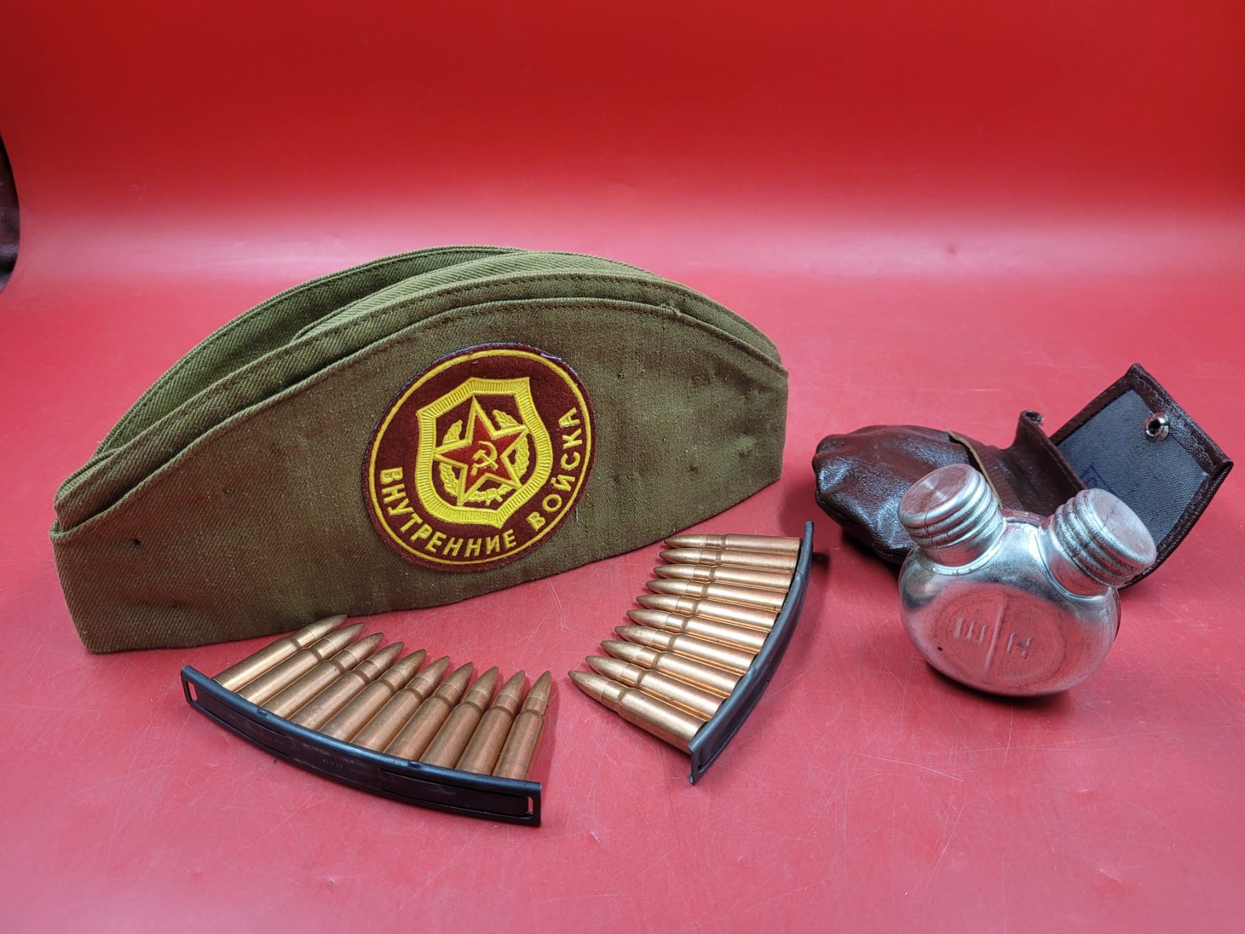Soviet Union Military Cap, Soviet Double-Compartment Oiler Bottle, & Stripper Clips