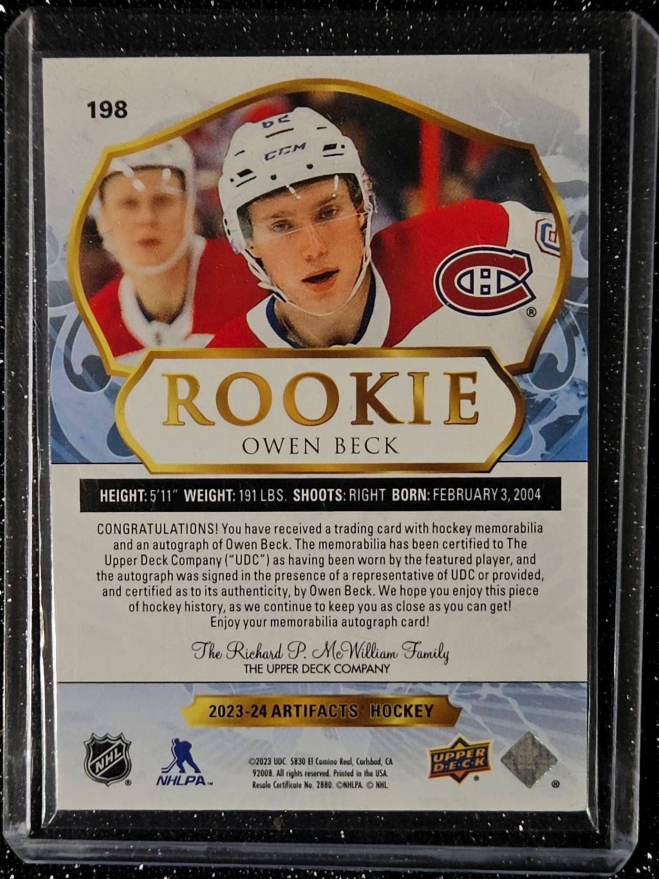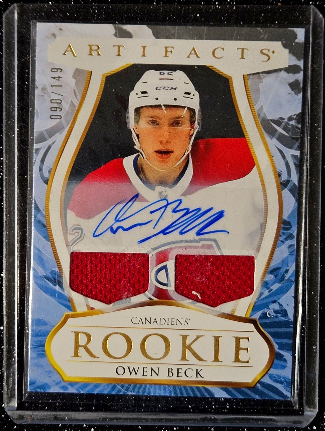 Lot 185 Owen Beck #198 - Upper Deck "Artifacts" Rookie Dual Patch Autograph Hockey Card