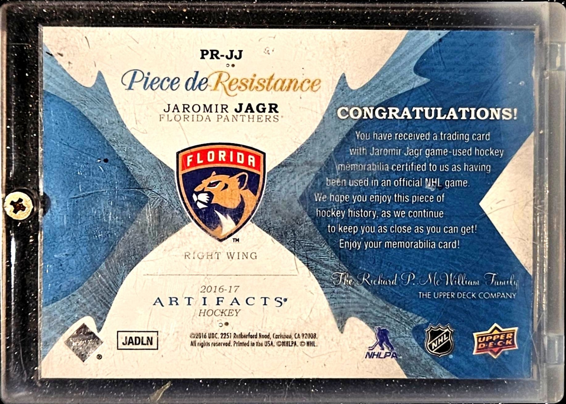 Lot 198 Jaromir Jagr 2015-16 Upper Deck "Artifacts - Piece de Resistance" Jersey Swatch Hockey Card
