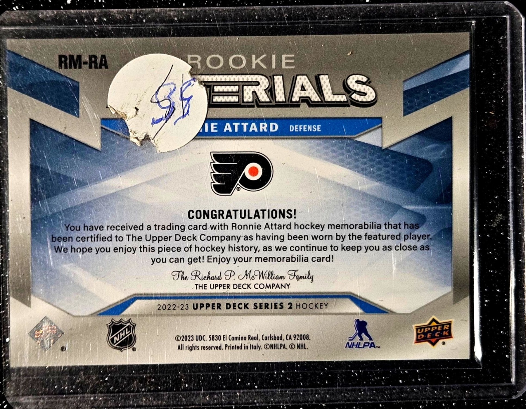 Lot 204 Ronnie Attard 2022-23 Upper Deck "Rookie Materials" Jersey Swatch Hockey Card