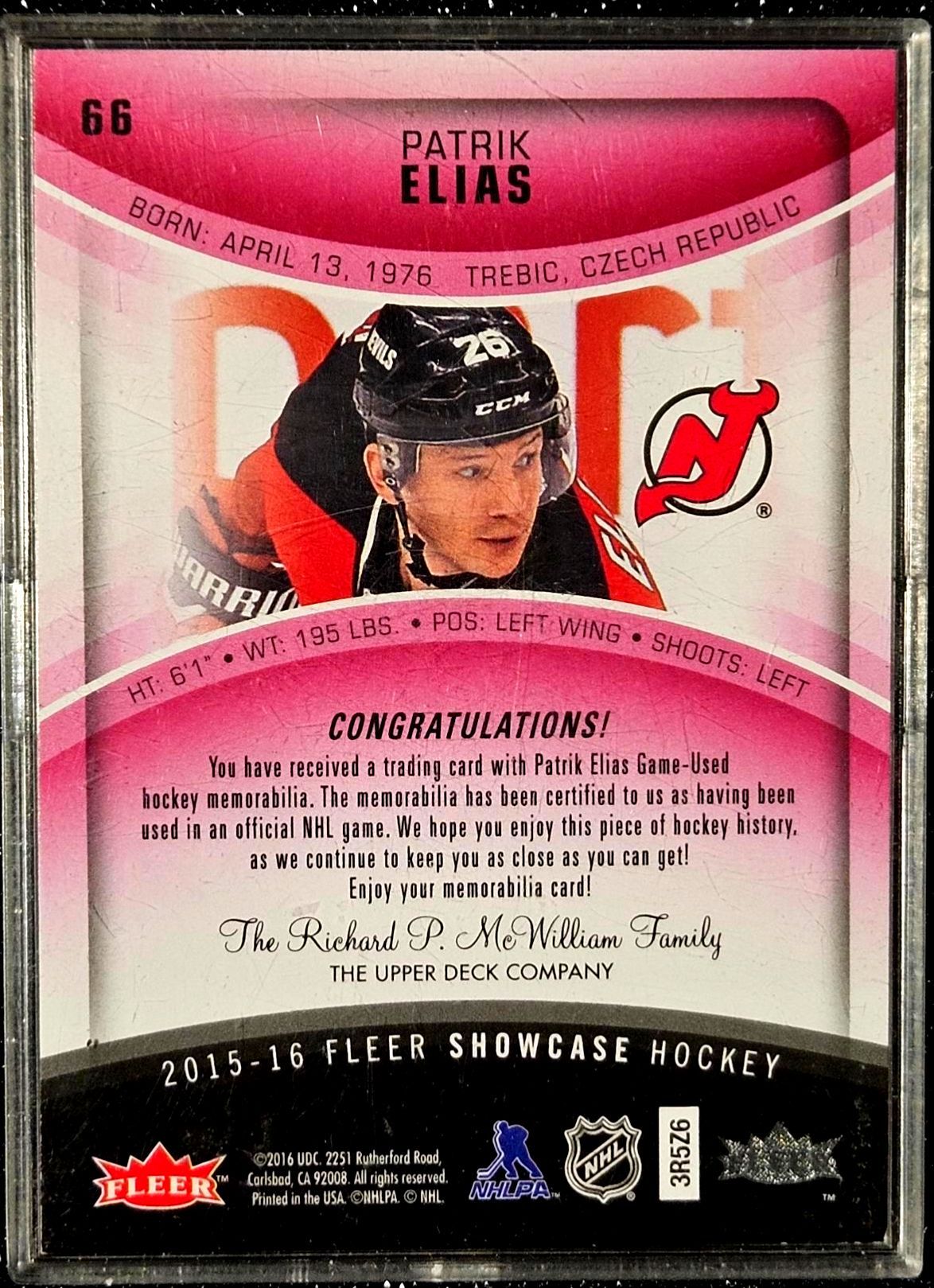 Lot 208 Patrik Eliáš 2015-16 "Fleer Showcase" Jersey Swatch Memorabilia Hockey Card